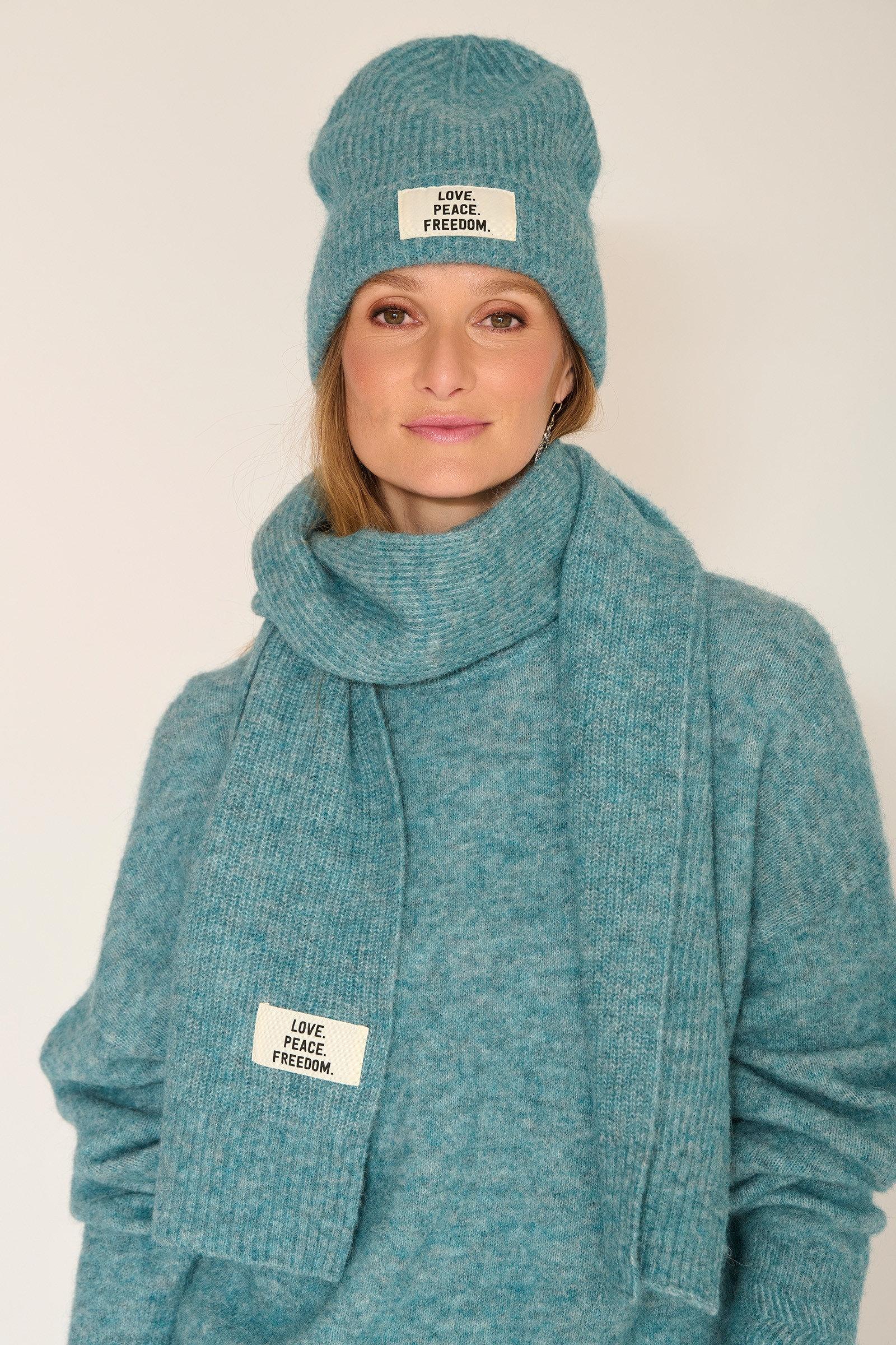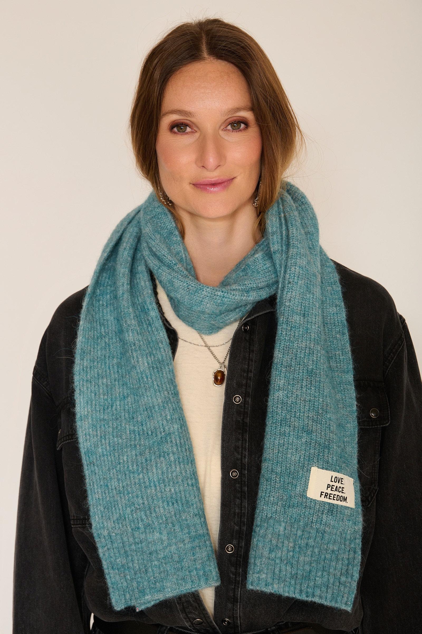 Des détails stylisés, tels que les étiquettes portant les inscriptions "LOVE", "PEACE" et "FREEDOM", ajoutent une dimension unique à ce modèle, faisant de l'écharpe FEDORA MENTHE non seulement un accessoire pratique, mais aussi un véritable élément de mode.