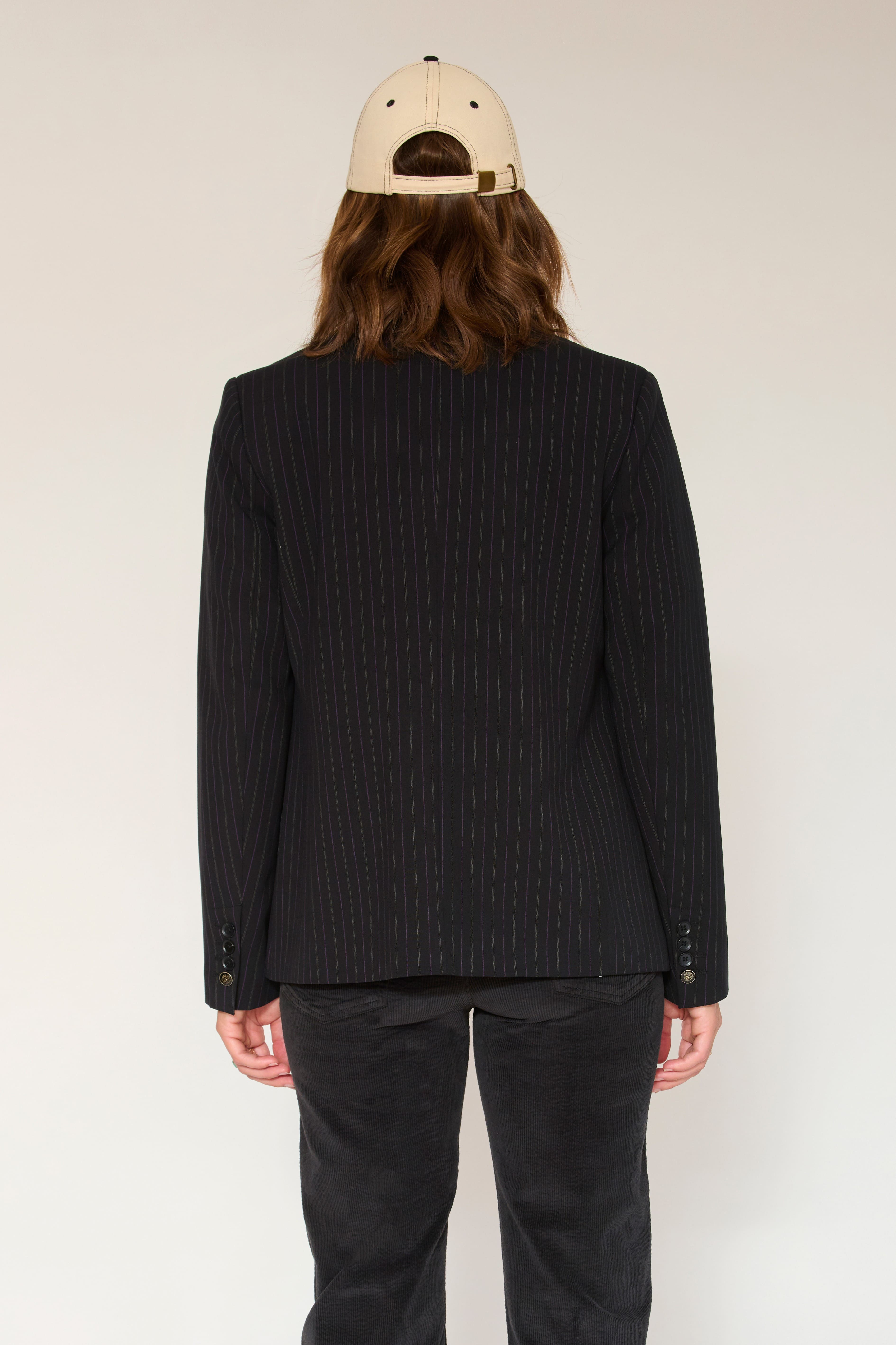 La coupe de la veste est ajustée, mettant en valeur la silhouette. Les épaules sont légèrement structurées, ajoutant une touche de sophistication. Les manches longues se terminent par des poignets soignés, souvent ornés de boutons pour un détail supplémentaire.