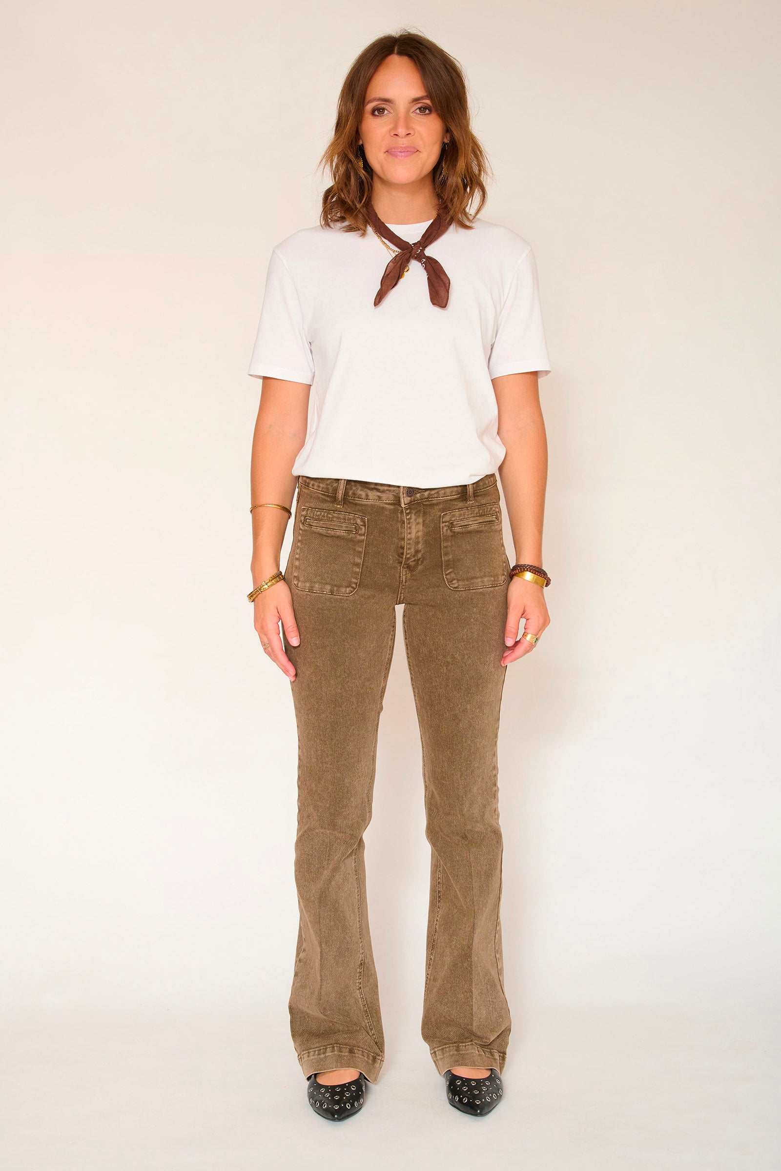 Sa teinte marron chaud apporte une touche terreuse, idéale pour créer des looks automnaux ou ajouter une note vintage à votre garde-robe moderne. Ce jean se marie facilement avec divers styles et couleurs, ce qui en fait un choix polyvalent pour toutes les occasions.