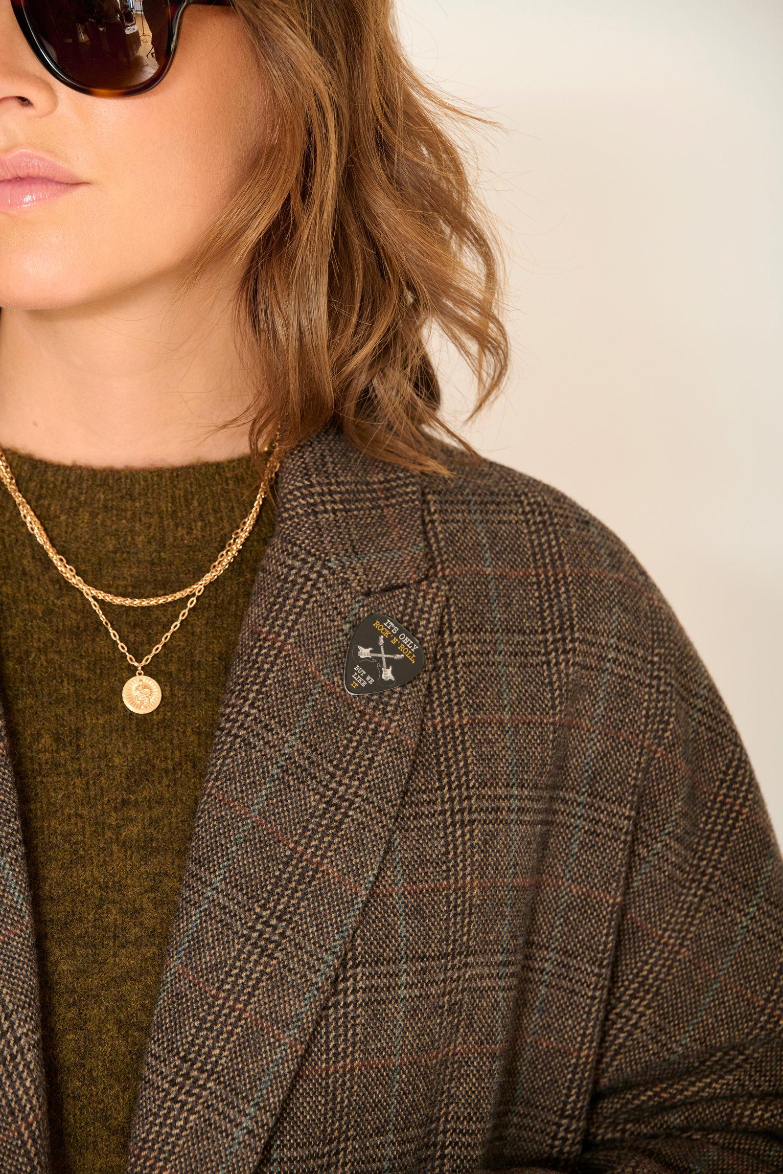 Ce manteau se distingue également par ses détails raffinés, comme un pin's décoratif sur le revers, qui ajoute une touche personnelle et originale à votre look. Il peut être facilement associé à divers styles, que ce soit pour un look décontracté ou plus habillé.