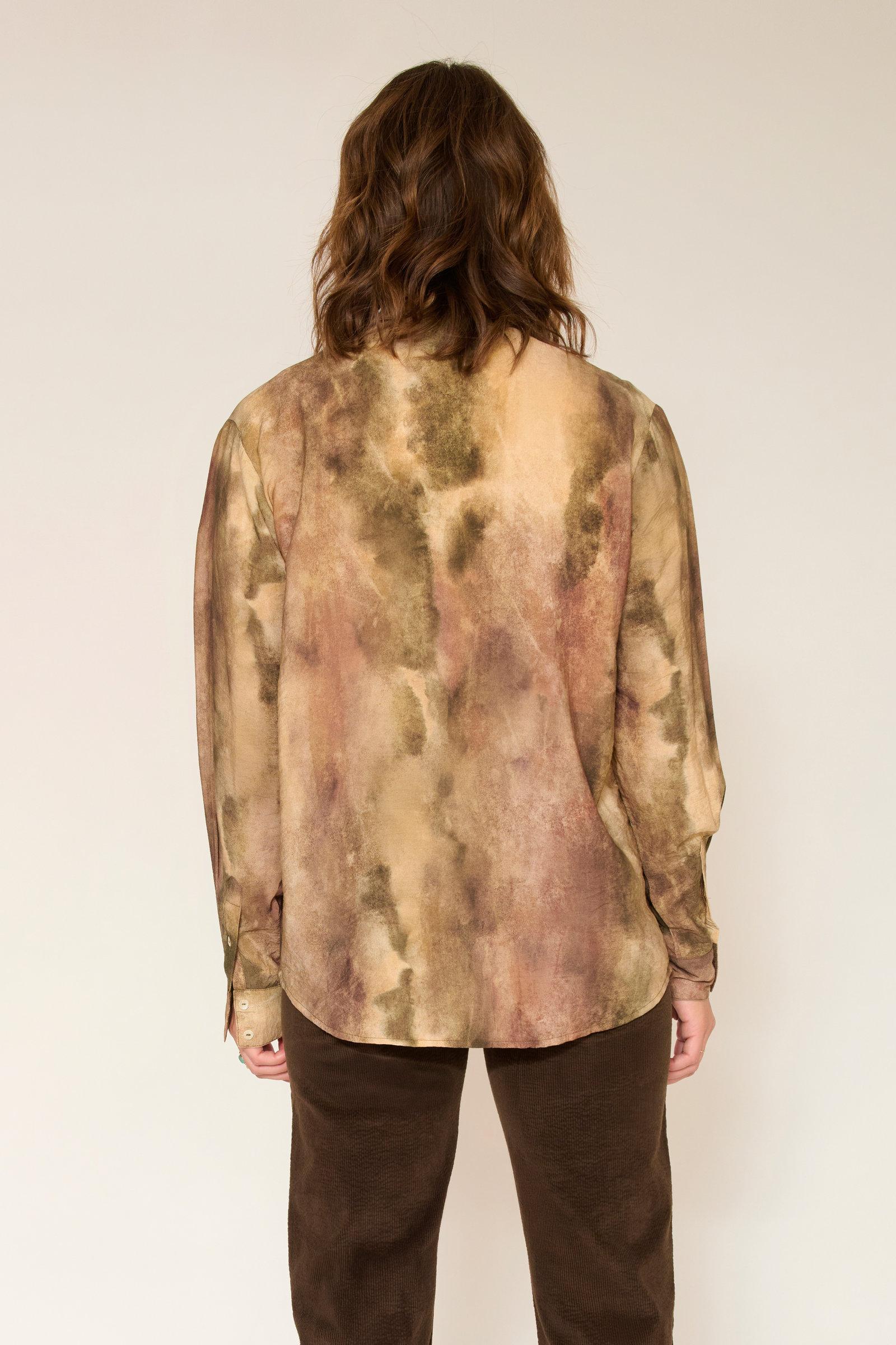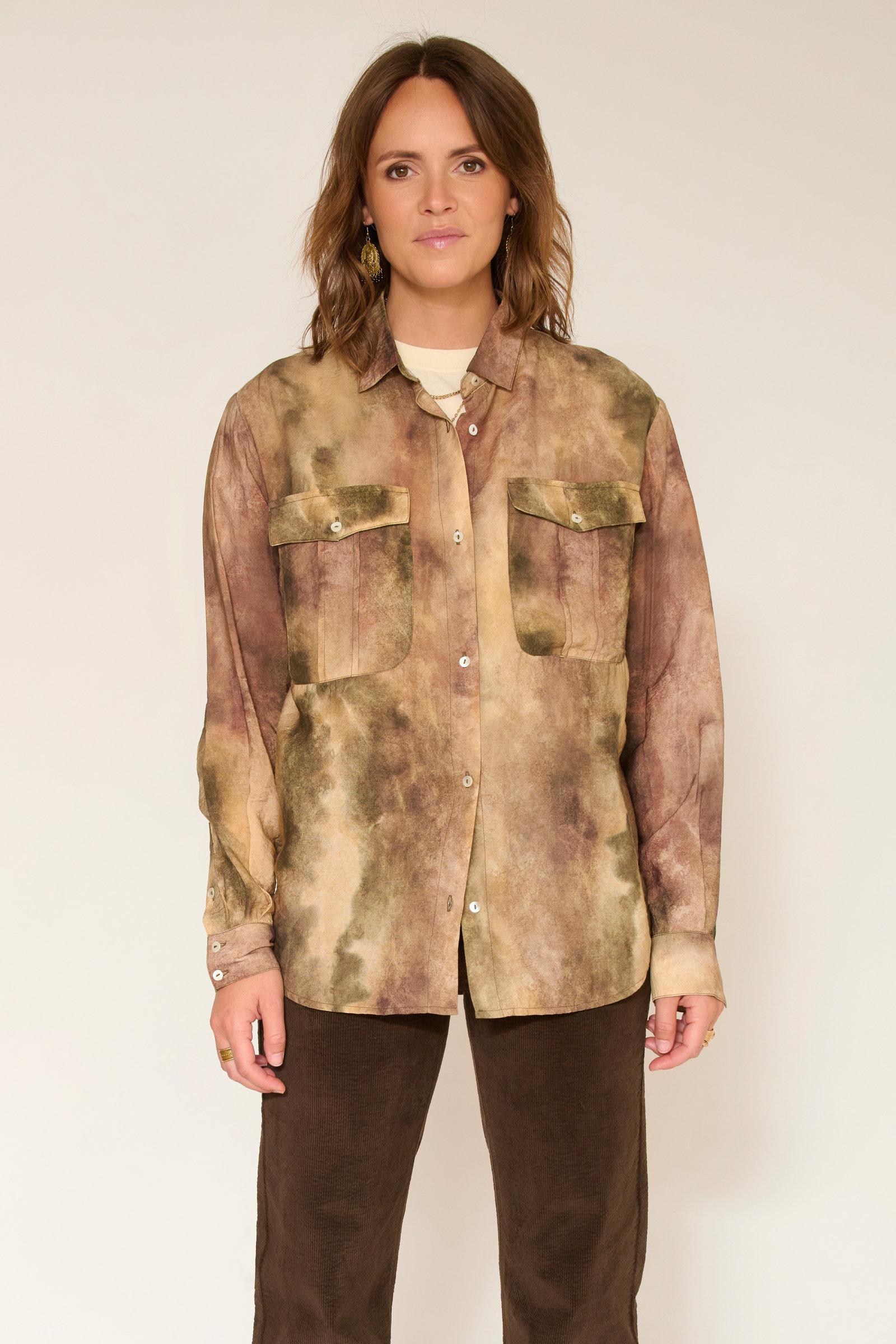 La chemise CORBELLE NUTS se distingue par son design unique et artistique, mettant en avant un motif marbré aux teintes terreuses, allant du brun au vert, créant un effet dégradé qui apporte une touche naturelle et contemporaine à votre tenue.