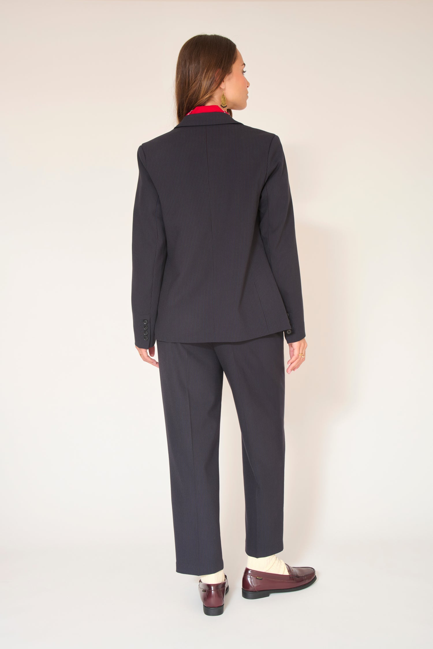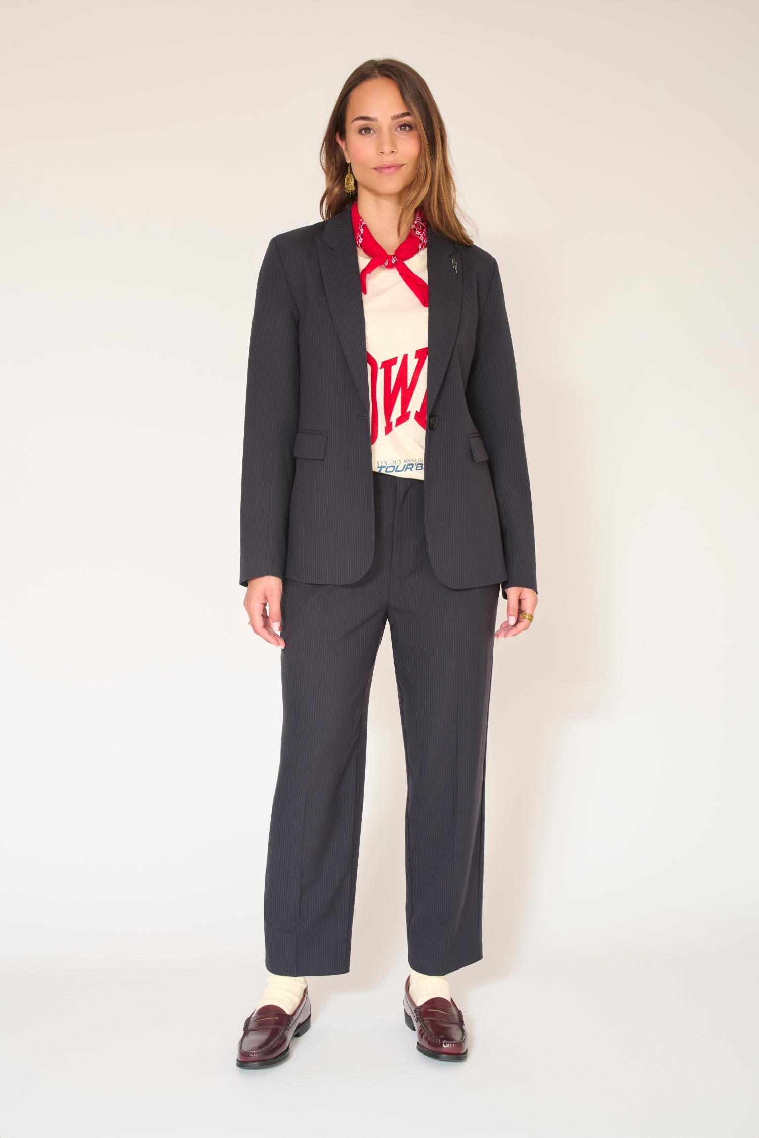 Ce tailleur navy est habillé de rayures pour un look sophistiqué sans effort. Portez-le avec le pantalon assortie PIGNA et vous aurez l’allure d’une citadine chic.