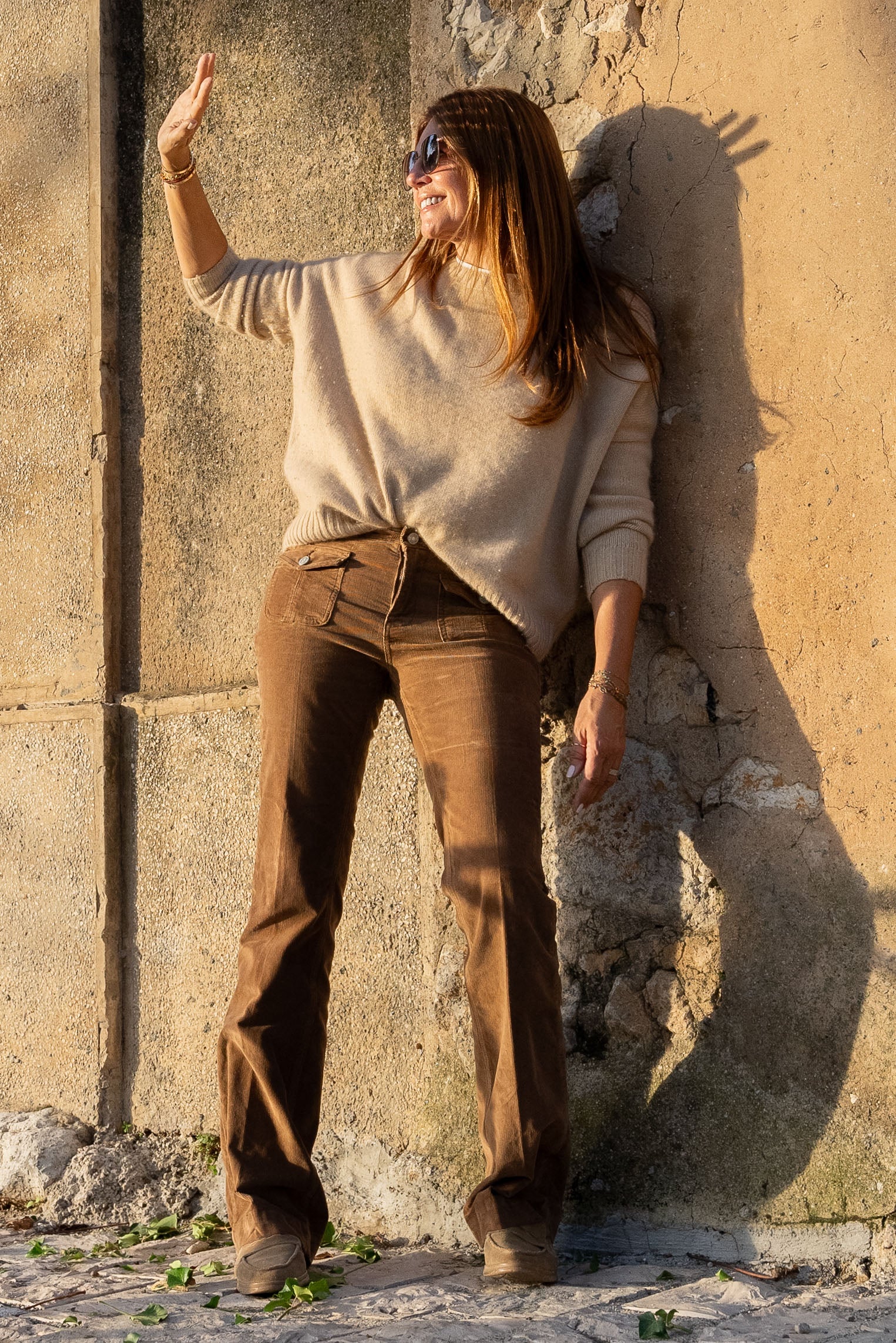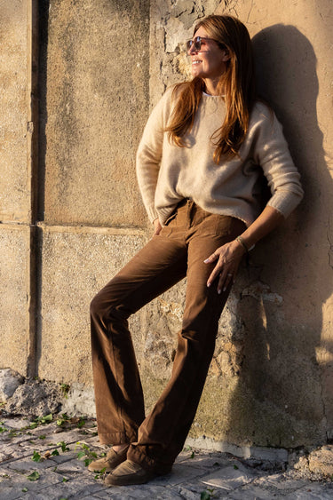 Egayez votre garde-robe avec le pantalon Veronika Tiny en tabac. Son coloris marron froid et ses poches avant allient style et praticité.