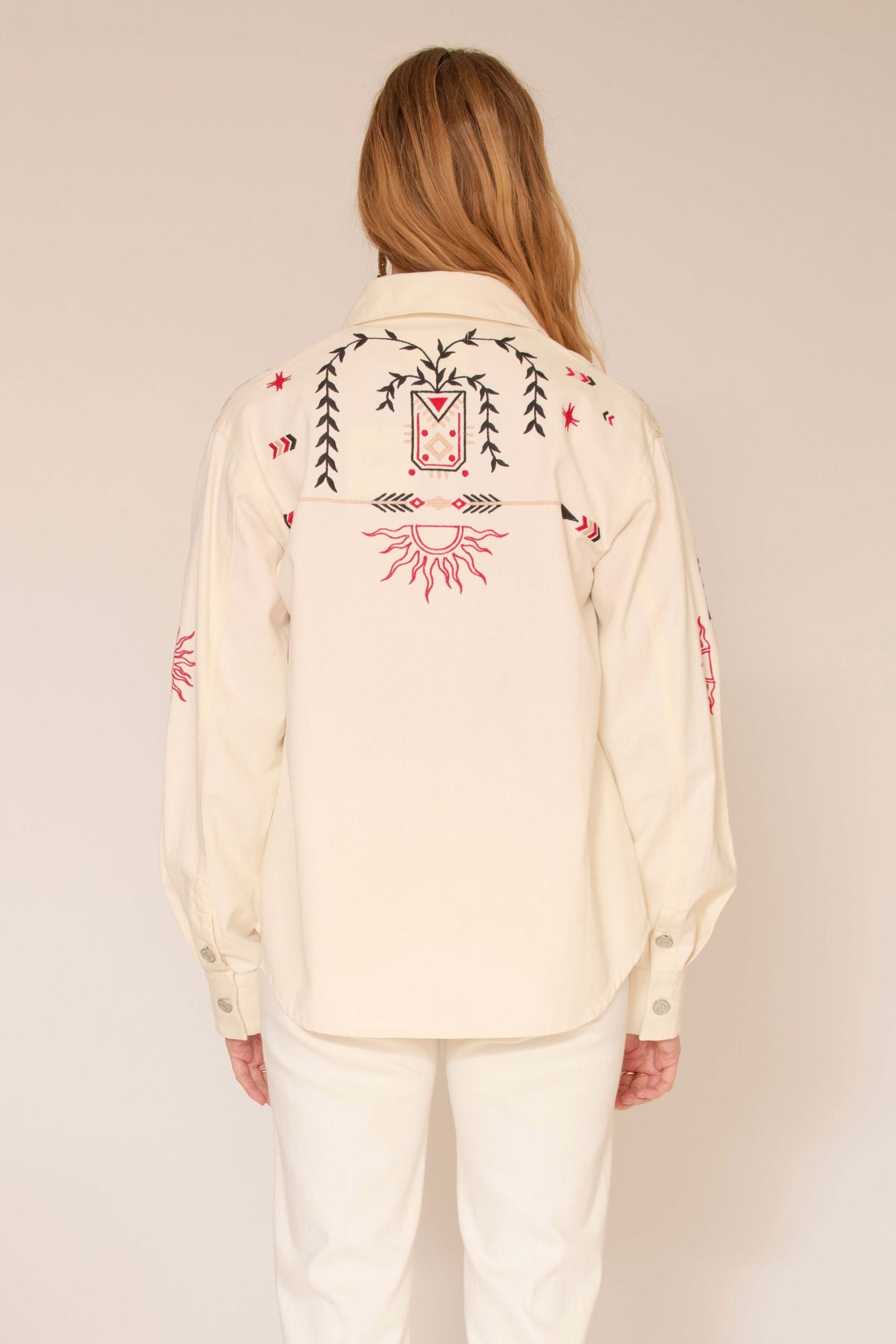 La veste chemise VOUCOU, au style Far West, se distingue par ses broderies en coton détaillées. Inspirée de l'univers western, elle combine élégance et caractère, offrant une touche d'authenticité et de modernité à vos tenues.