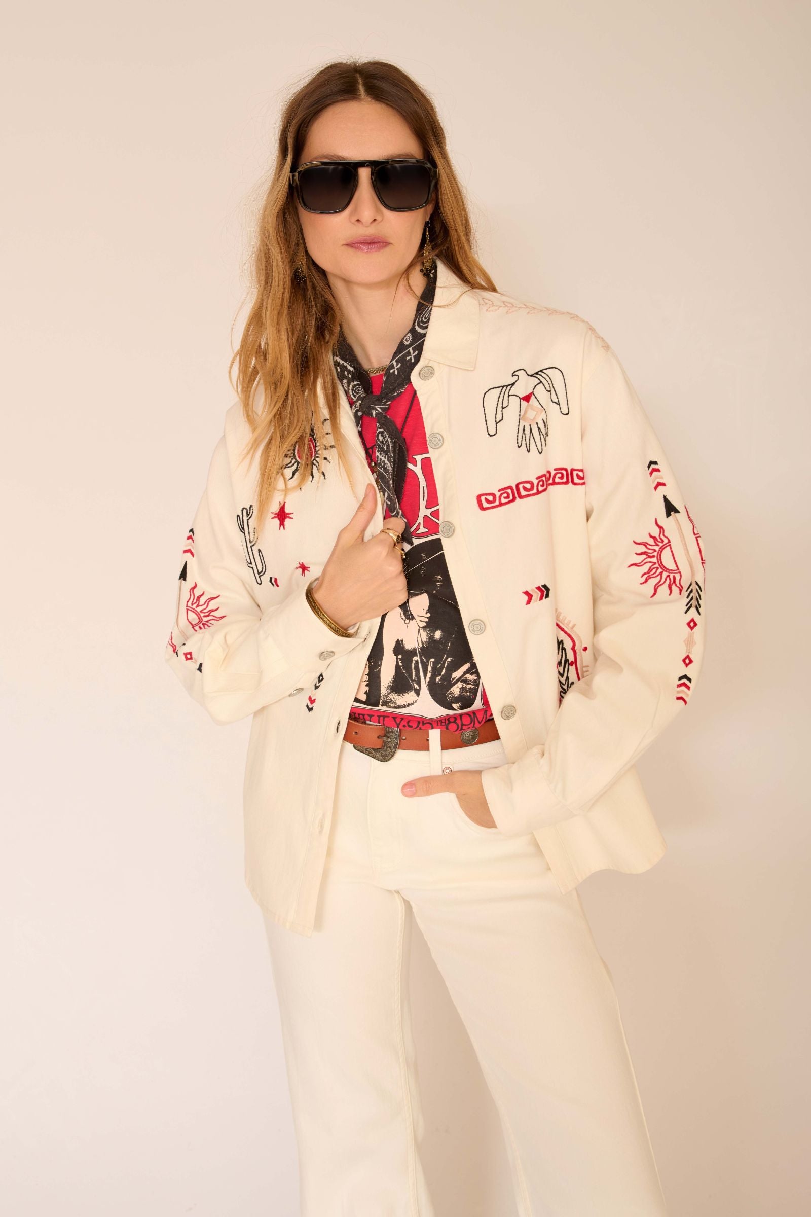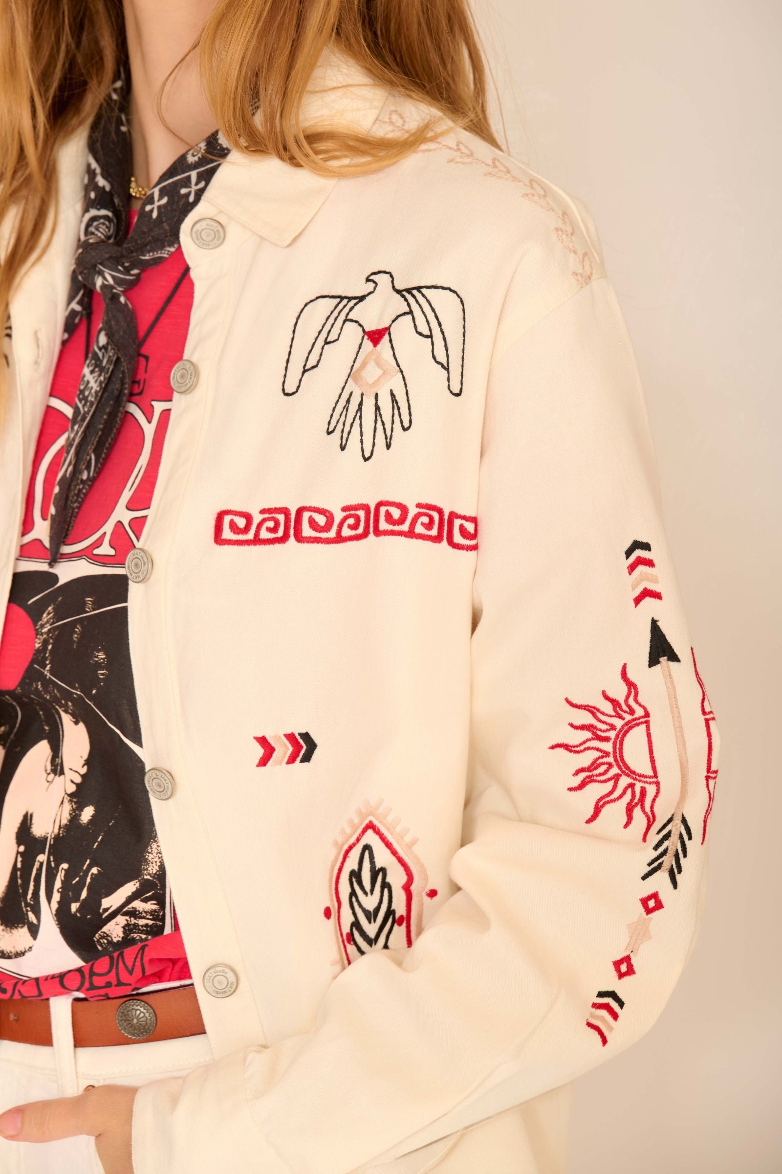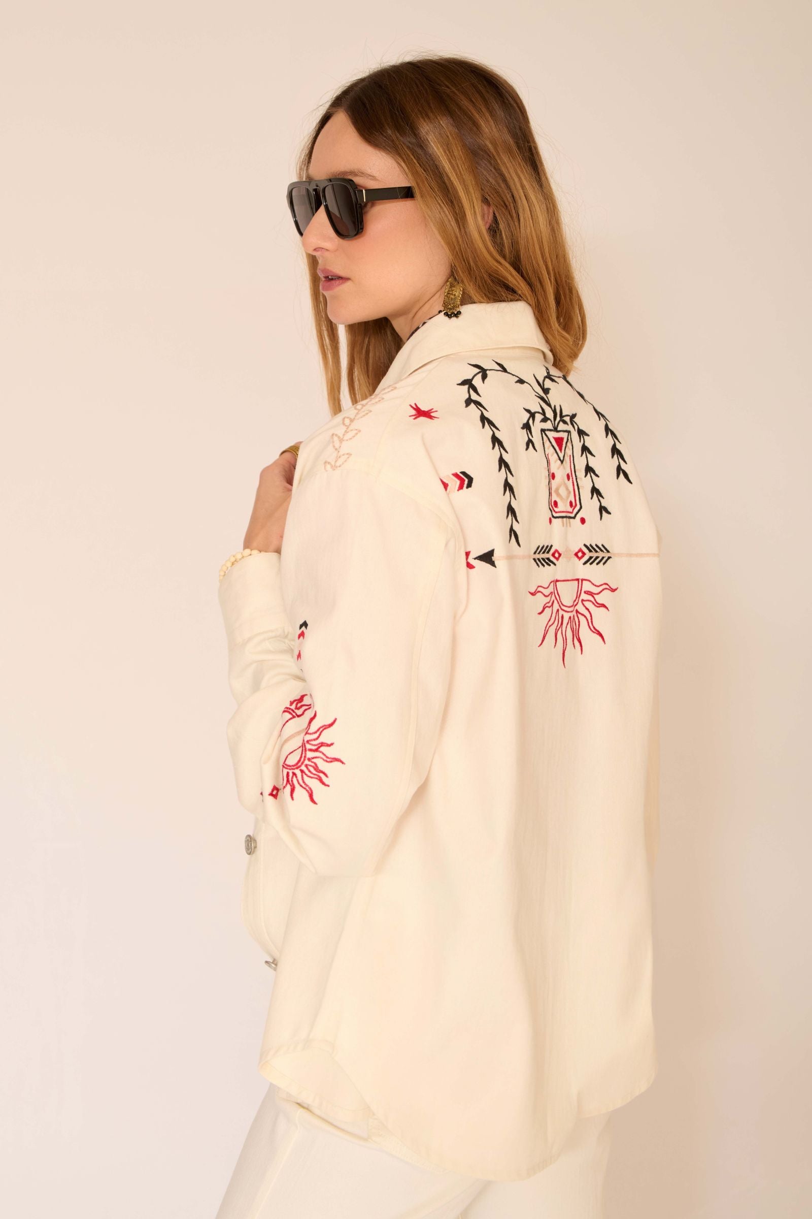 - Broderies : La veste est ornée de motifs brodés colorés, tels que des étoiles et des cactus, inspirés de la culture. Les couleurs des broderies, incluant le rouge, le noir et des touches de vert, créent un contraste intéressant avec le fond crème.