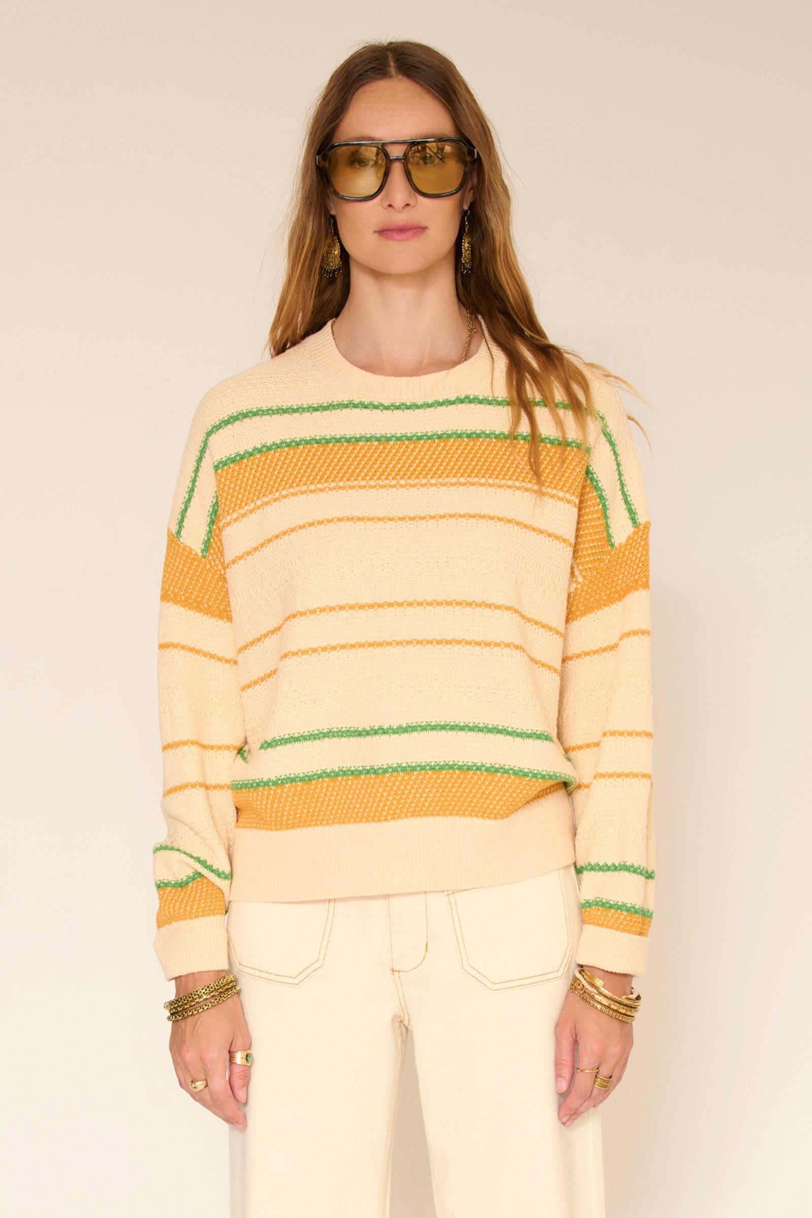 Les rayures graphiques apportent une touche de fraîcheur et dynamisent la silhouette. La maille est souple, confortable, avec un tombé naturel qui se porte facilement au quotidien. Associé à un pantalon clair ou un denim, ce pull compose une allure lumineuse, décontractée et parfaitement dans l’esprit de la saison.