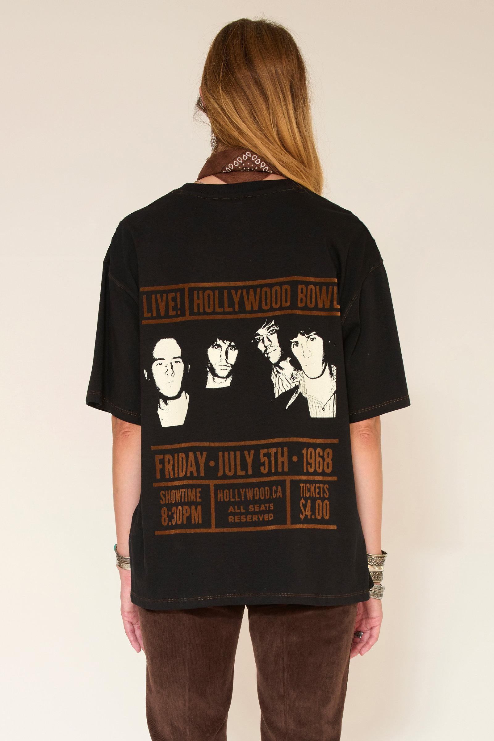 Ce modèle présente un design unique avec, sur le devant, le mot "DOORS" imprimé en lettres stylisées, ajoutant une touche graphique qui attire l'œil. À l'arrière, une illustration en couleurs beige et orange évoque des membres du groupe lors d'un concert au Hollywood Bowl en 1968, accompagnée de détails sur la date et le prix des billets, ce qui en fait un véritable objet de collection pour les fans.