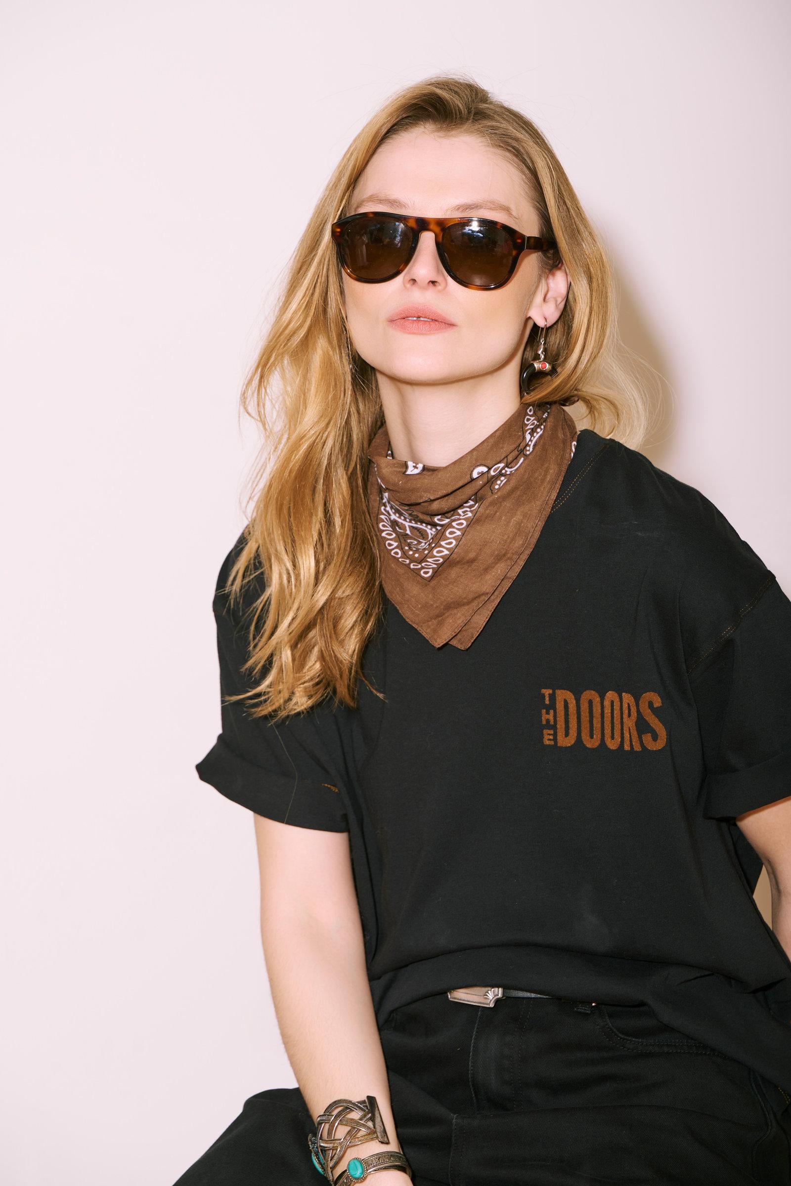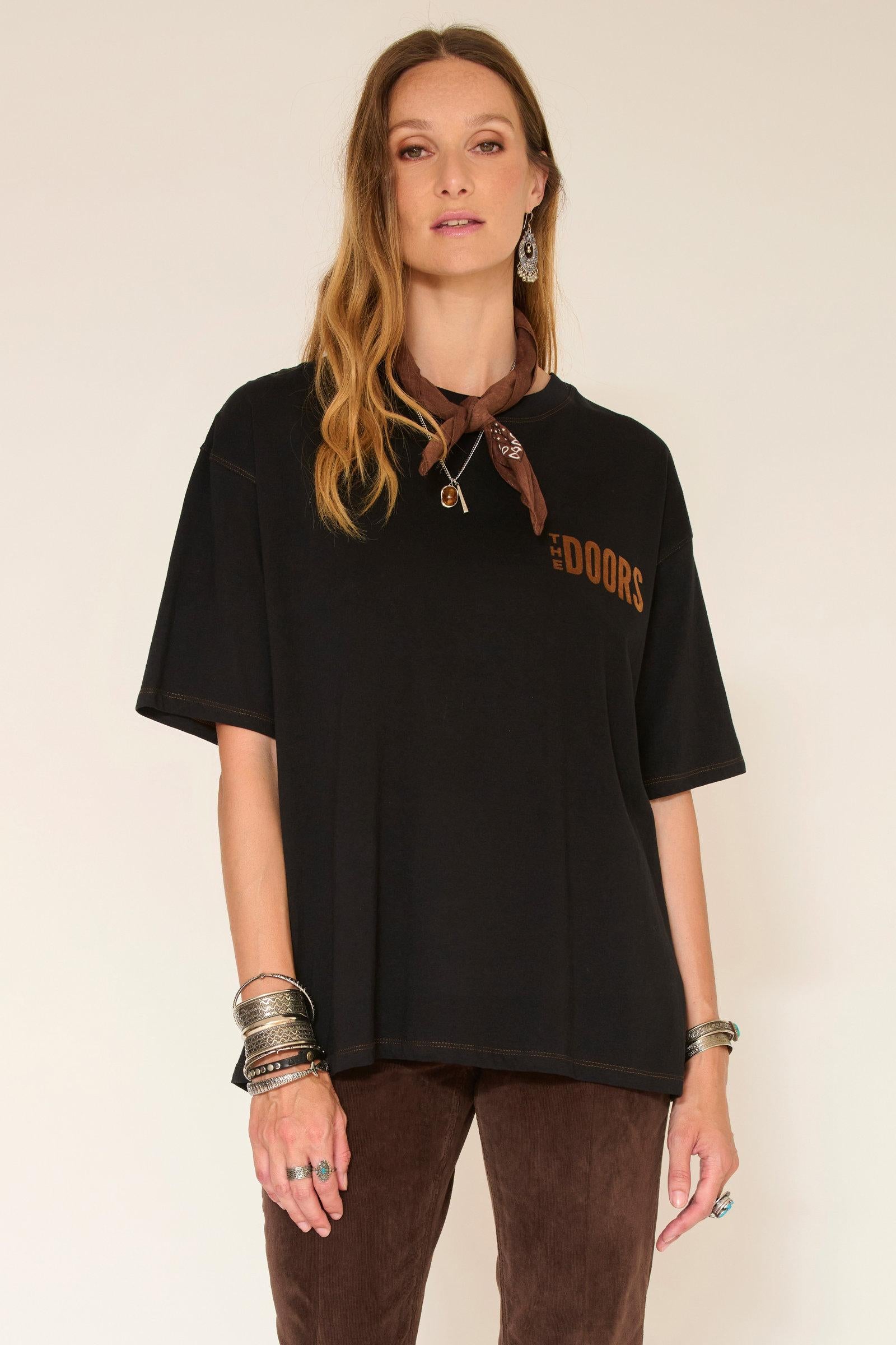 Le tee-shirt TAMINO DOORS BLACK est le choix parfait pour ceux qui souhaitent afficher leur passion pour la musique tout en restant tendance. Associez-le avec un bandana marron et des lunettes de soleil pour un style vintage réussi.