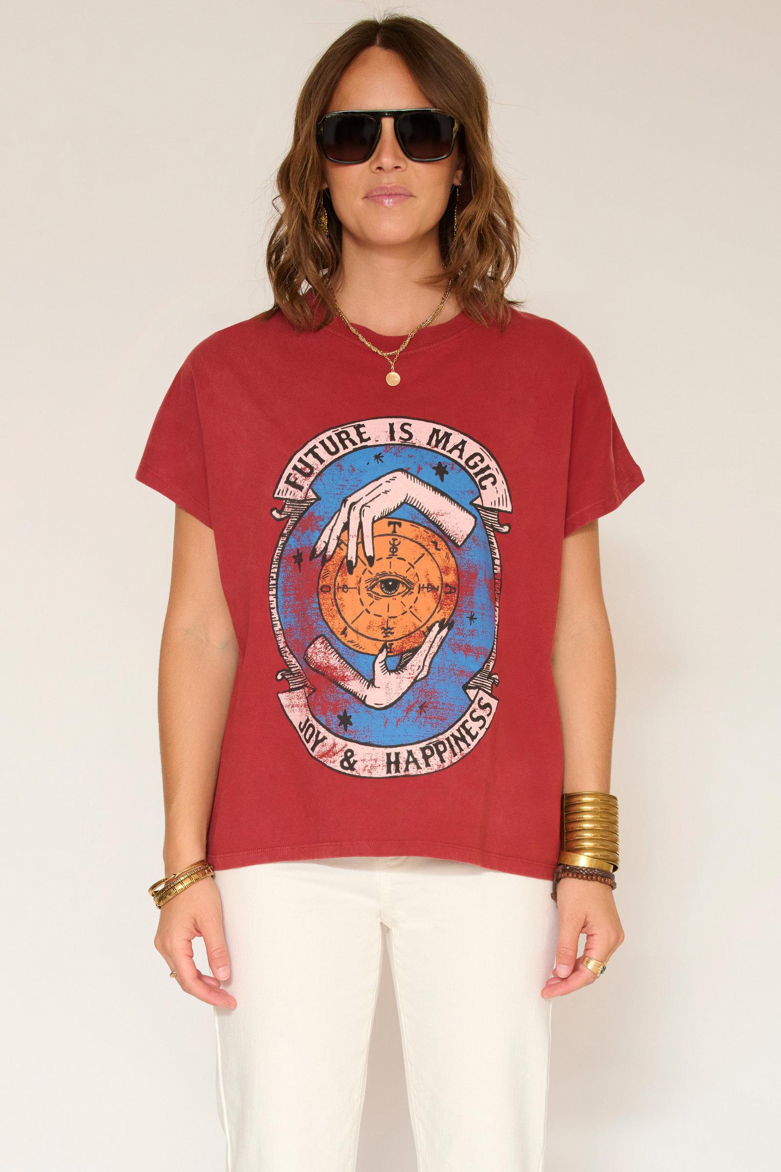 Le tee-shirt THALIA PUMPKIN se distingue par son design original et tendance, parfait pour apporter une touche chaleureuse à votre garde-robe. Sa teinte orange évoque l'automne et s'accompagne d'un motif graphique inspirant représentant une main tenant un globe, avec la phrase "Future is Magic, Joy & Happiness".