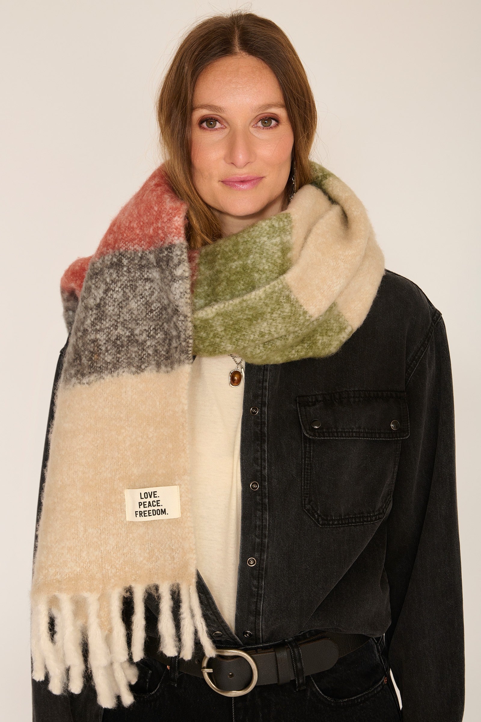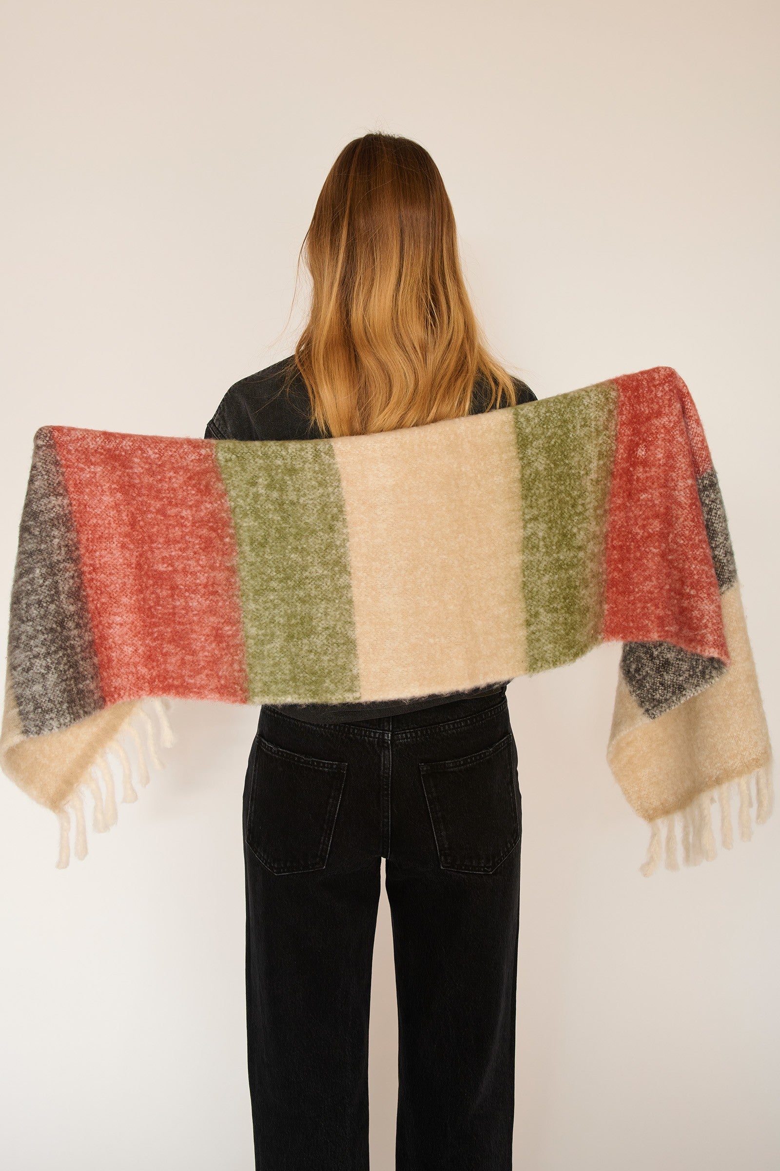 With its classic rectangular shape, the FULO MULTICO scarf can be worn in a variety of ways: wrapped around the neck, draped over the shoulders, or tied for a more stylish look. Its bold design is ideal for adding a pop of color to a simple outfit or to complete a more elaborate look.