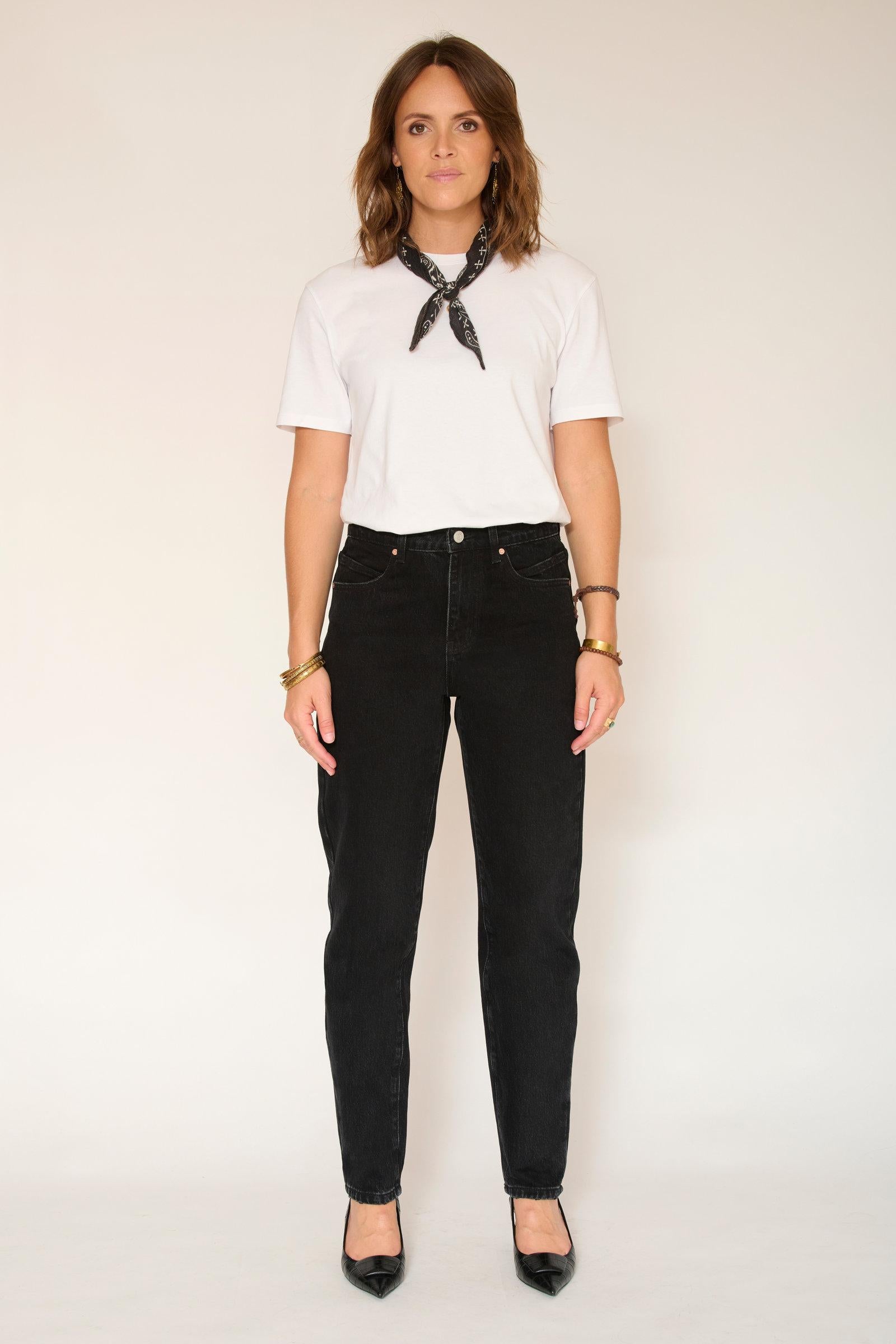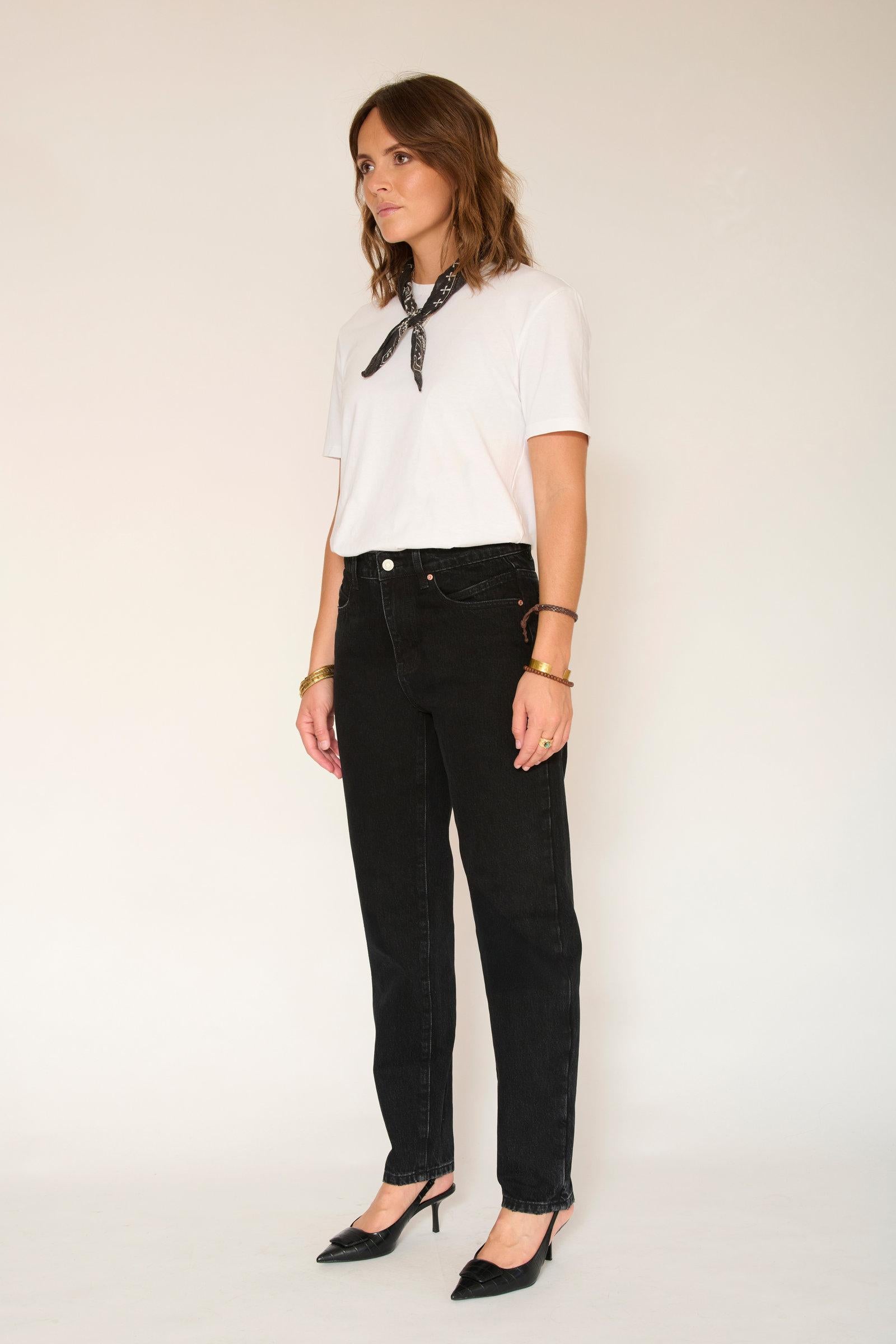 Versatile, these jeans can be combined with various styles: they go perfectly with a basic white t-shirt for a casual look or with a blouse for a more dressed-up look. In the images, the model also wears a black scarf and black stiletto heels , creating an elegant contrast with the casual style of the jeans.