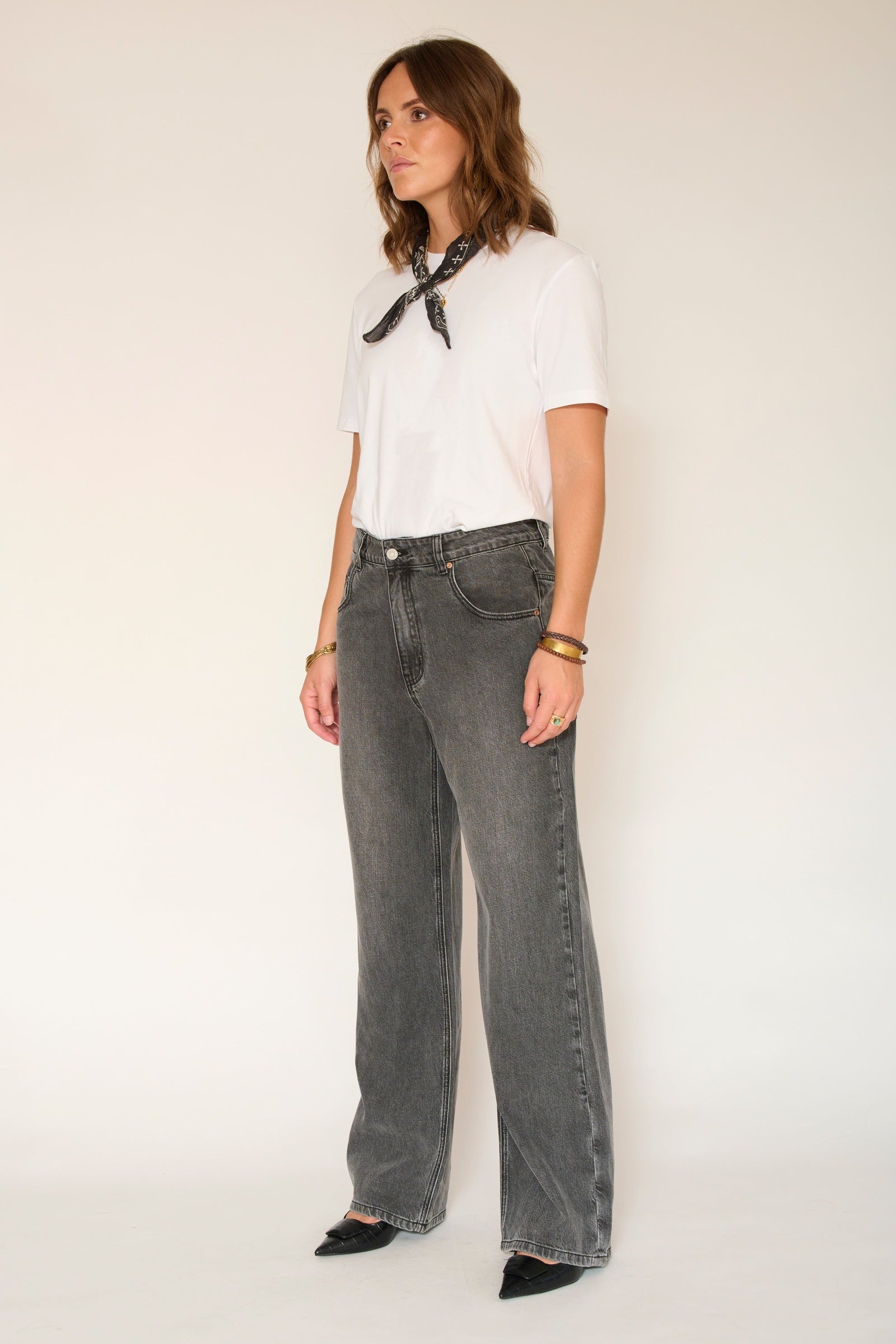 These wide-leg jeans from MKT Studio stand out with their deep black color , which gives them a stylish and versatile look. The "Starky Wash" finish adds a slight faded effect, bringing a touch of character while maintaining a modern look.