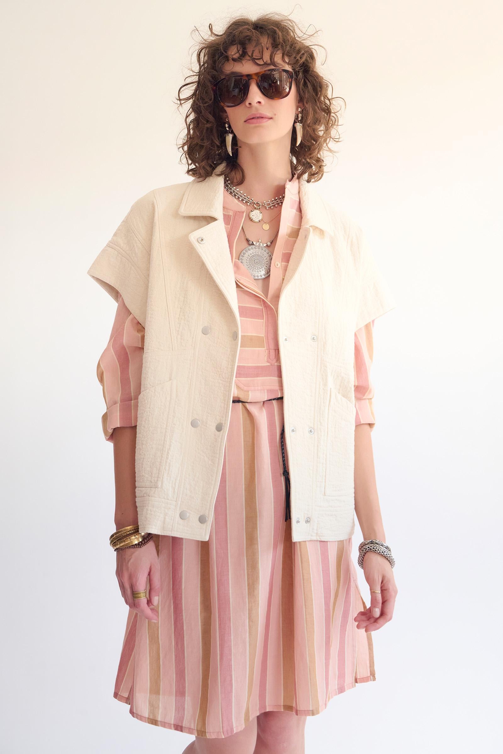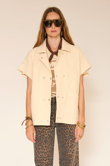 La veste Walter séduit par son esprit casual et sa silhouette épurée. Sa coupe droite à manches courtes apporte une allure moderne et facile à porter, tandis que sa matière matelassée offre une belle tenue sans alourdir la silhouette. Déclinée dans une teinte naturelle, elle se superpose aisément sur un tee-shirt ou une maille légère. La veste Walter est la pièce idéale pour apporter une touche contemporaine et décontractée à vos looks de saison.