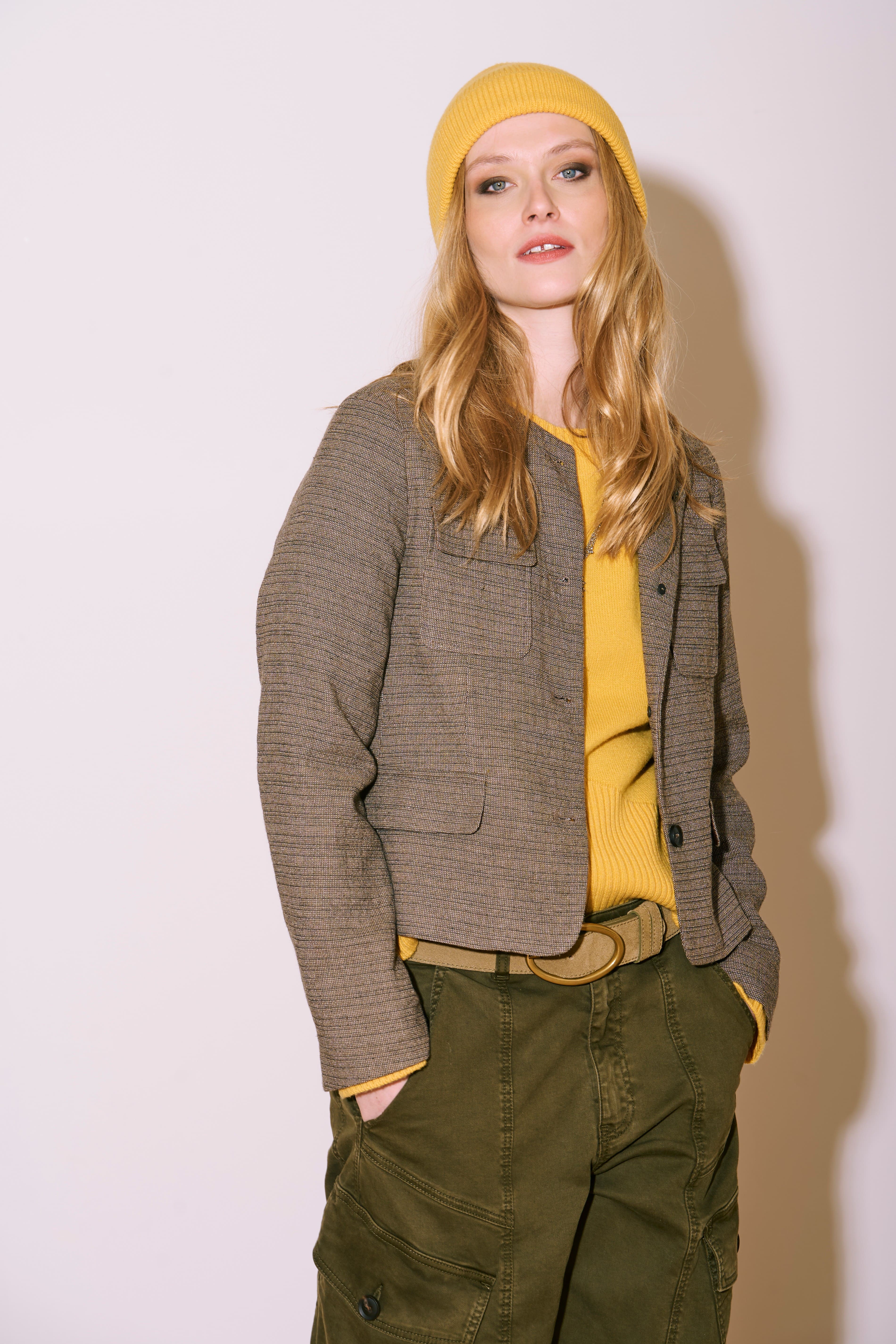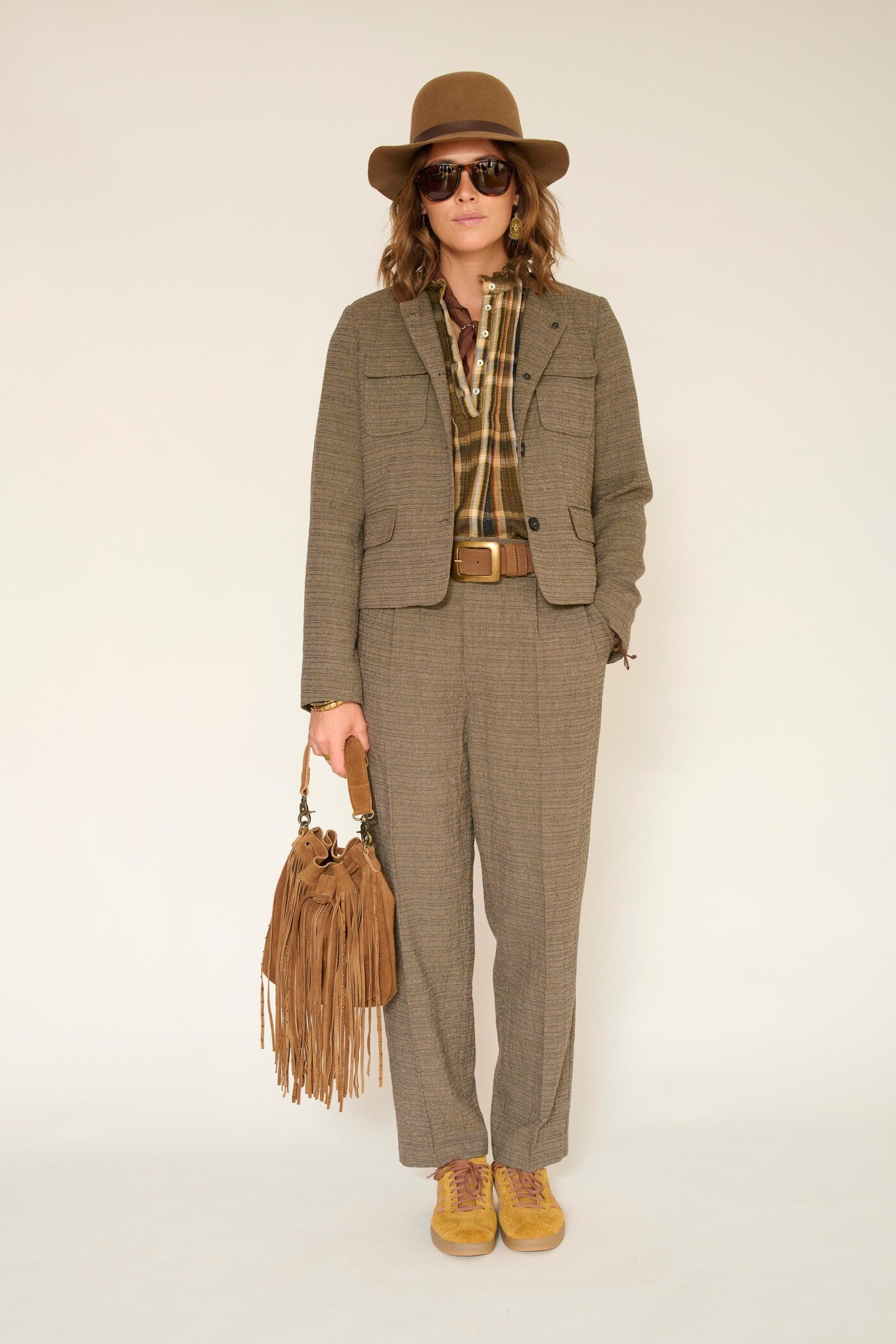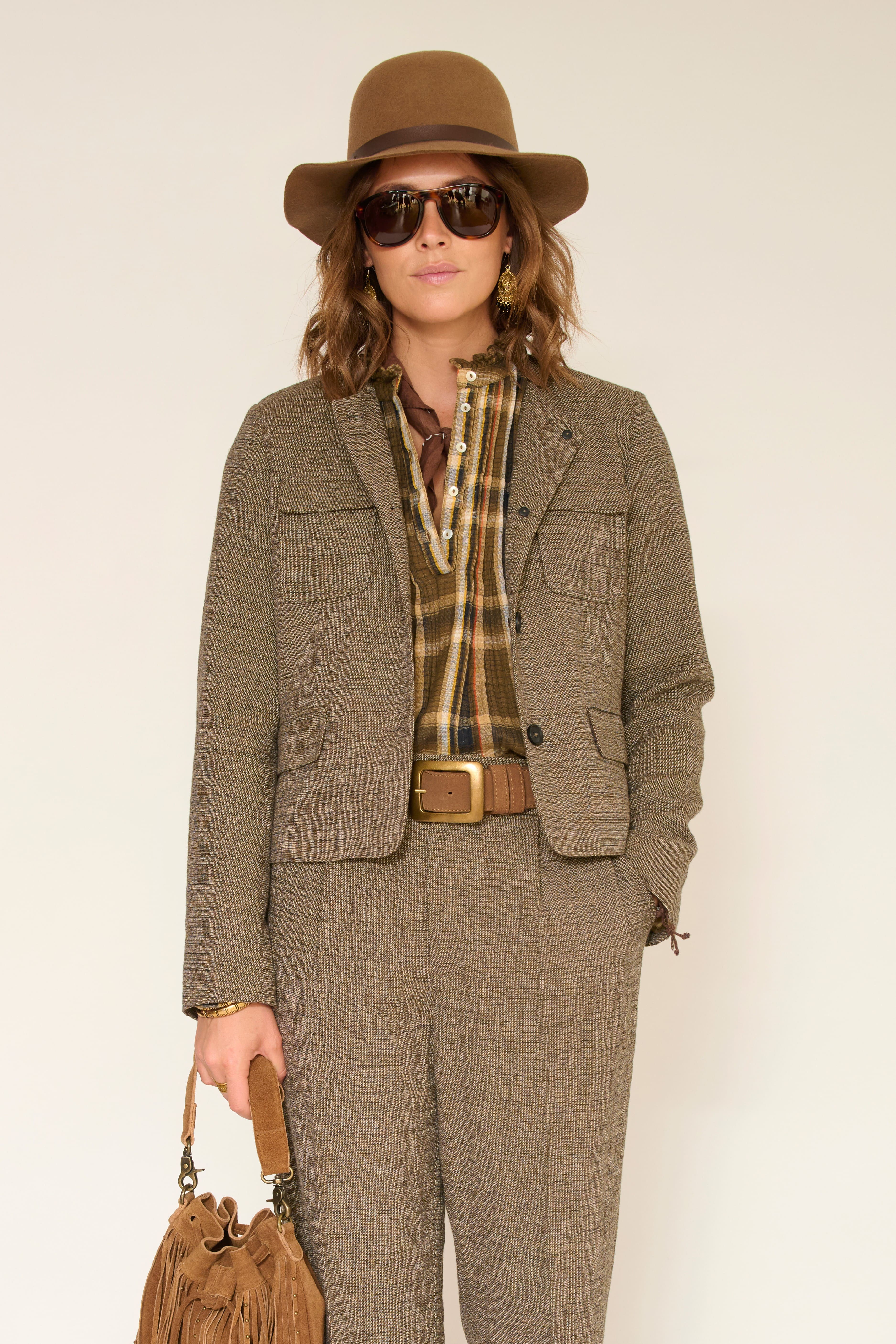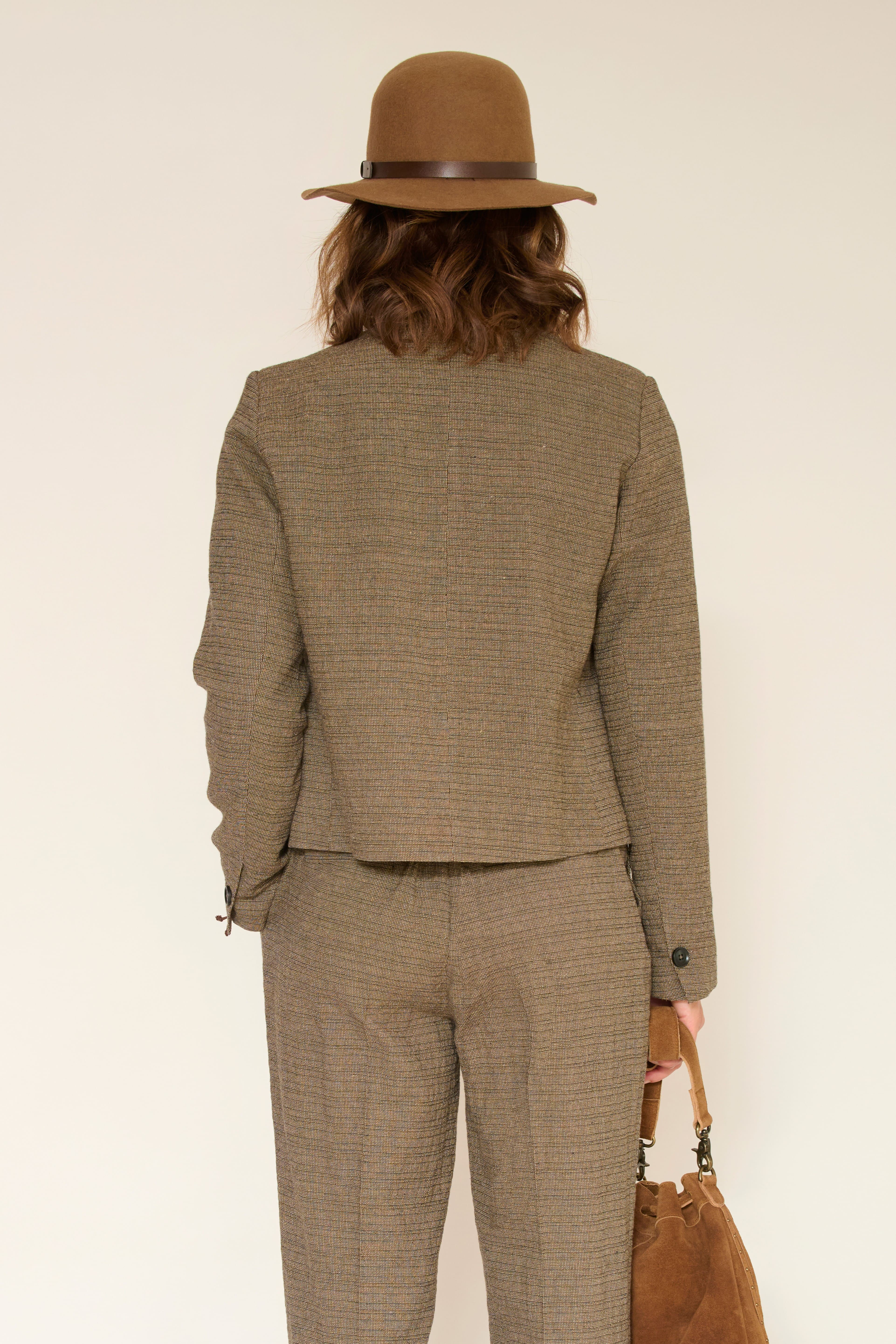 The details of this jacket are carefully crafted, with neat finishes such as elegant buttons and discreet pockets. This style is designed to be versatile, allowing it to be paired with matching trousers for a complete look or with jeans for a more casual outfit.