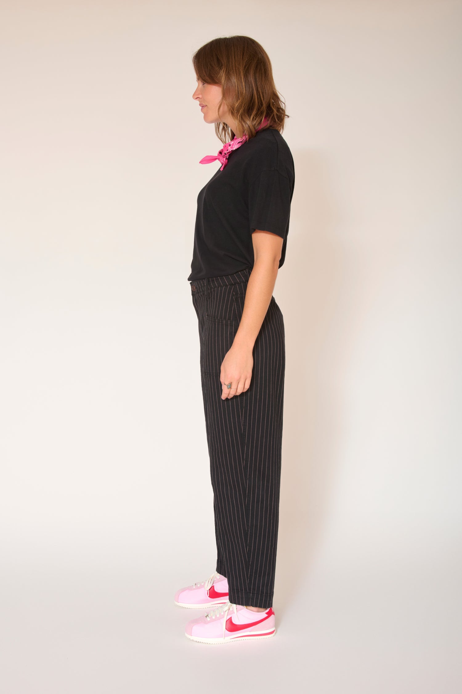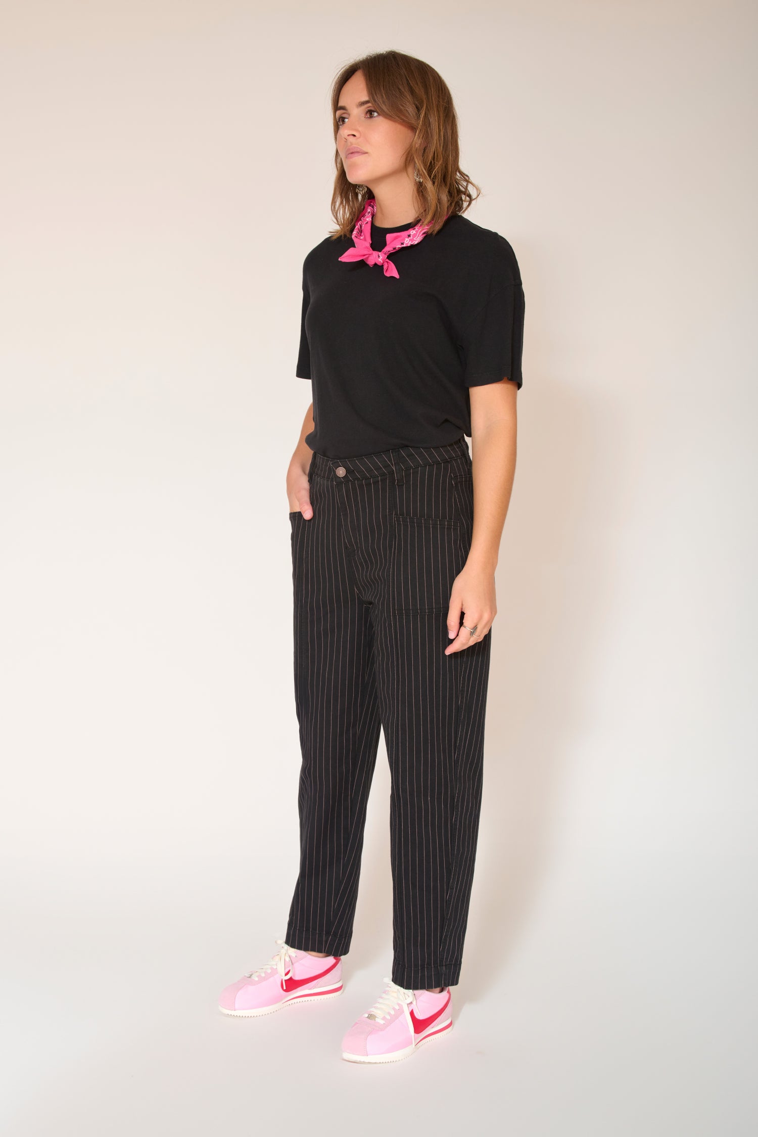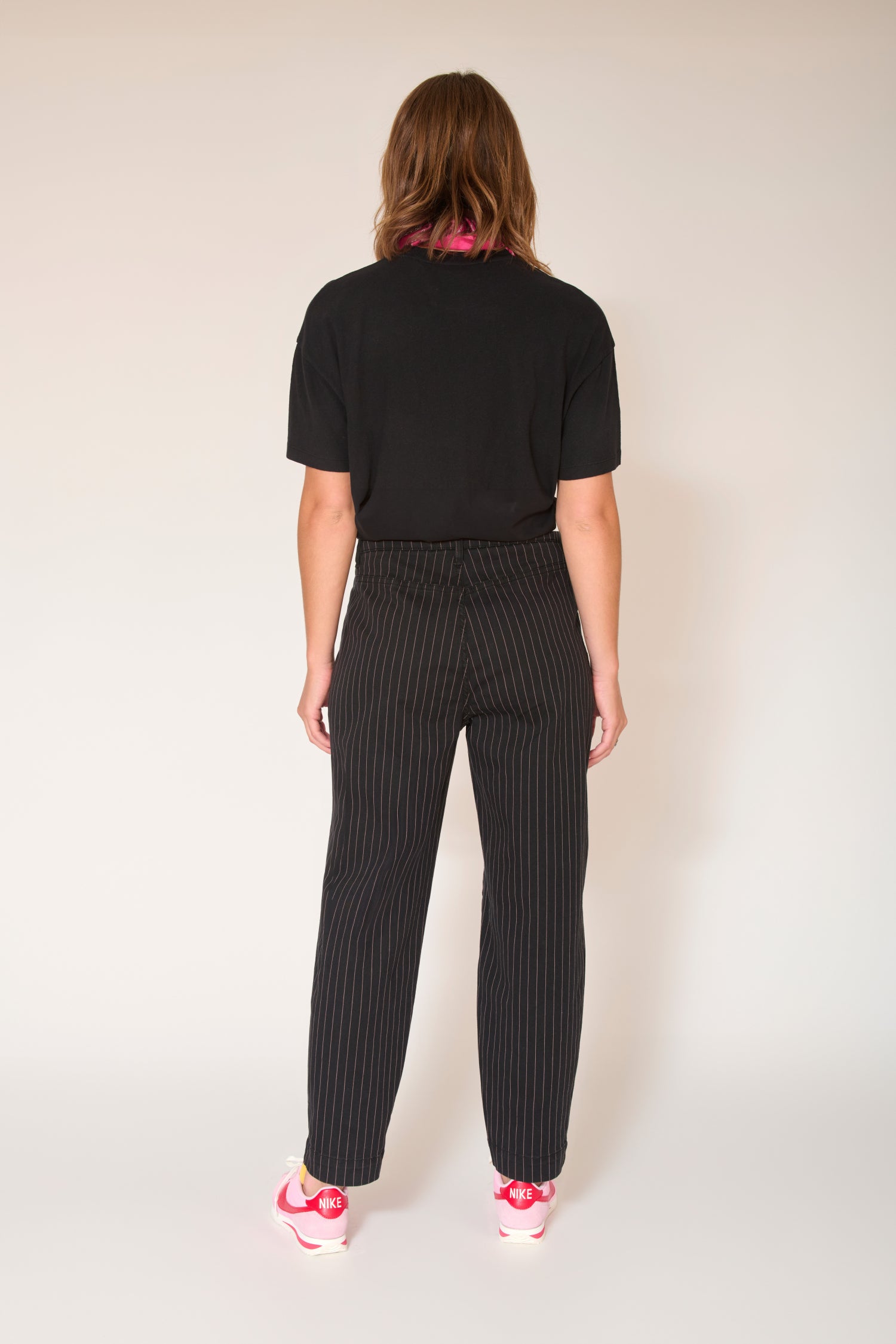 The PORTLAND pants are pleasant to wear, as they are made from pure cotton. Black with stripes, they're easy to match for everyday looks. Decorated with two large patch pockets, they also feature two marked pleats along the legs to elongate your silhouette and enable you to create casual outfits.