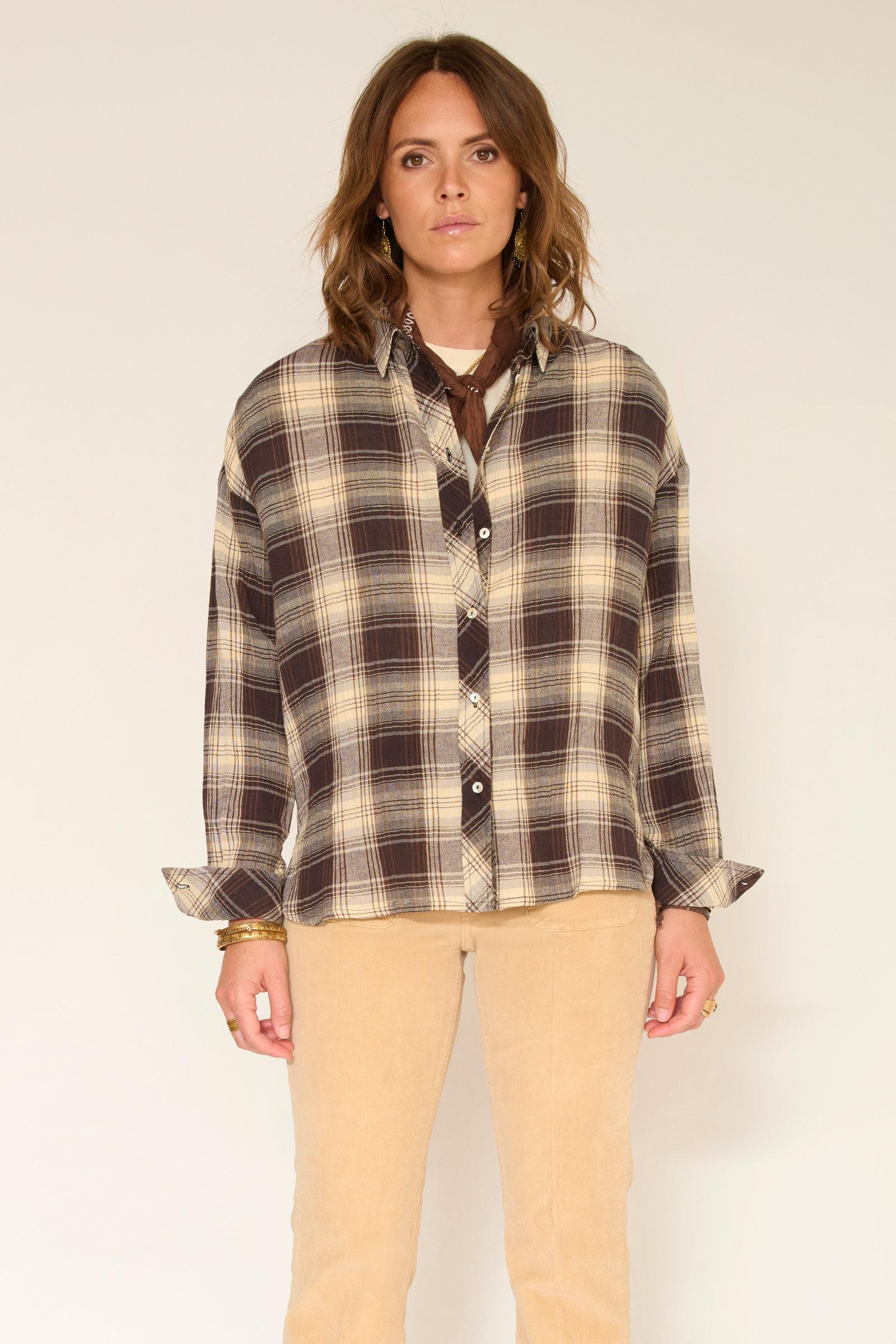 The CHALOU CHECKS shirt is a perfect choice for those looking for a piece that is both elegant and casual. With its check pattern in shades of brown, cream and beige , it brings a warm and autumnal touch to your wardrobe.