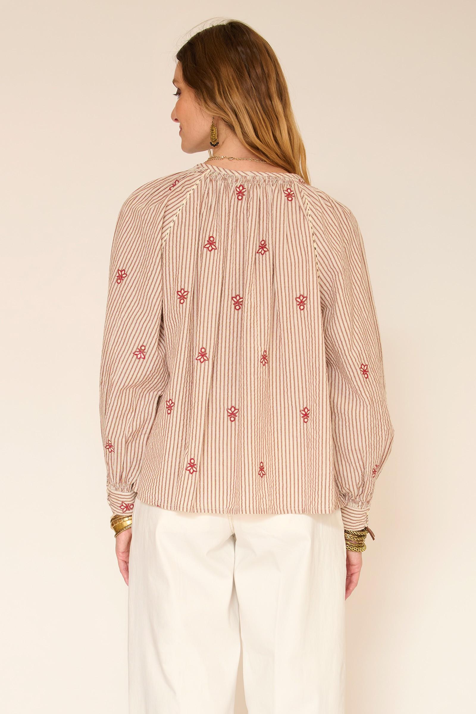 La coupe est fluide, légèrement ample, avec une encolure ouverte qui allège la silhouette et des manches souples qui accompagnent le mouvement.