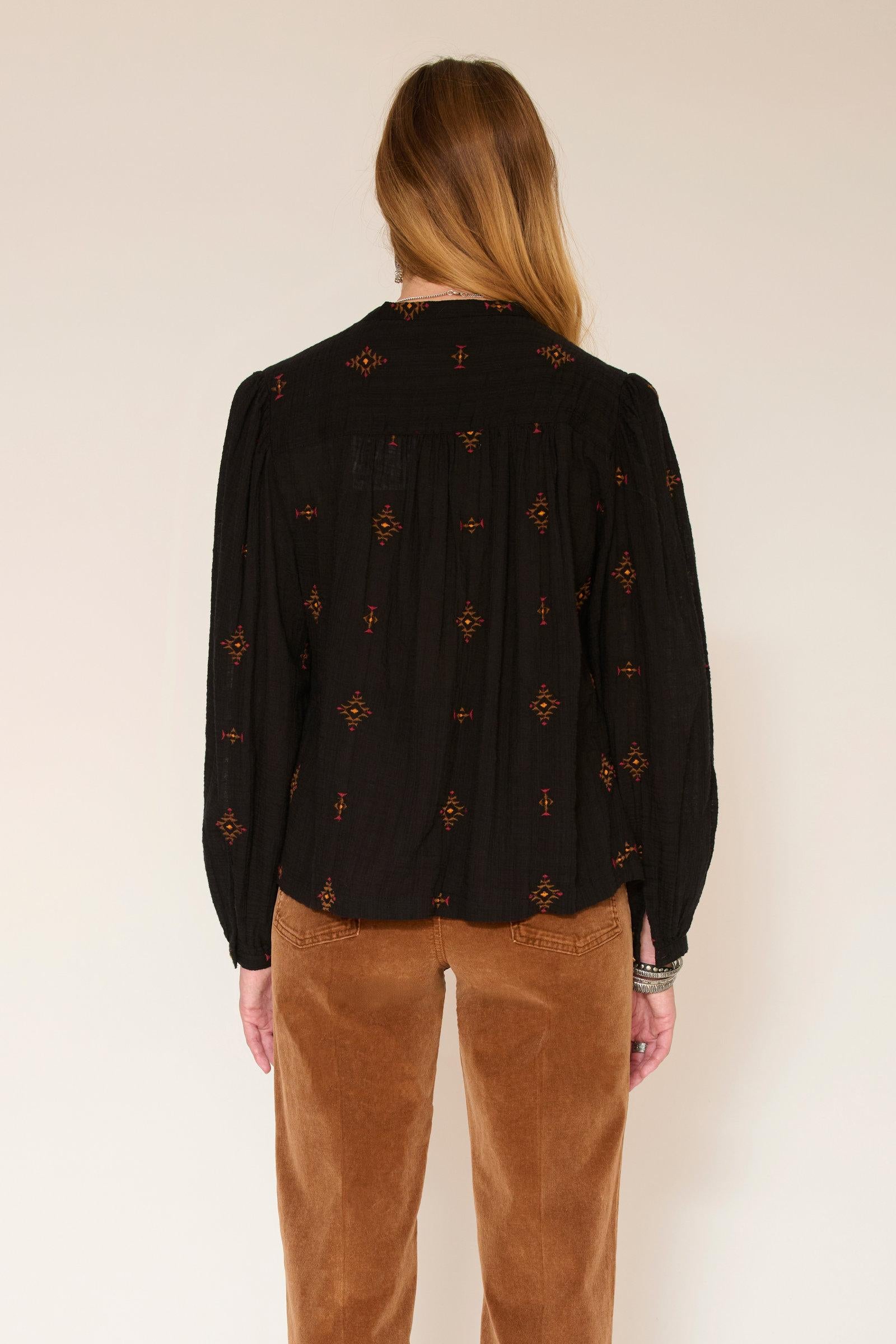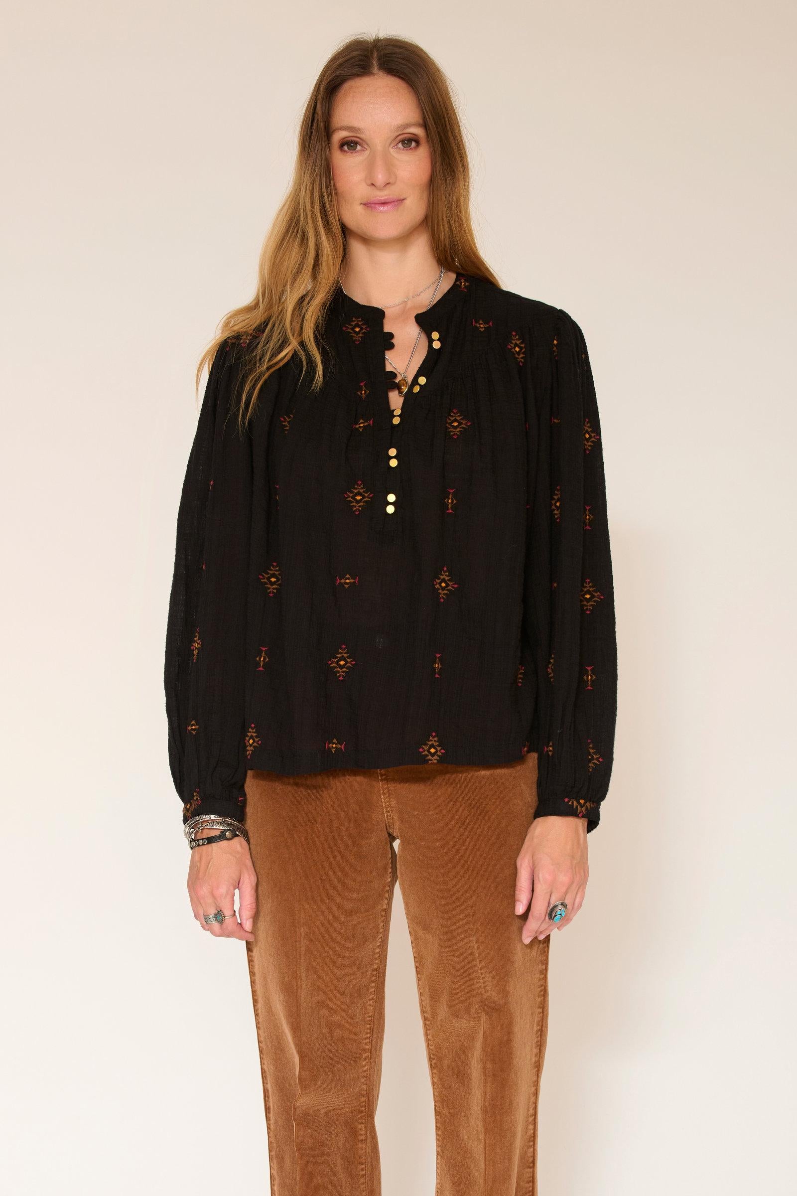 The CALYDORA BLACK blouse is both elegant and casual, perfect for a variety of occasions. Its black color is enhanced by embroidered patterns in warm shades, such as red and orange, adding a touch of dynamism to your outfit.