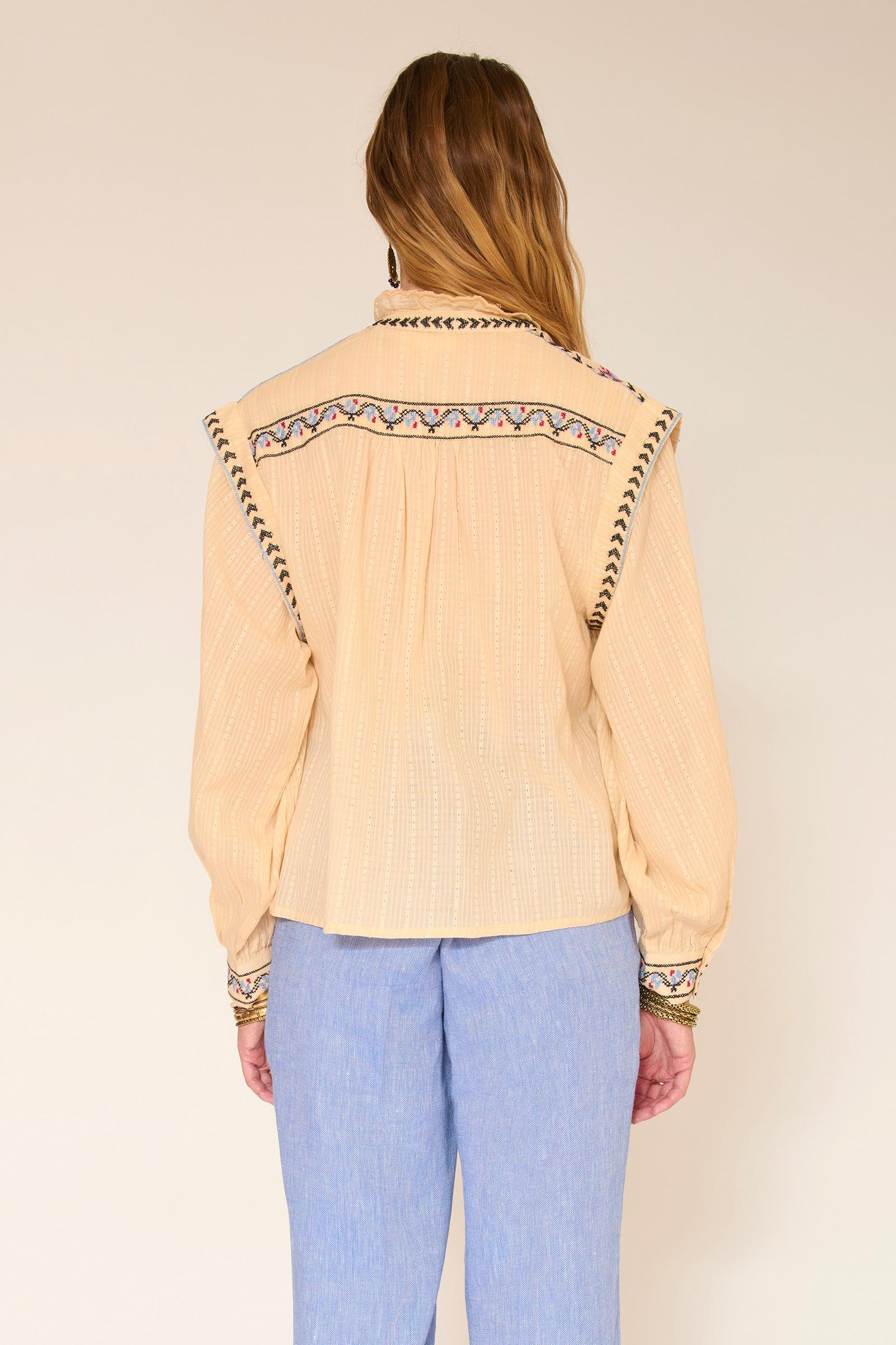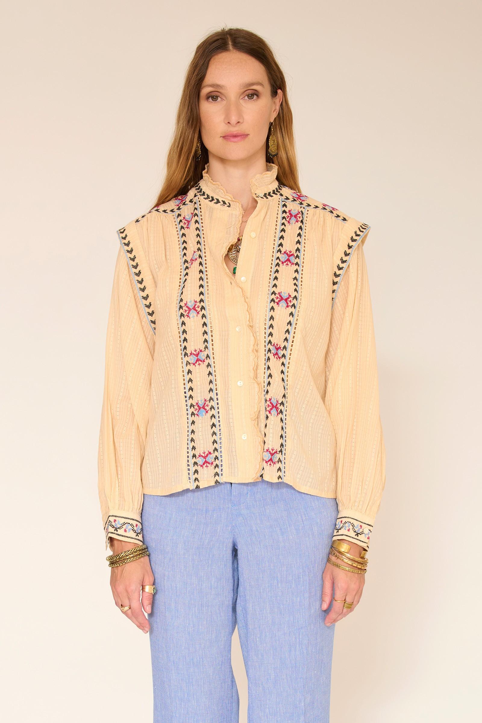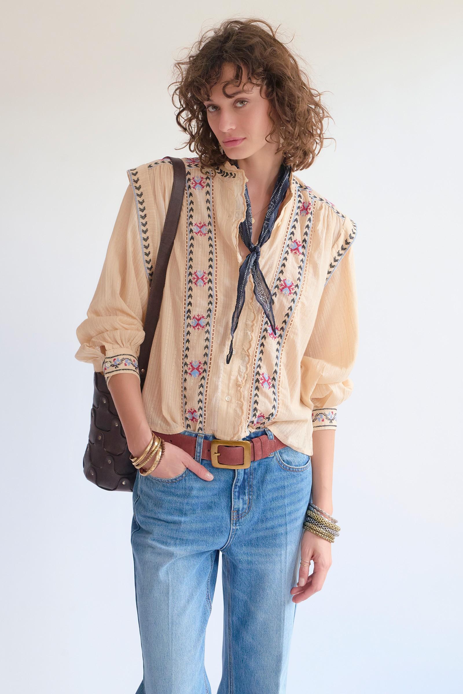 Notre blouse Cléa joue la carte d’un esprit bohème chic tout en subtilité. Son coloris naturel illumine la silhouette, tandis que la coupe droite et fluide accompagne le mouvement sans contrainte. Les broderies délicates structurent le devant et les épaules, apportant du relief et du caractère, contrebalancés par un tombé léger et aérien. Facile à porter au quotidien, elle se glisse aussi bien dans un jean que sur un pantalon plus habillé pour une allure naturellement élégante.
