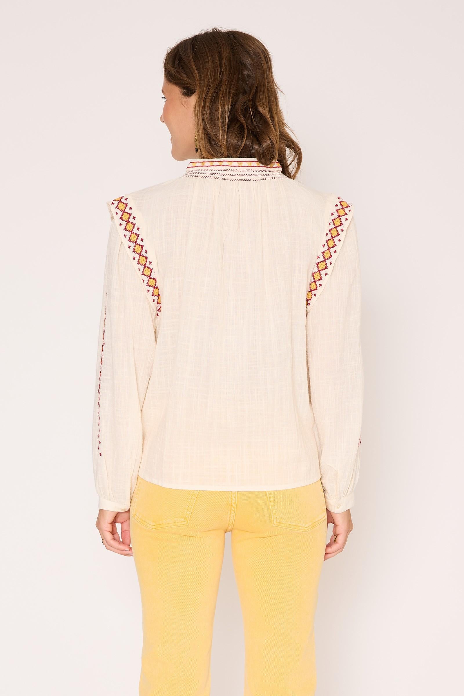 Les broderies colorées attirent l’œil et donnent le ton. Cette blouse mêle légèreté et détails graphiques, avec une coupe fluide qui tombe naturellement sur la silhouette. Facile à porter au quotidien, elle se glisse aussi bien sur un denim que sur un pantalon clair pour une allure douce, lumineuse et spontanée.