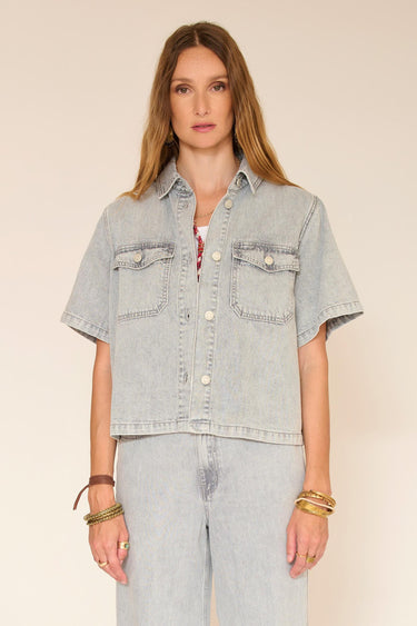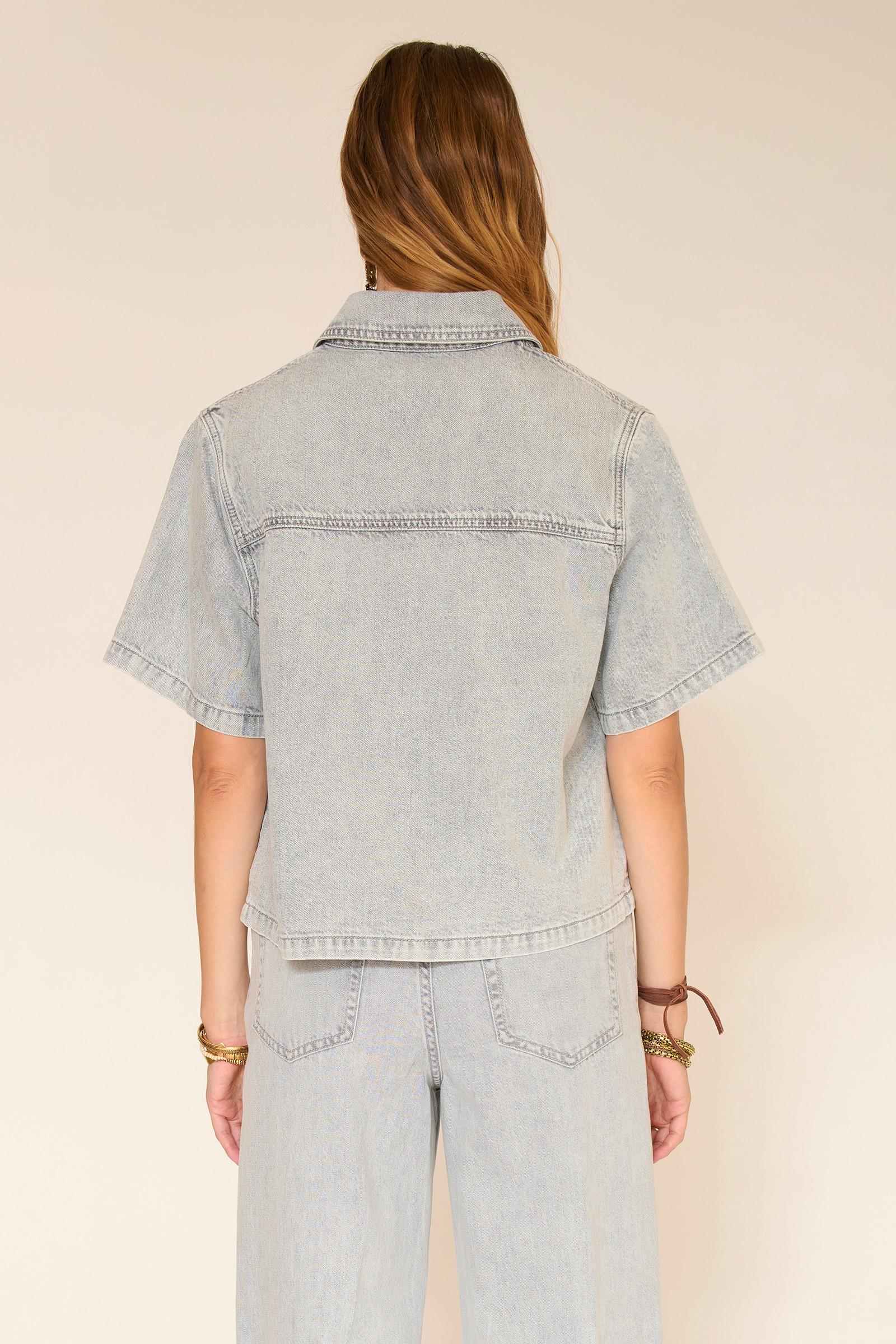 Un denim clair à l’allure légèrement délavée, parfait pour l’été. La coupe est droite et un peu raccourcie, avec des manches courtes qui donnent une silhouette nette et moderne. Le tombé est structuré sans être rigide, facile à porter au quotidien.