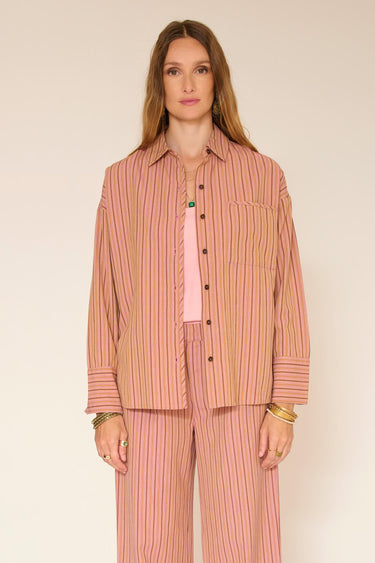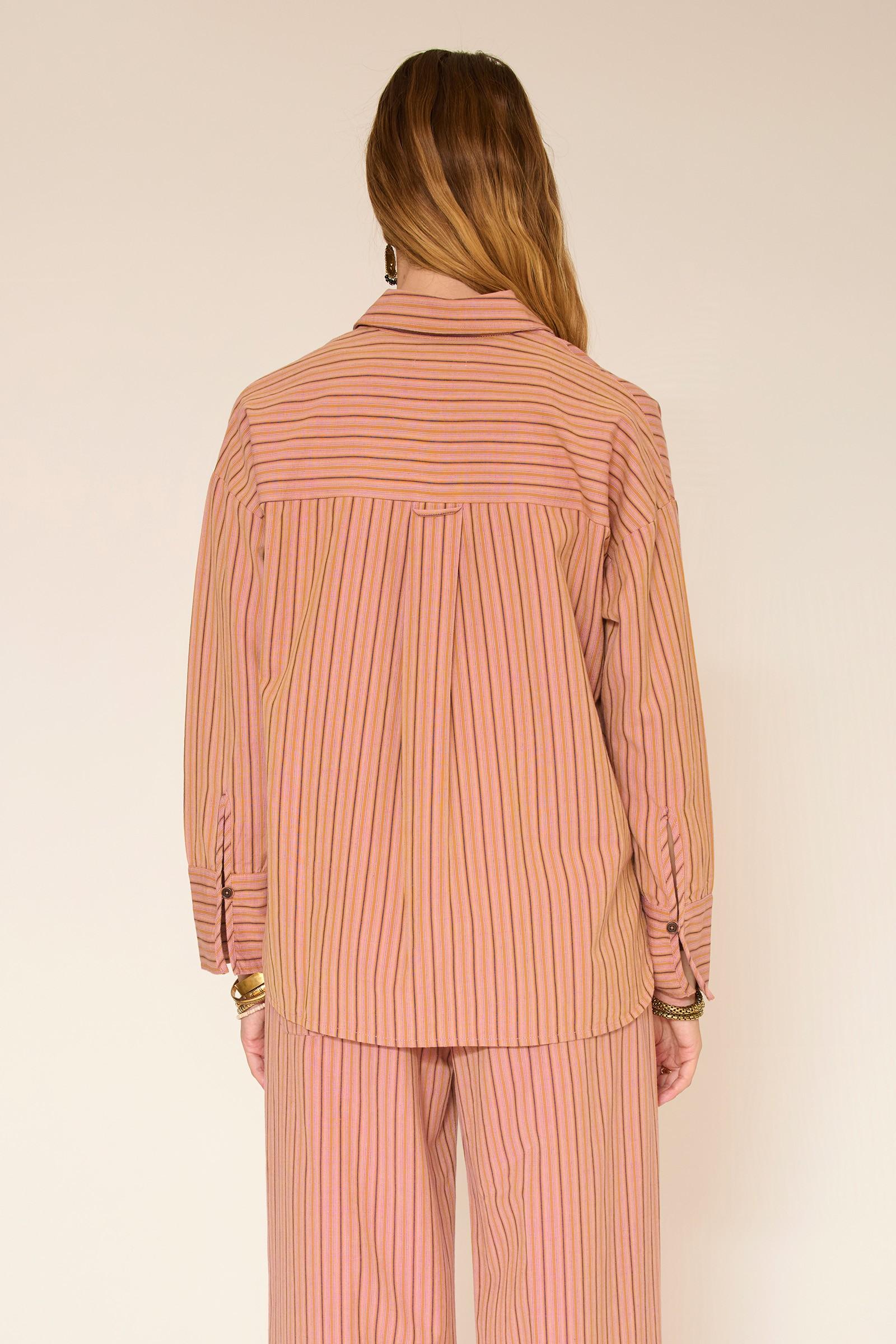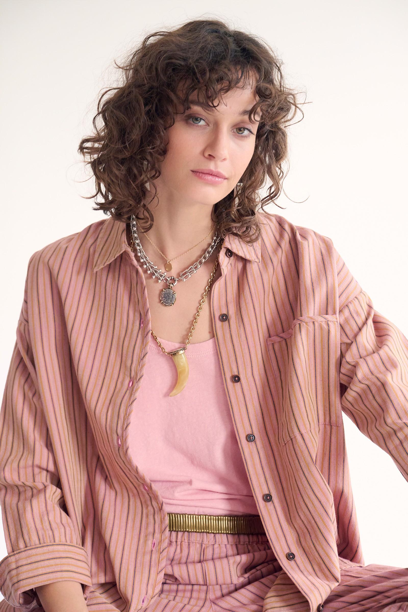 Notre chemise Cora en coloris blush joue la carte d’une élégance douce et facile. Ses fines rayures allongent la silhouette tandis que la coupe fluide accompagne naturellement le mouvement, sans jamais contraindre. Portée ouverte sur un débardeur ou boutonnée seule, elle crée un look à la fois décontracté et soigné. Le tombé est souple, léger, parfait pour composer une allure effortless du matin au soir, avec ce petit supplément de douceur qui fait toute la différence.