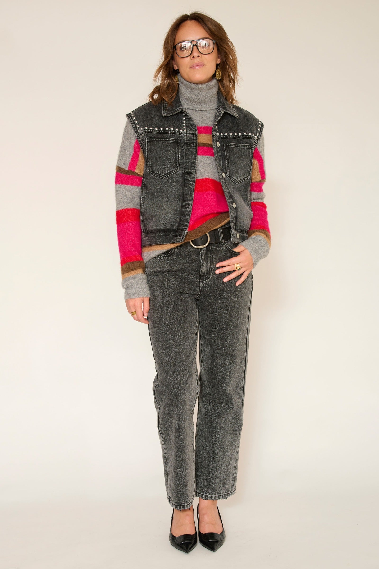 THE MORRISON BLACK DENIM GREY WASH straight-leg jeans are a must-have for any modern wardrobe. Their straight cut ensures a perfect fit through the hips and thighs, falling elegantly down the legs. This timeless style suits all body shapes, offering a flattering silhouette.