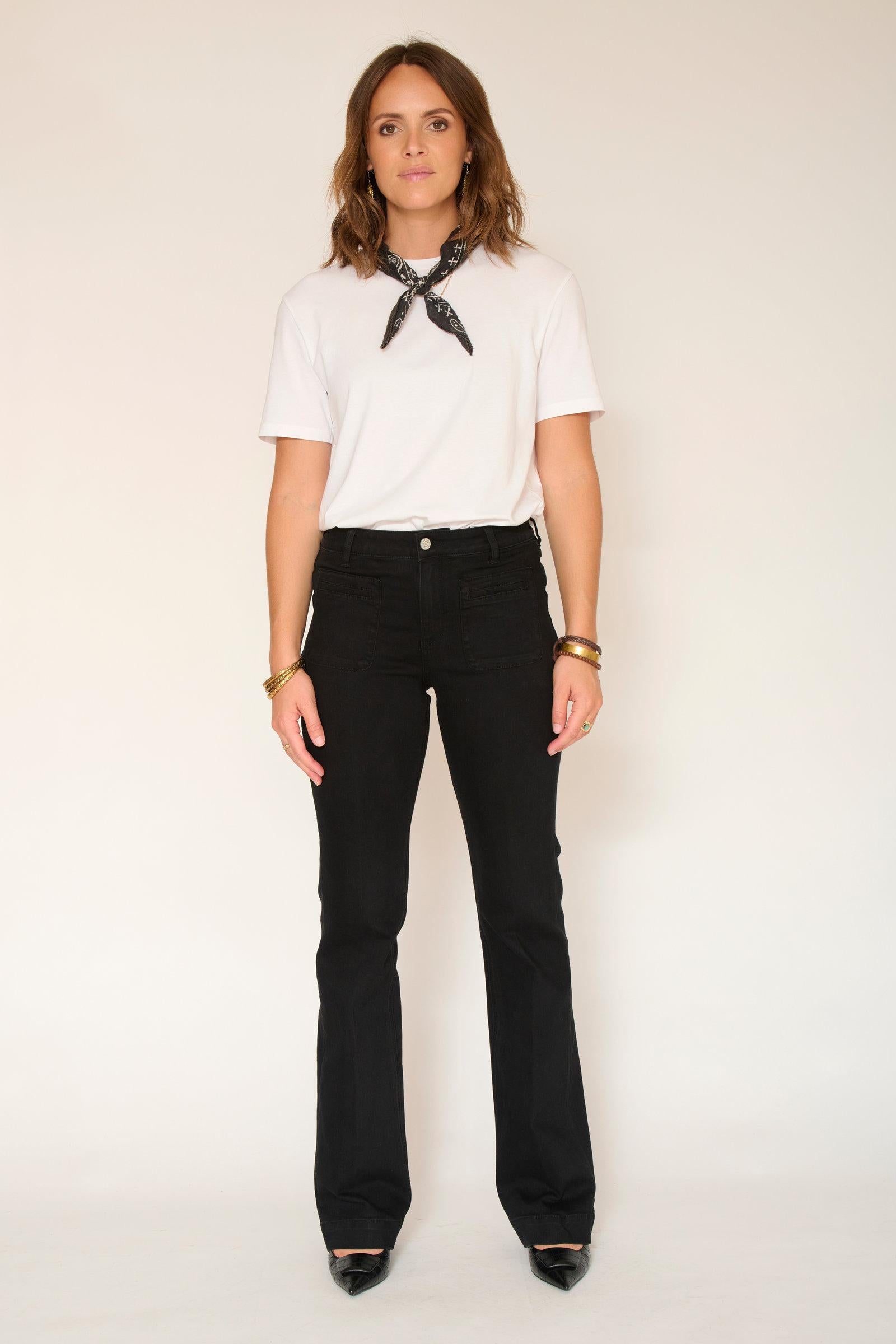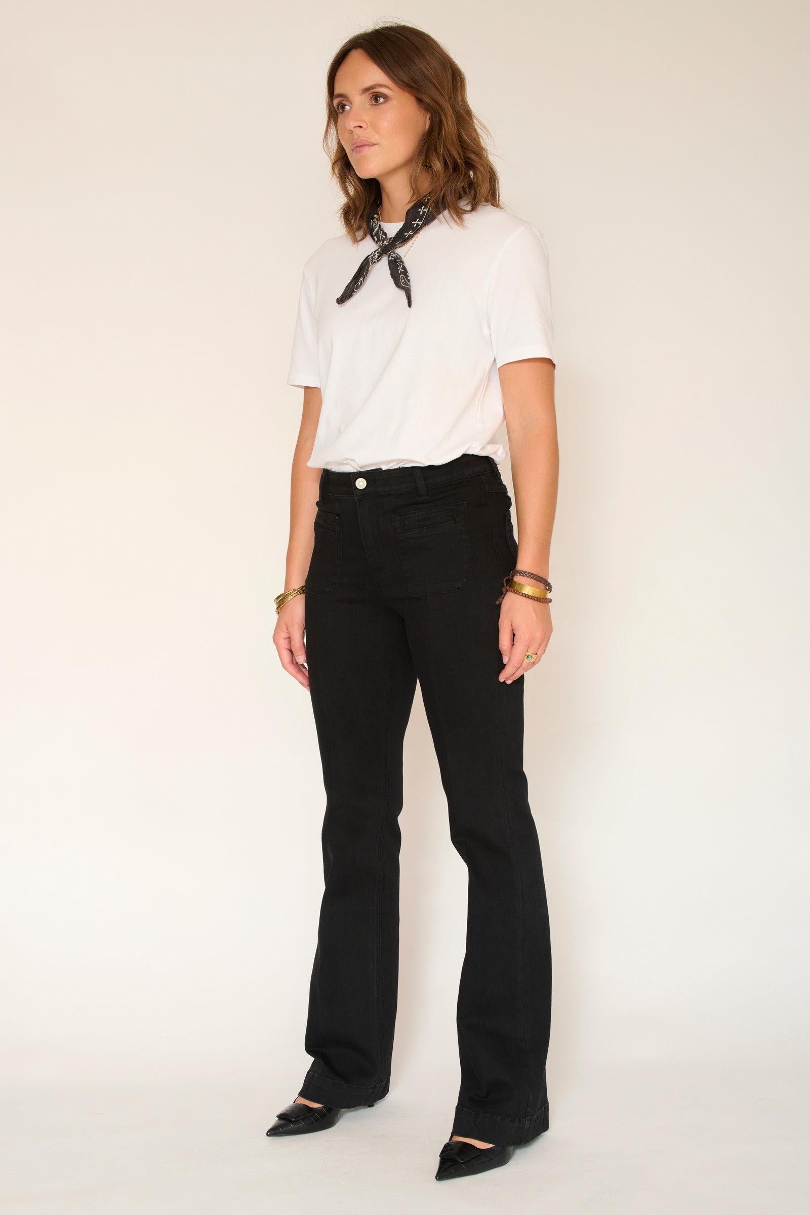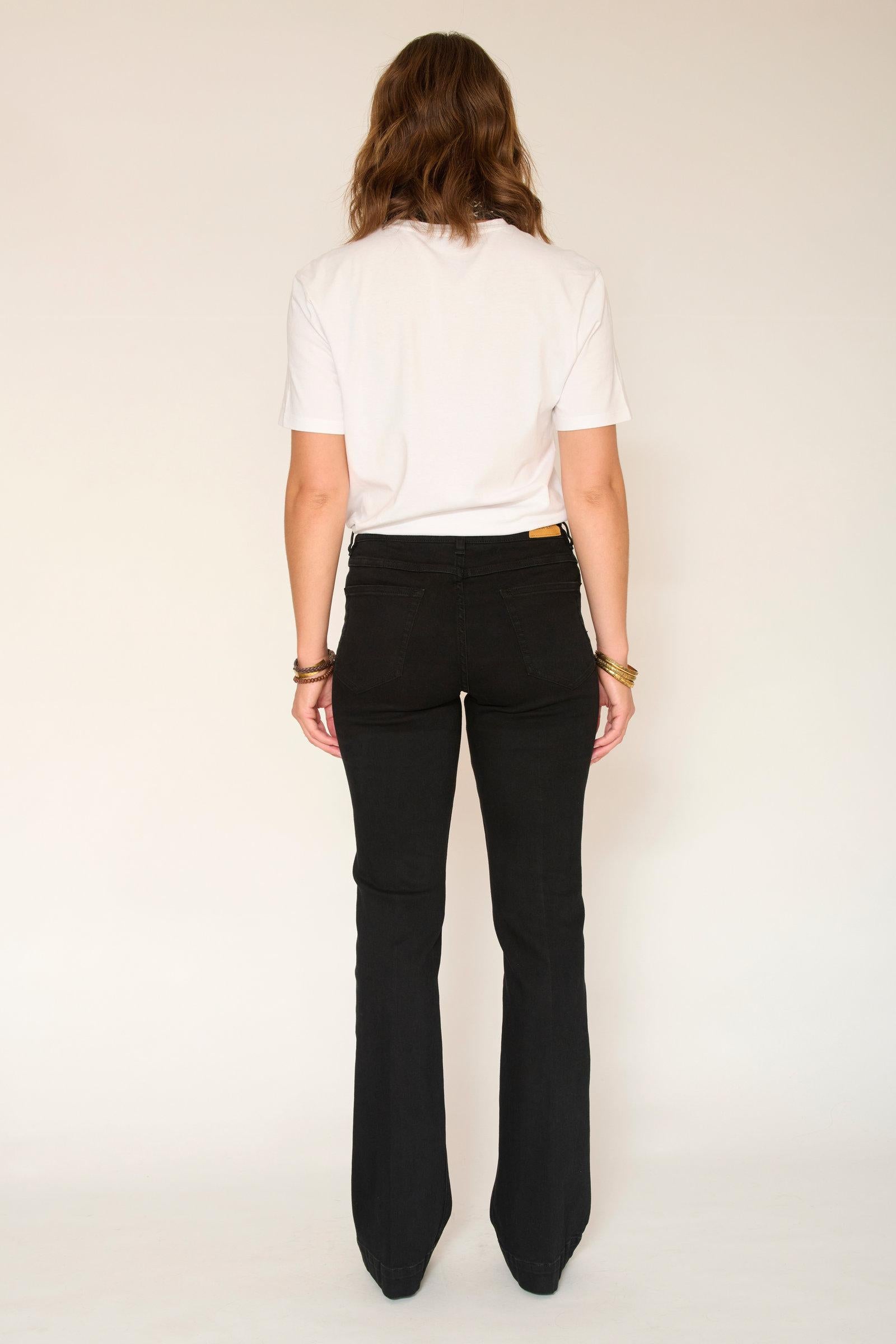 The "THE DIANA POWER STRETCH BLACK RINSE WASH" flare jeans stand out with their deep black color, offering an elegant and versatile finish. Made from stretch denim , this model guarantees optimal comfort while maintaining an excellent fit.