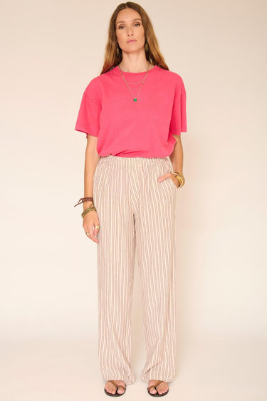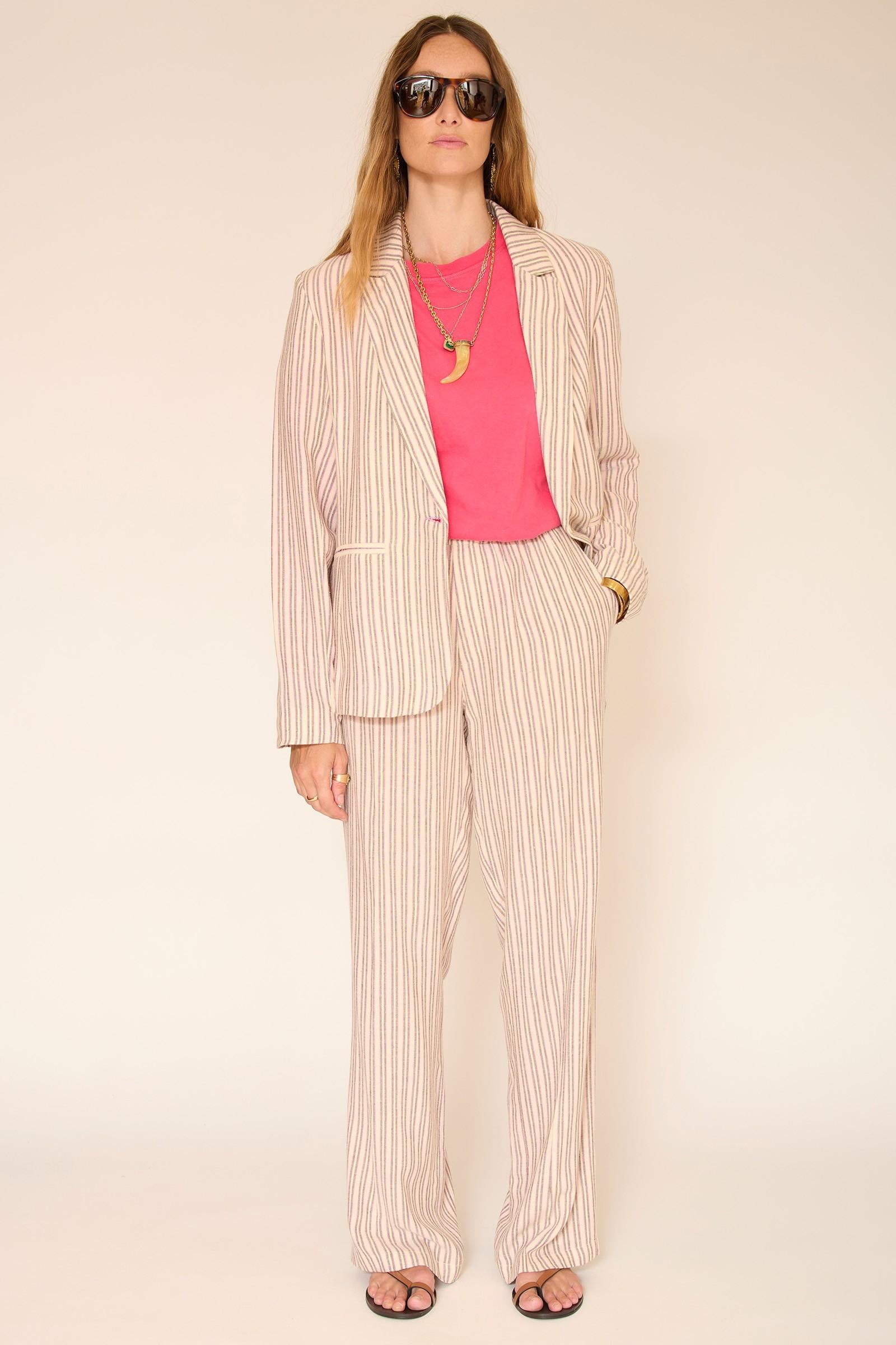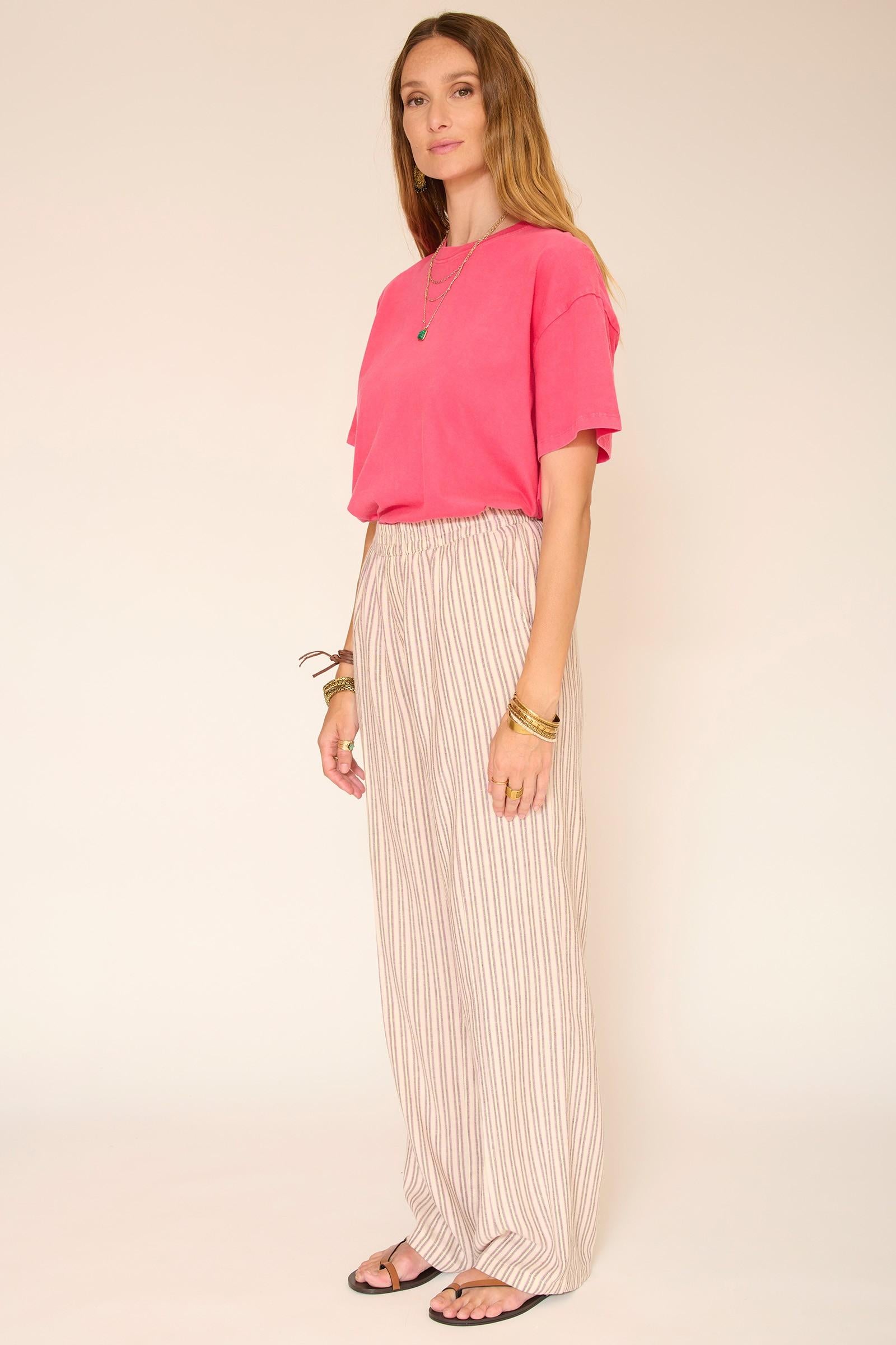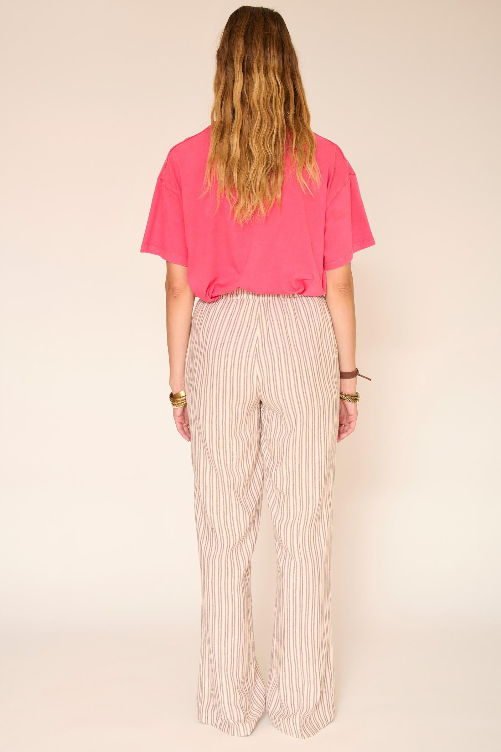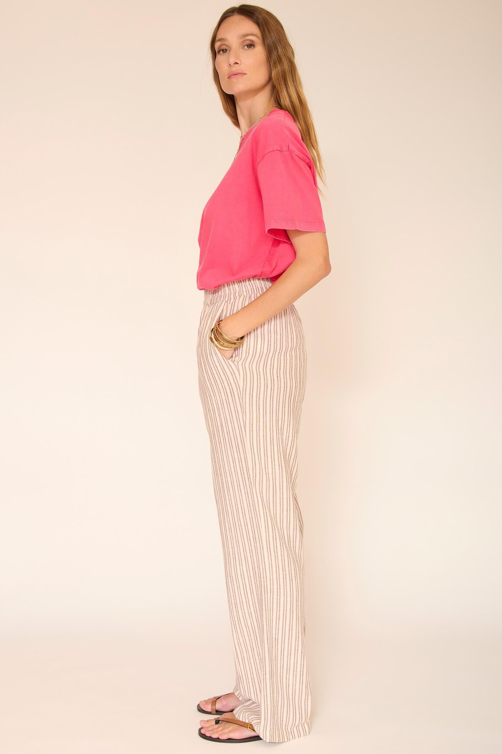 Le pantalon Padel séduit par sa taille élastiquée et son tombé fluide, pensé pour accompagner les mouvements avec naturel. Les rayures fines verticales allongent visuellement la silhouette, tandis que la matière légère apporte une vraie sensation de confort. Une pièce facile à intégrer dans un vestiaire estival, parfaite avec un t-shirt ou une maille légère.
