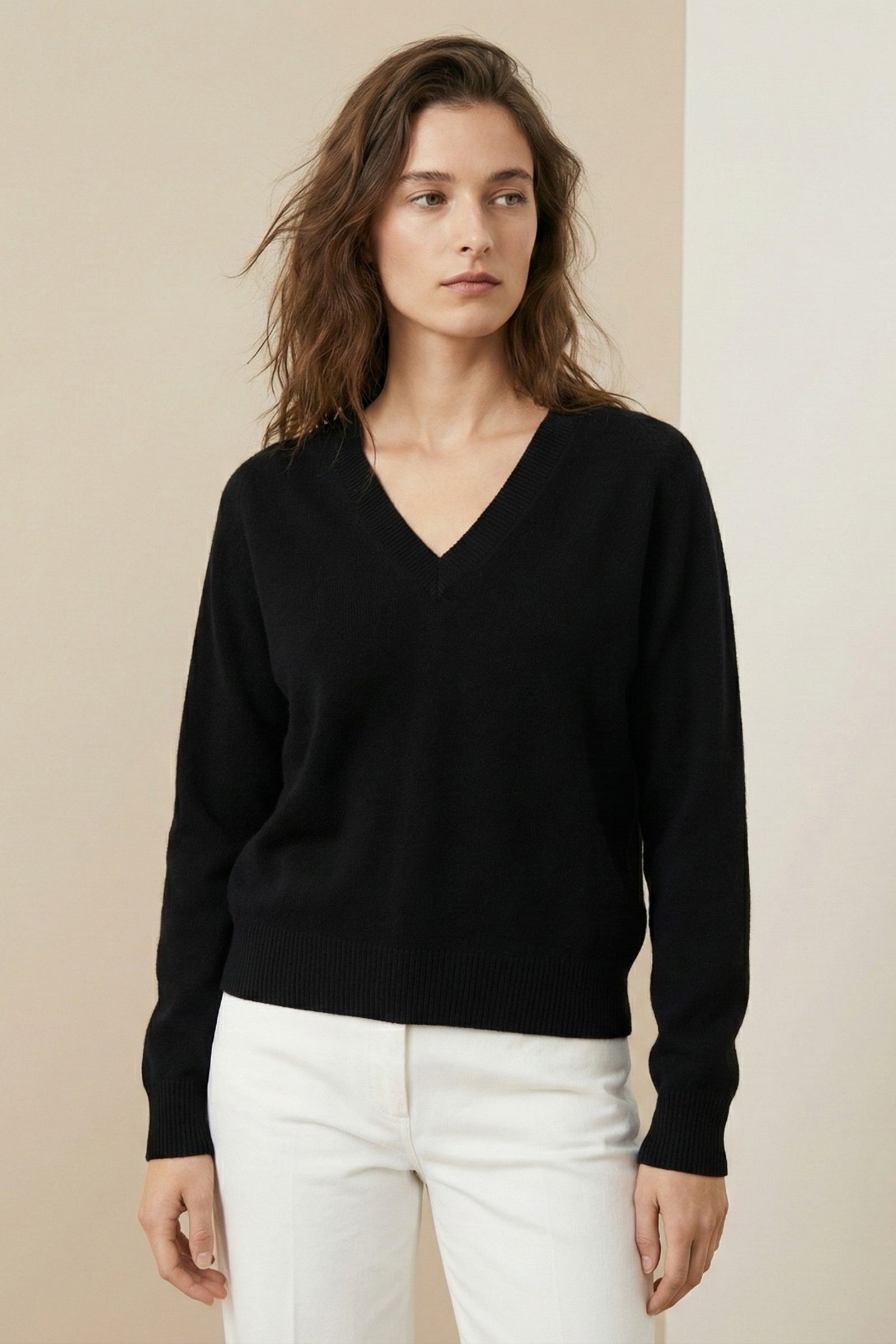 Le pull KALINA séduit par sa coupe légèrement ample, son col V intemporel et sa maille fine au toucher soyeux.