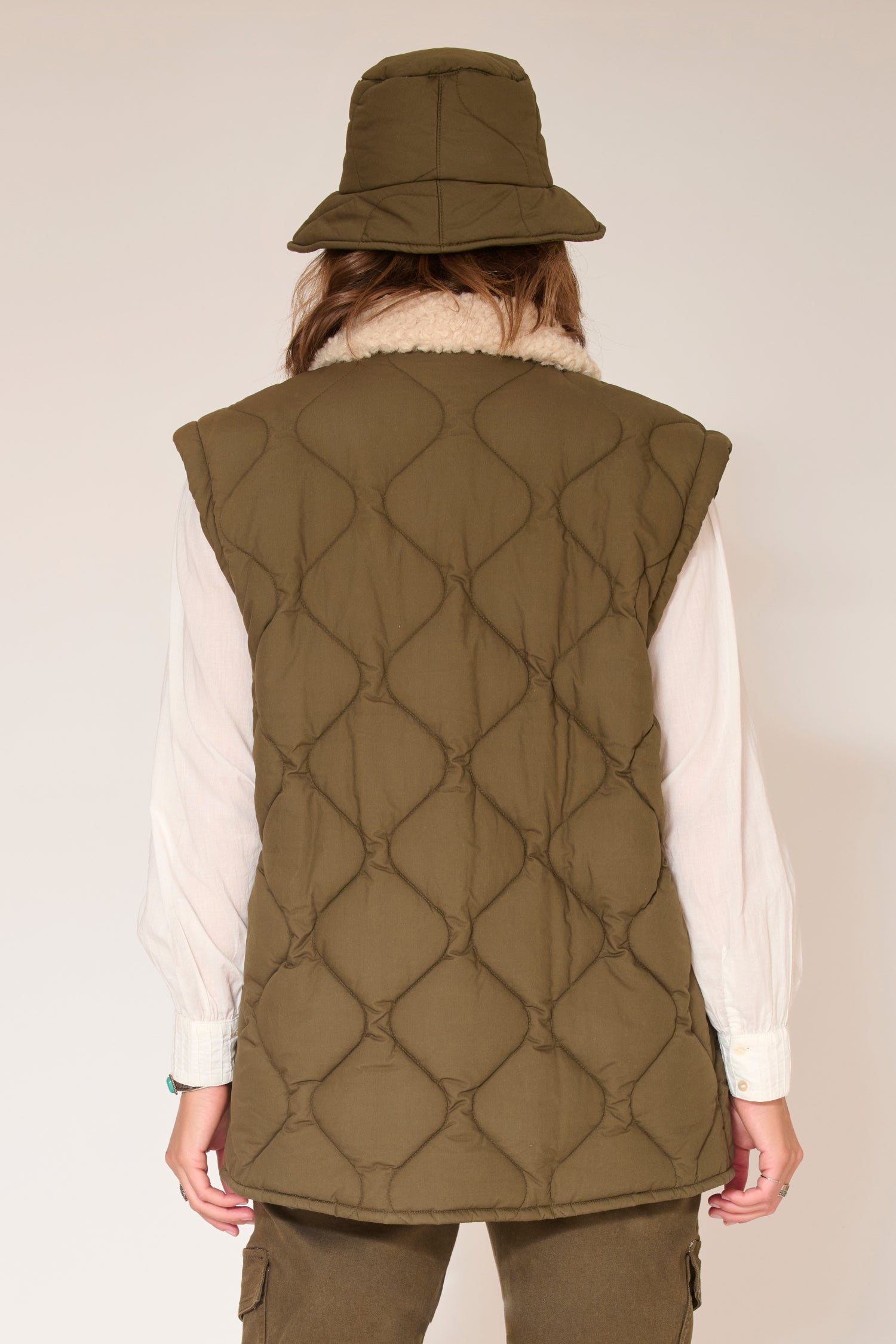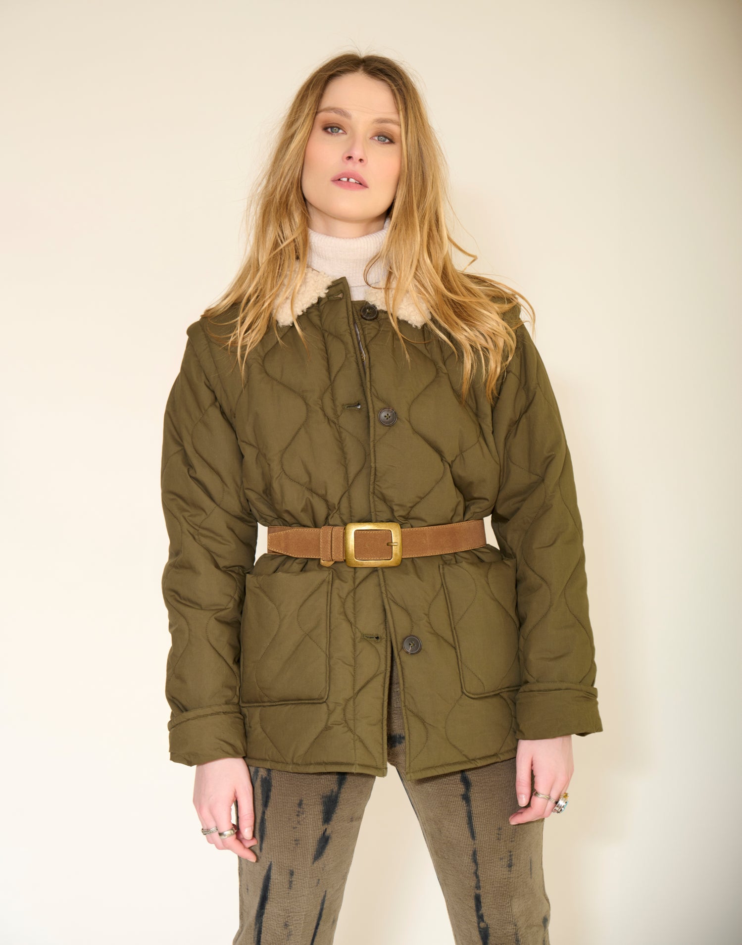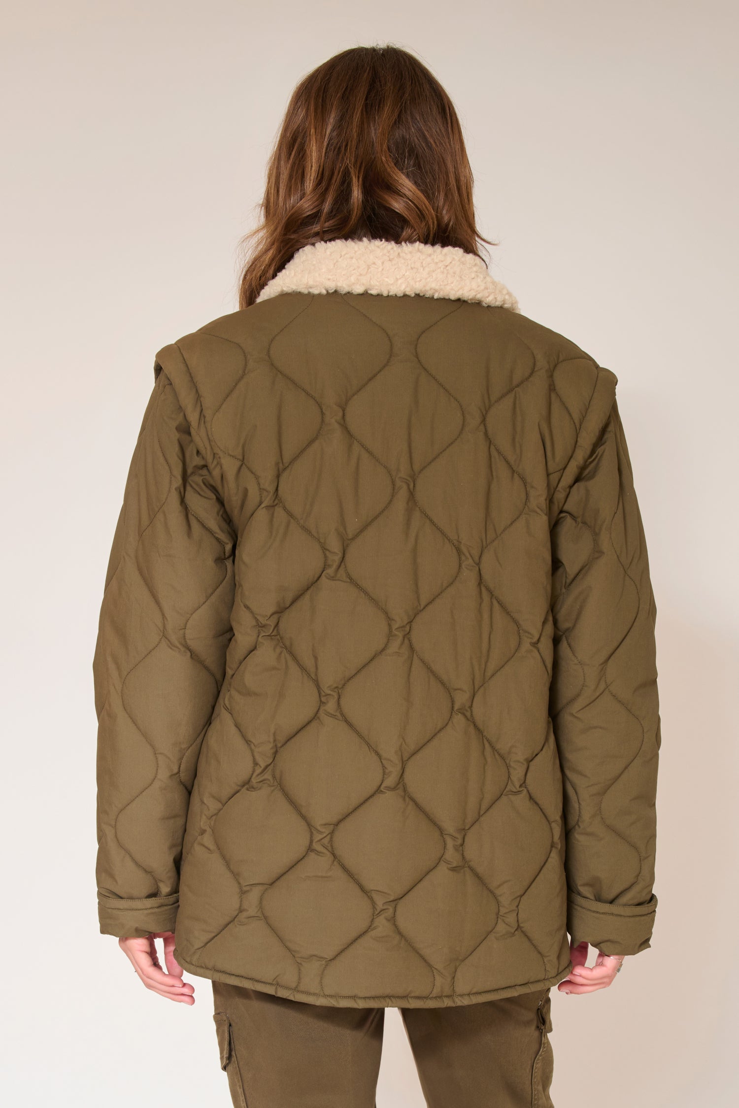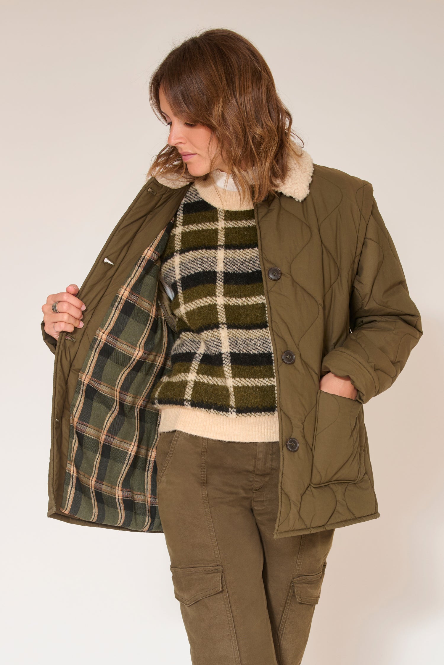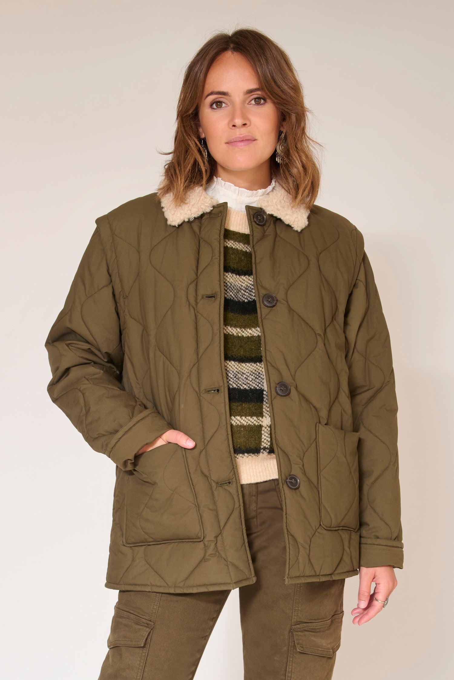 MILDRED Con su corte ligeramente oversize y sus mangas desmontables, reinventa el caqui militar para convertirlo en una prenda casual chic. Déjese seducir también por el sombrero de pescador EYMET a juego para conseguir un look geométrico total.