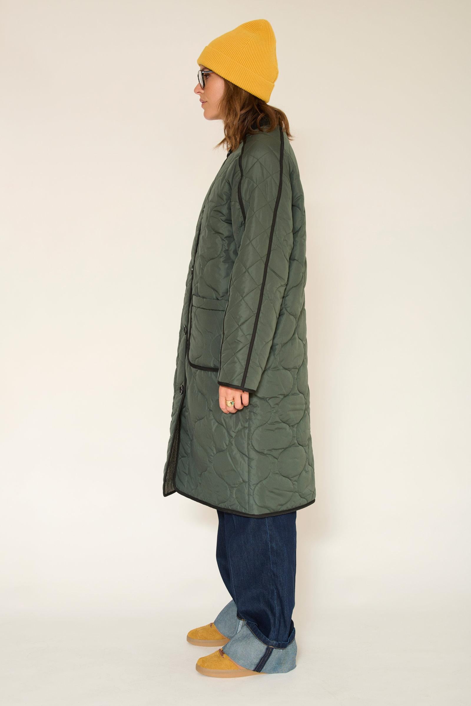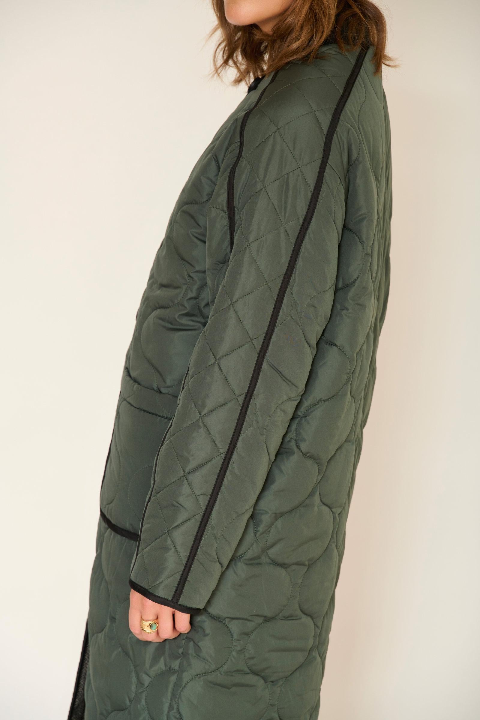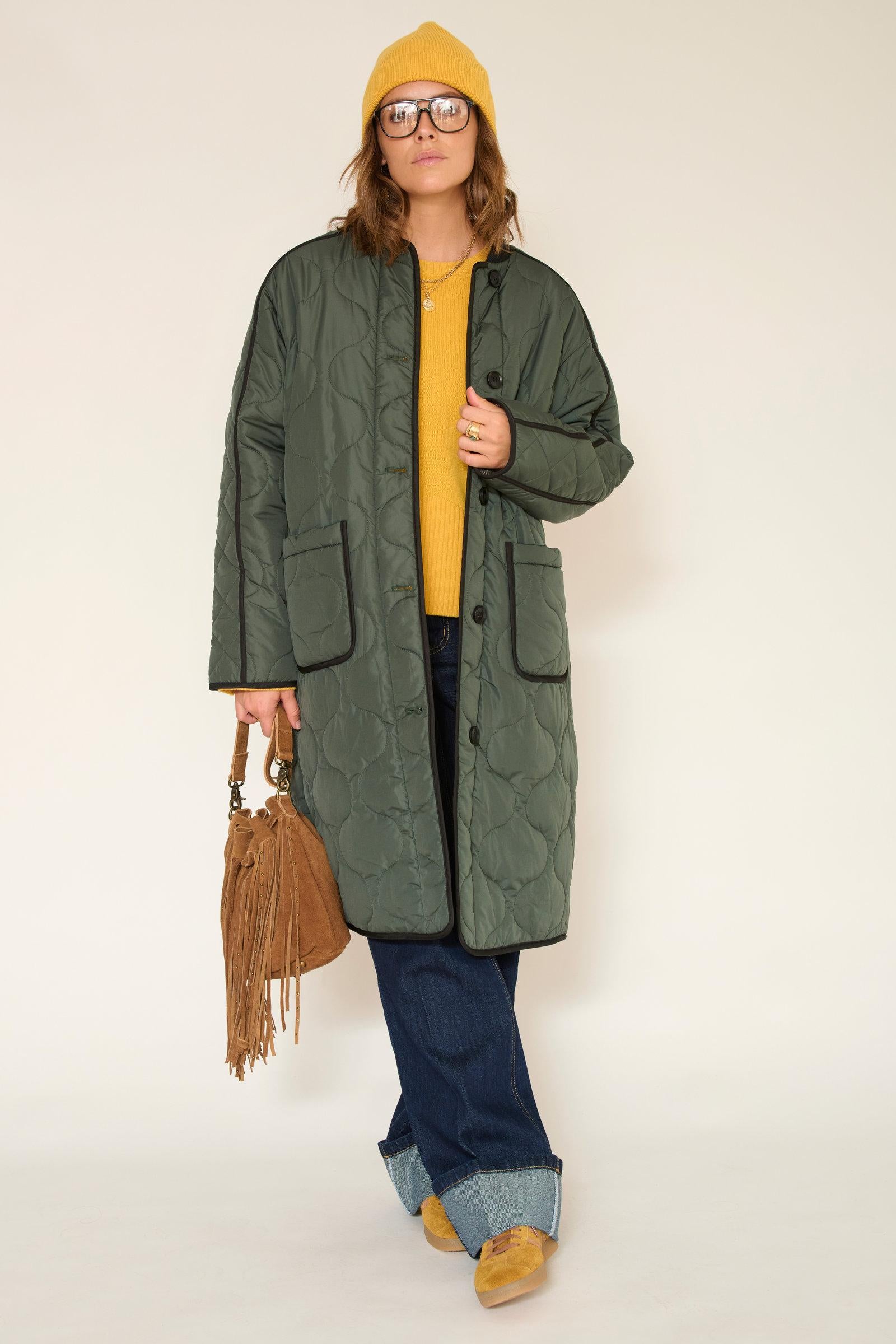 Su color caqui se adapta perfectamente a las tendencias actuales, permitiéndole combinarse fácilmente con otros tonos. Su corte largo y holgado garantiza una gran libertad de movimiento, mientras que las costuras acolchadas le aportan un toque moderno y garantizan un eficaz aislamiento térmico.