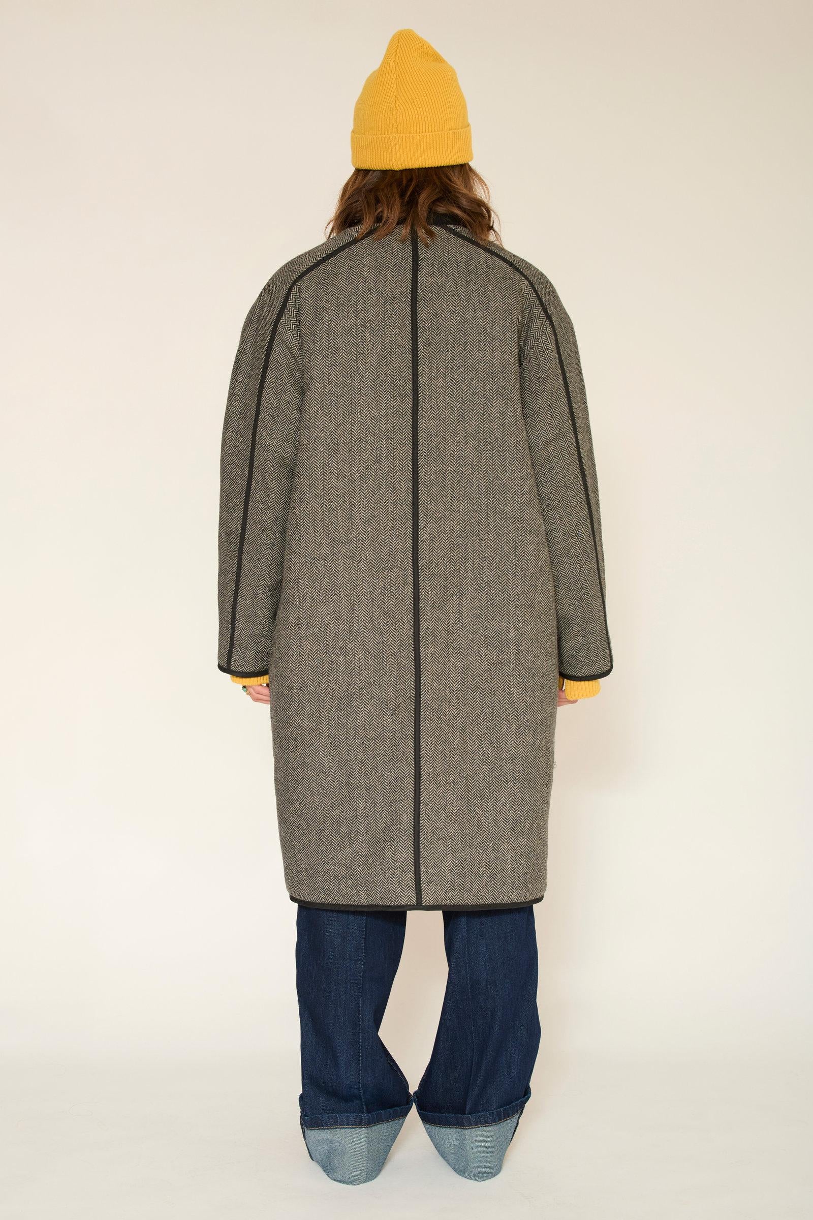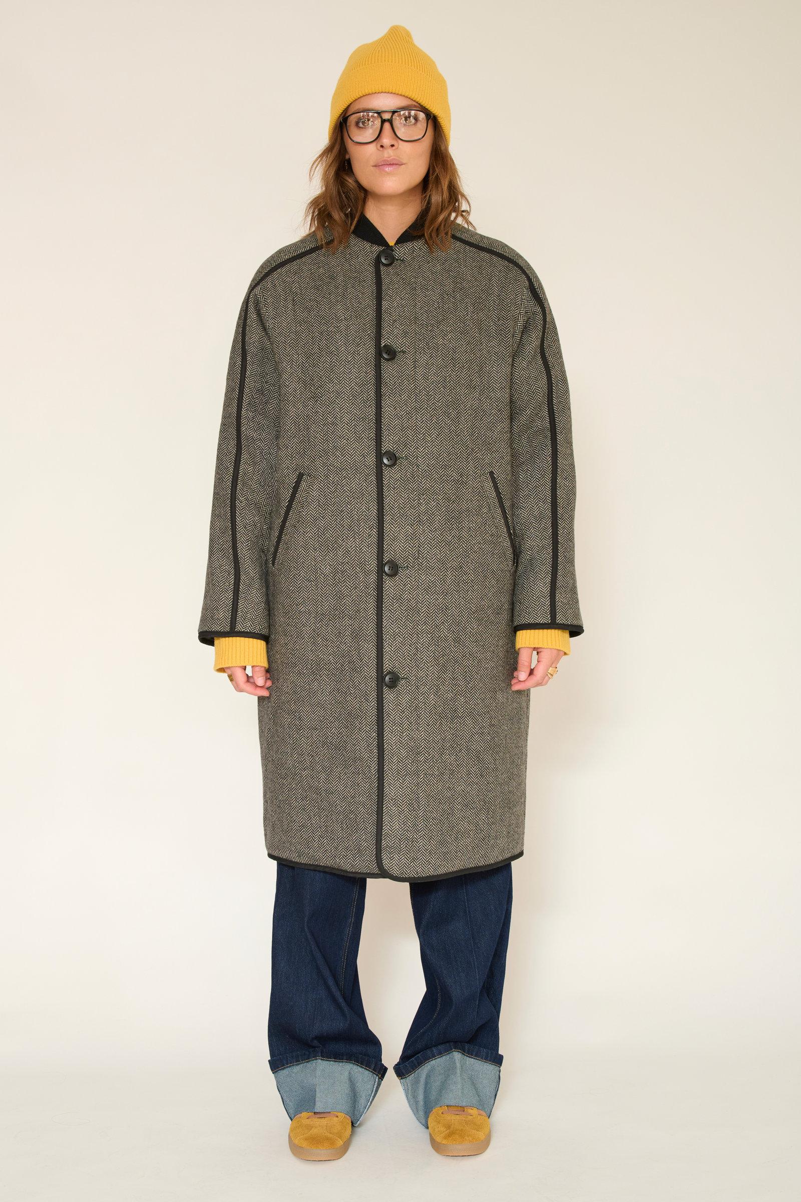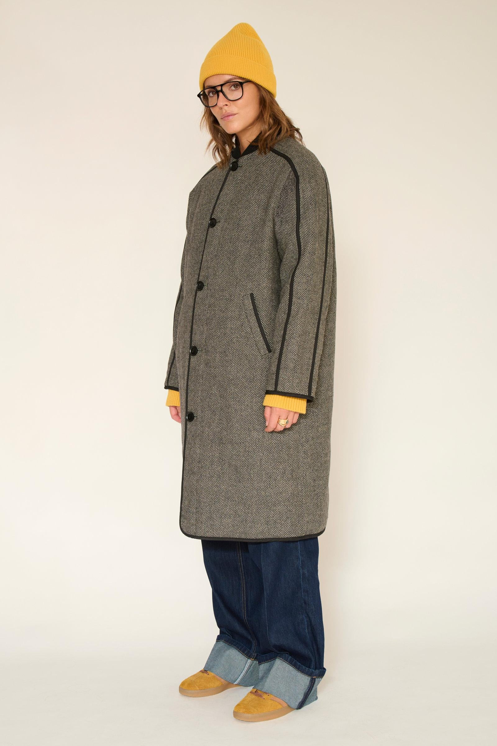 Los bordes del abrigo se realzan con acabados en contraste , acentuando su diseño pulcro y elegante. Este modelo suele combinarse con accesorios como un gorro de lana amarillo, aportando un toque de color alegre y brillante al conjunto.