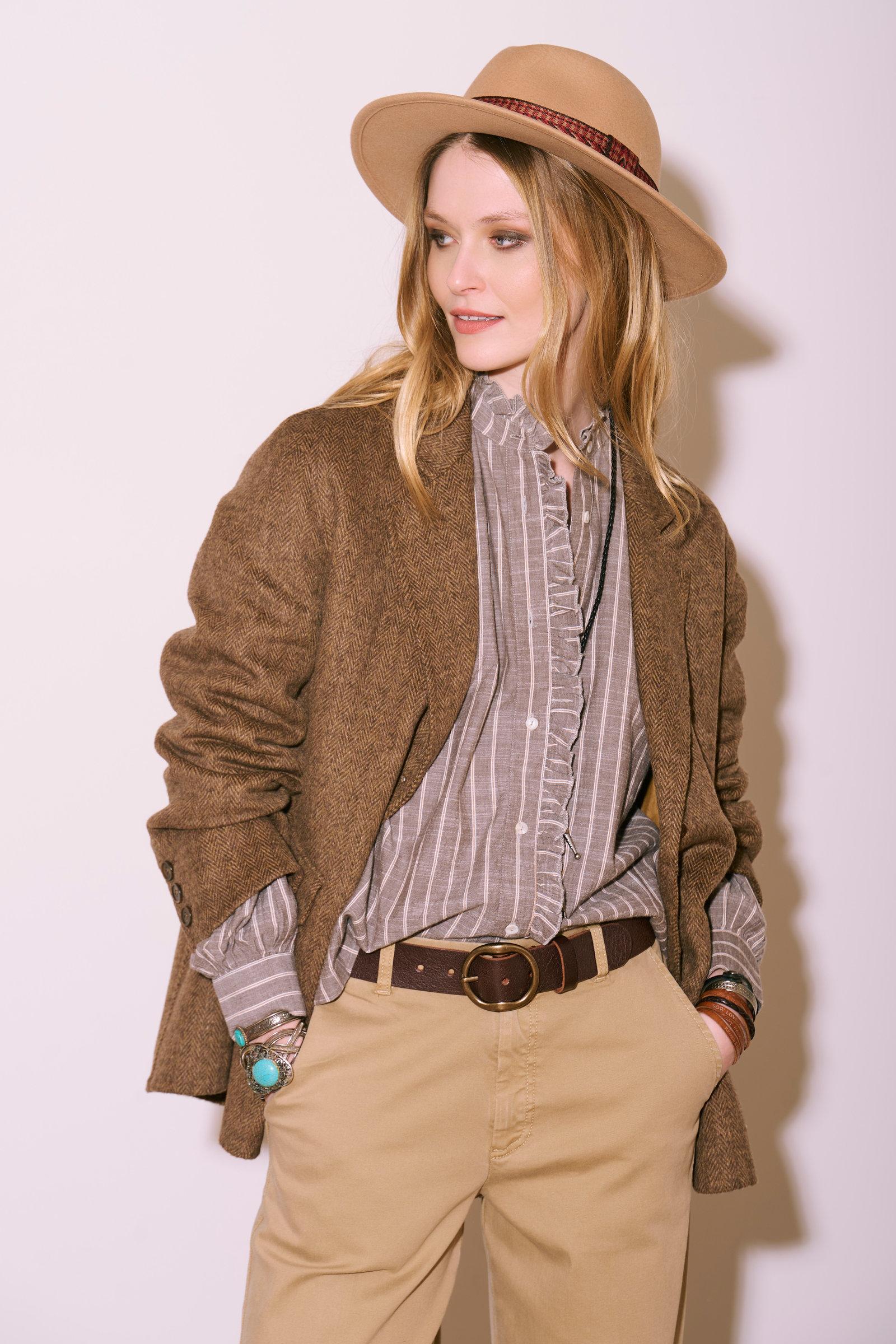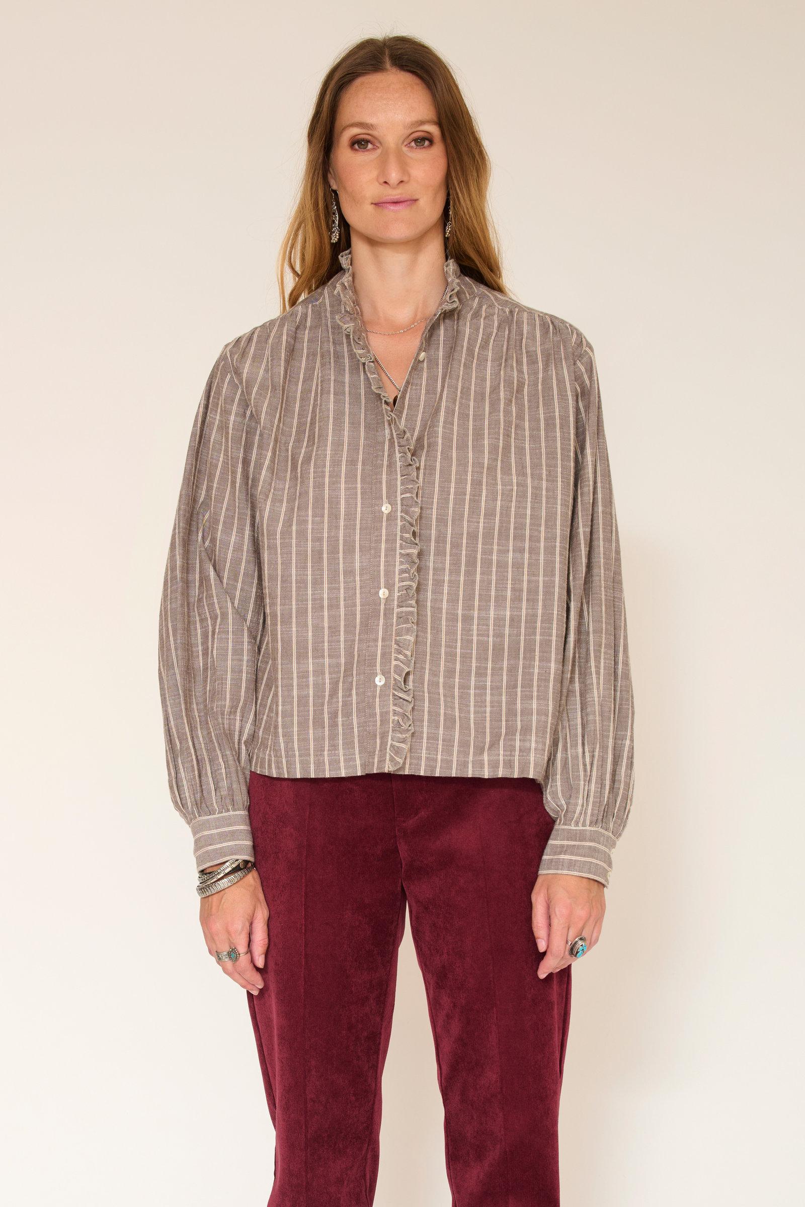 La blusa CARTALI BRUN es una prenda imprescindible en cualquier armario moderno. Su color marrón claro , adornado con rayas verticales más oscuras, le confiere un estilo clásico y contemporáneo a la vez.