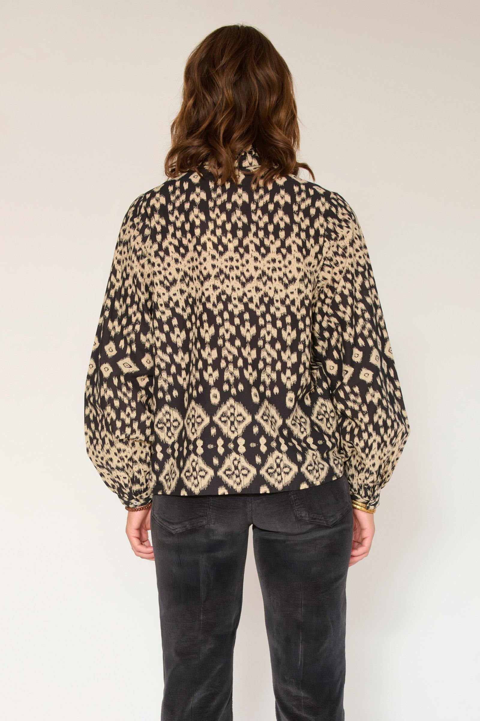 La blusa "CYANA BLACK" es una prenda femenina con un diseño distintivo, diseñada para combinar comodidad y estilo. Su color negro, adornado con patrones geométricos y abstractos en beige, aporta un toque de originalidad a tu armario.