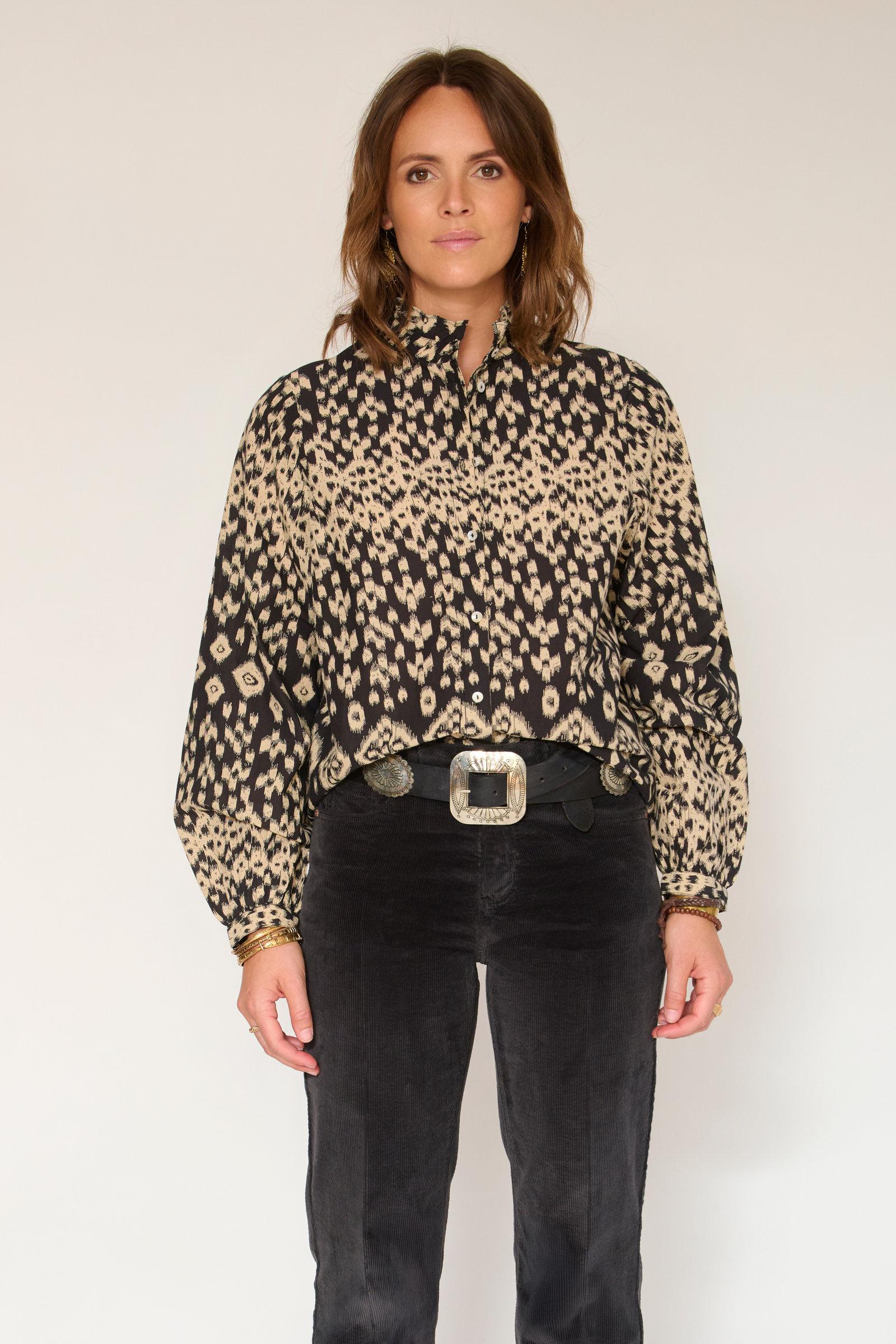 La blusa “CYANA BLACK” es una opción imprescindible para aquellas mujeres que desean combinar comodidad y elegancia, destacando con un estampado único y atractivo.