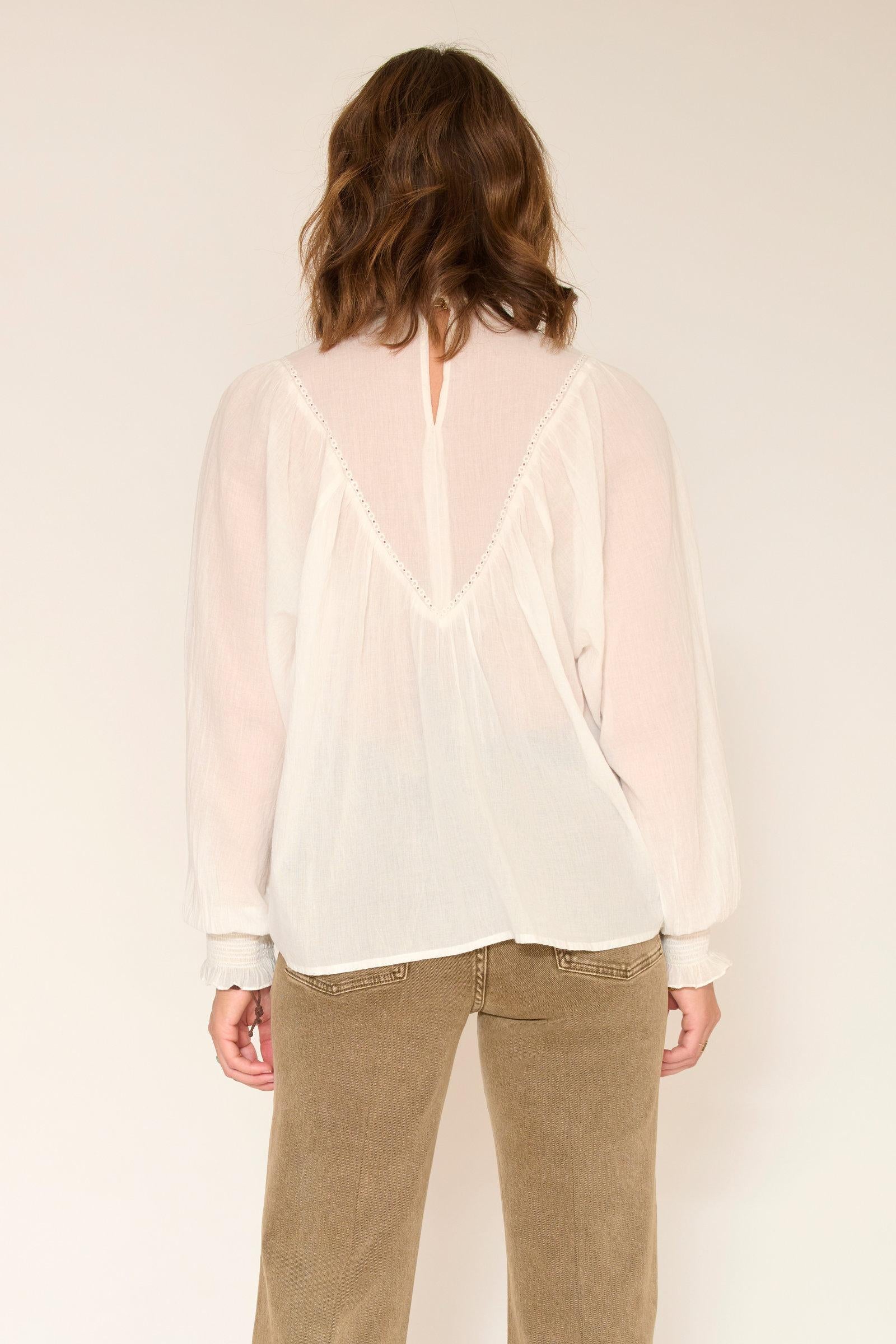 La blusa HERMINE NATURAL es una prenda elegante y femenina, diseñada en color crudo . Su delicado cuello tunecino y sus largas mangas abullonadas le aportan un toque romántico al conjunto.