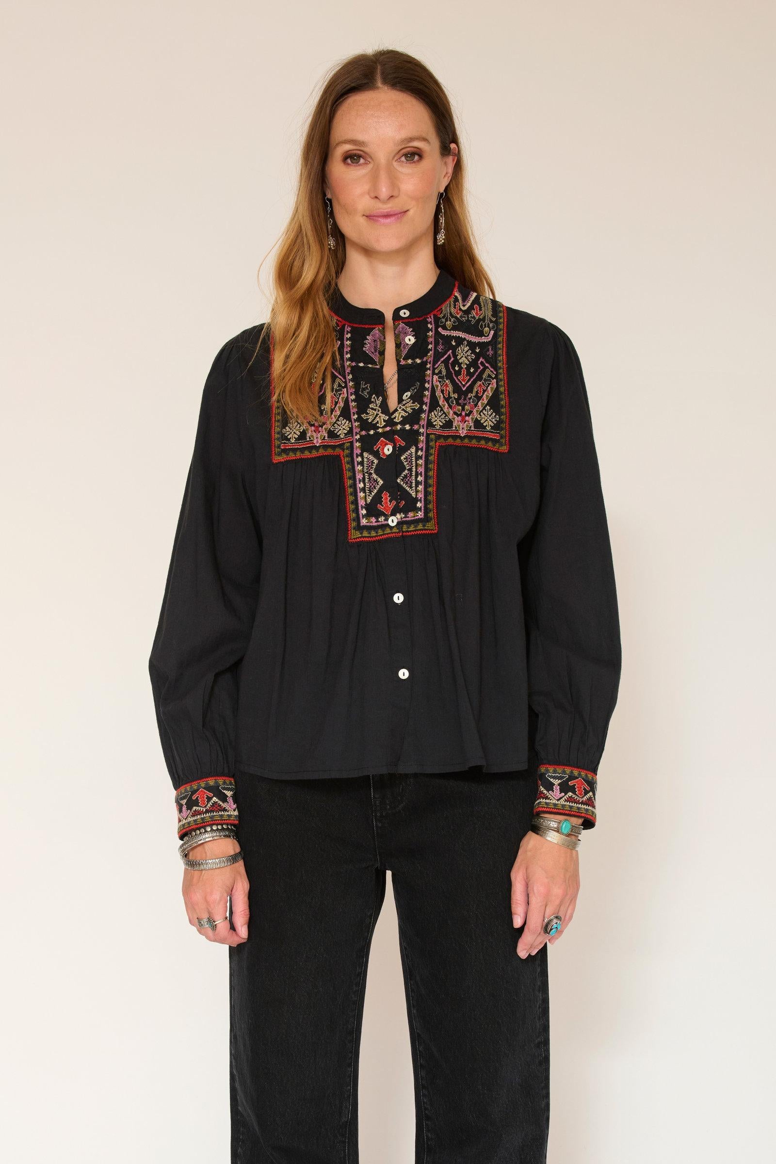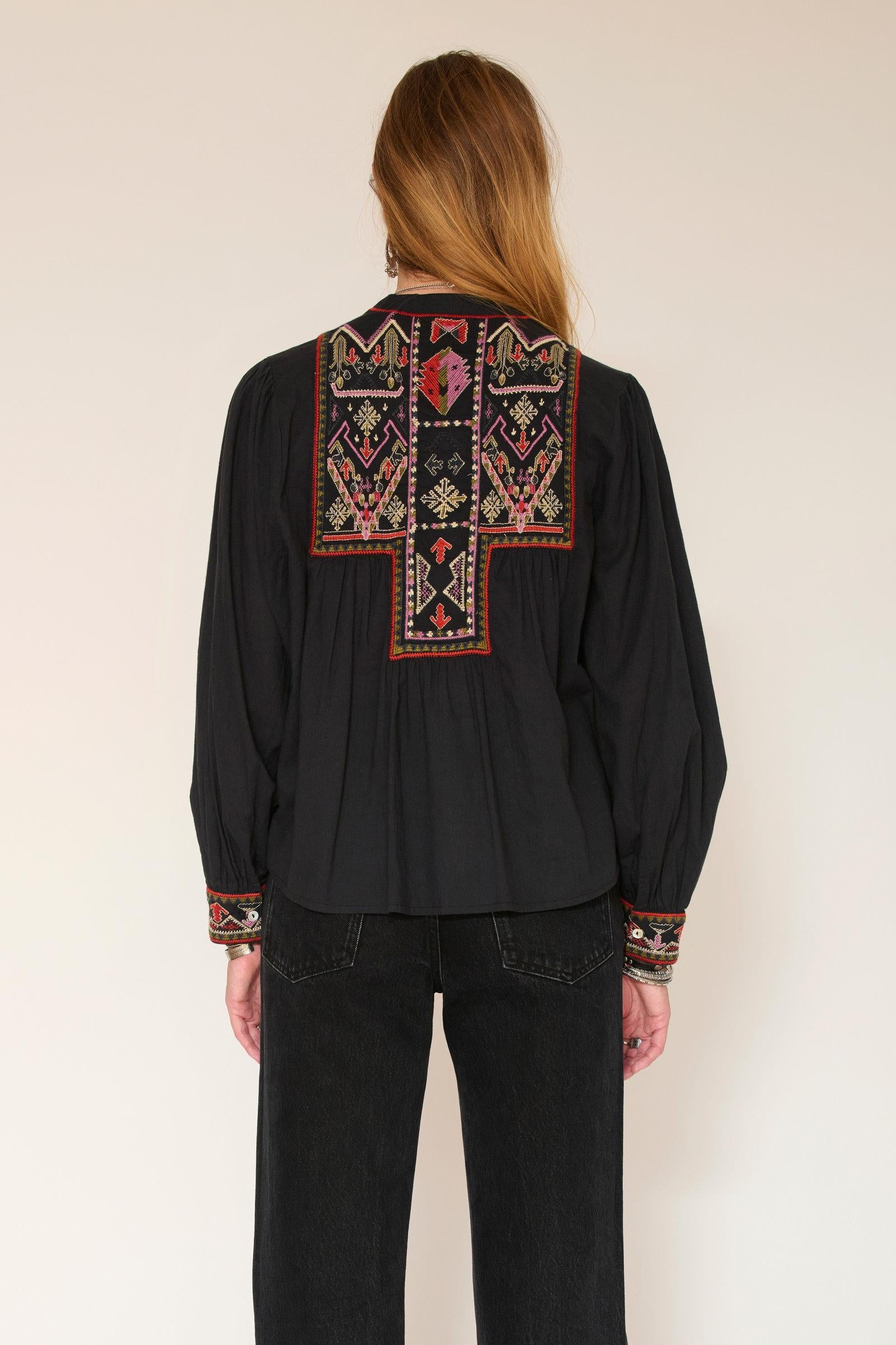 La blusa HILONA BLACK es una prenda elegante y distintiva, ideal para un estilo casual pero refinado. Su color negro le da un aspecto chic y atemporal, mientras que los coloridos bordados en la parte delantera y trasera le aportan un toque artesanal único.