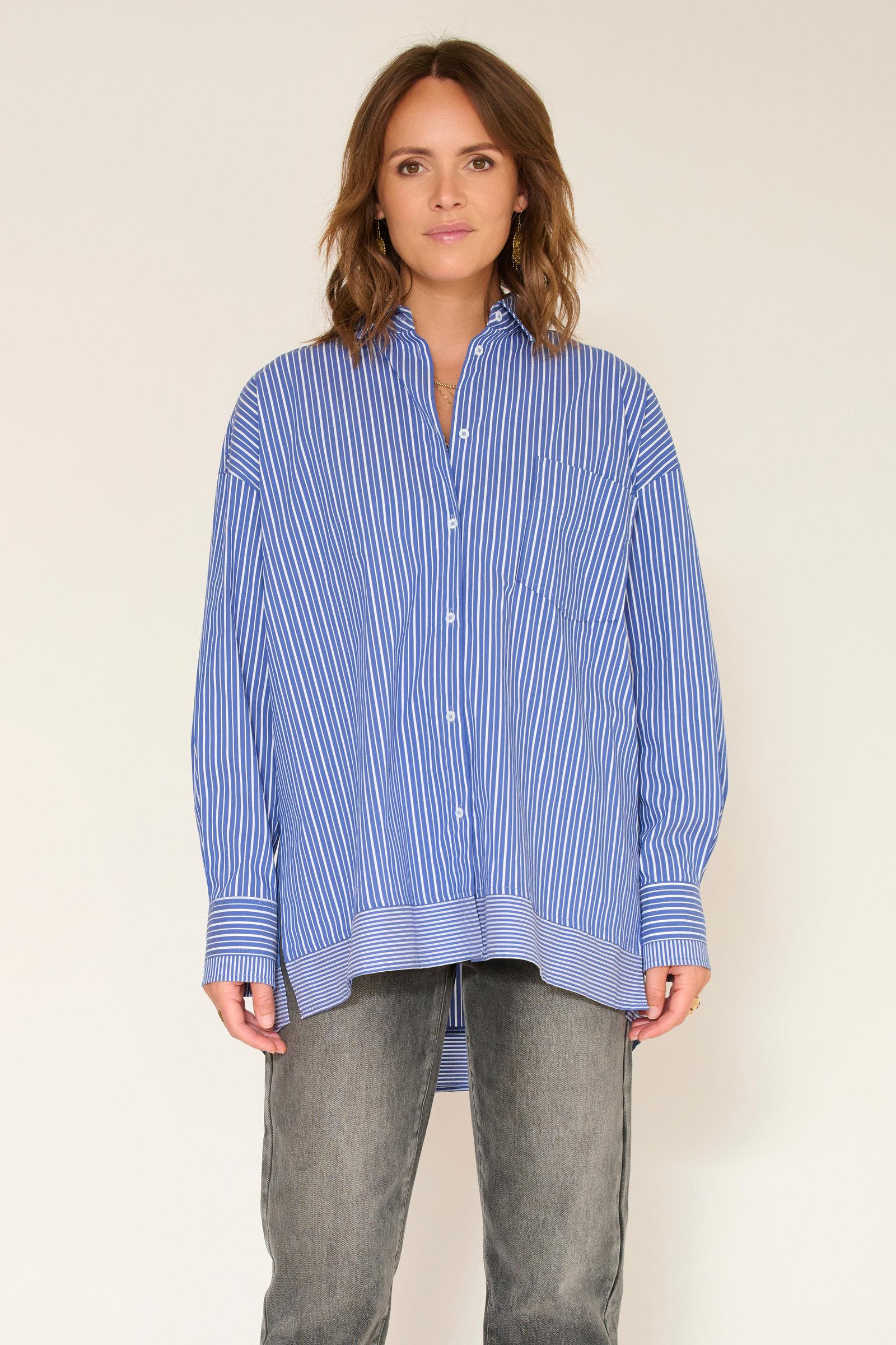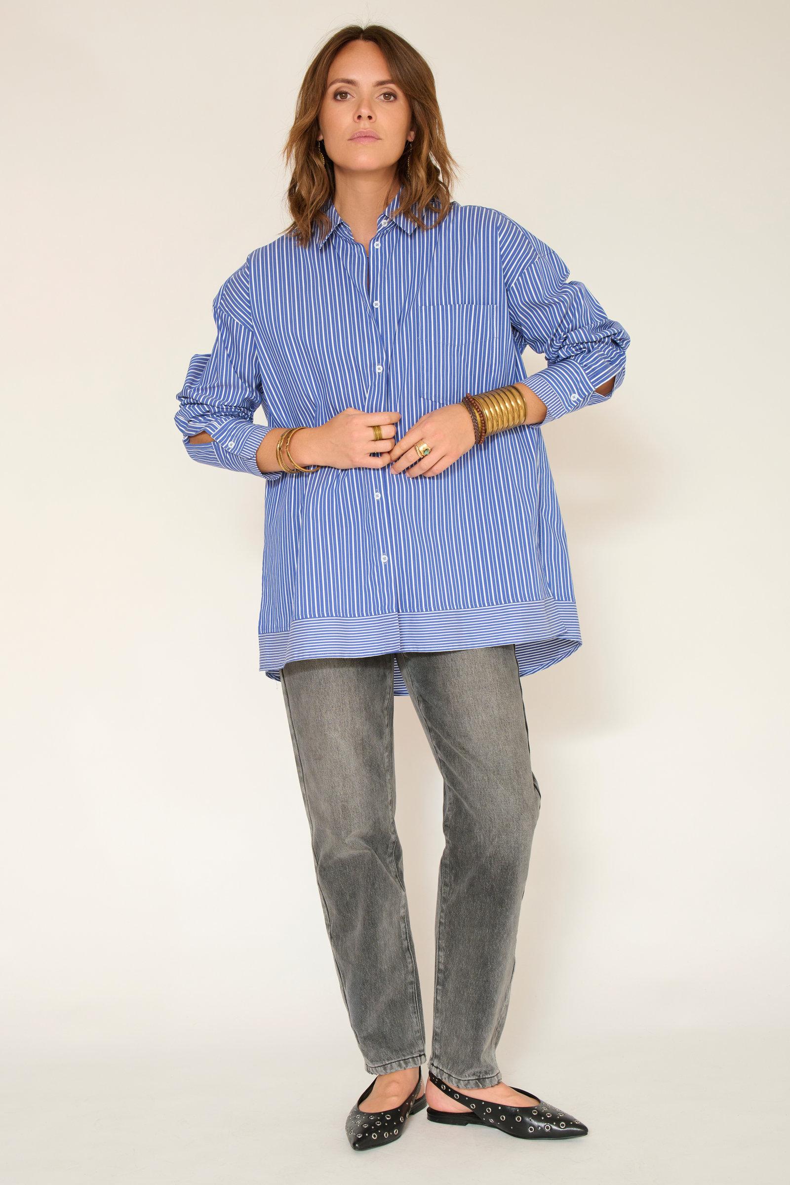 Incorpora la camisa CASSY BLUE a tu armario para una elección elegante pero cómoda que combina perfectamente con accesorios dorados para un look chic.