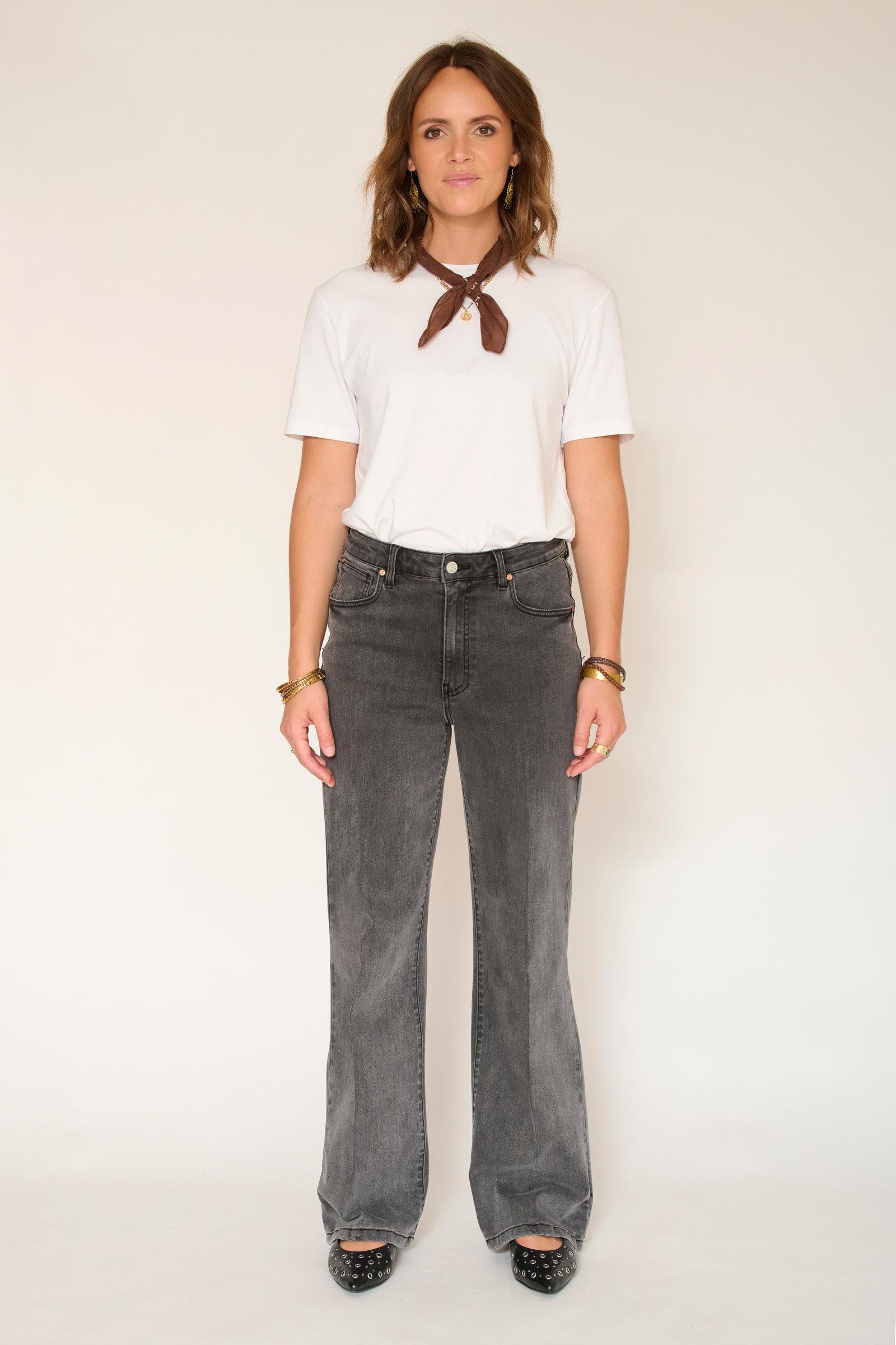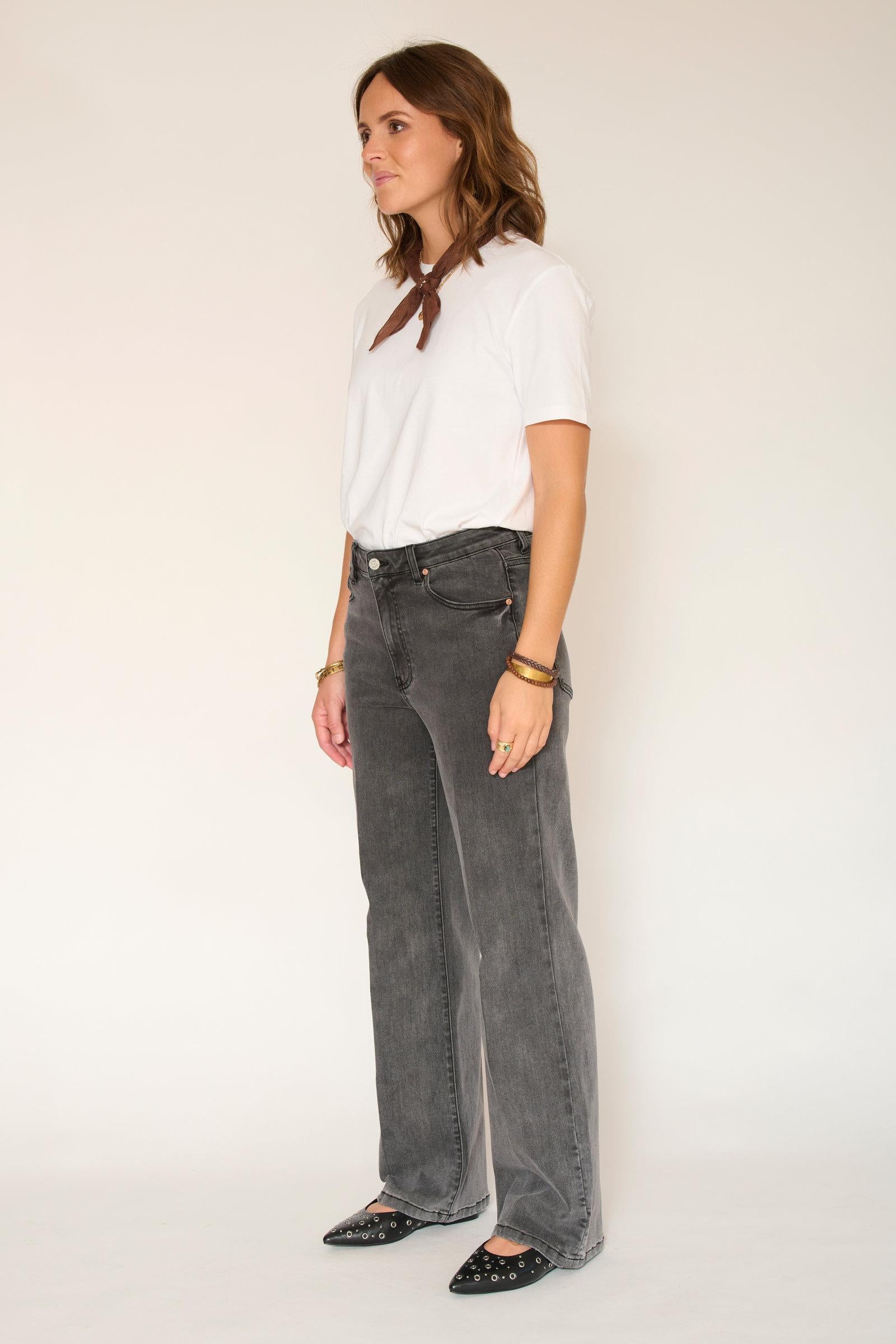 Estos jeans son ideales para combinar con diversos looks, desde casuales hasta elegantes, según los accesorios elegidos. En las imágenes, se realzan con una sencilla camiseta blanca y una bufanda, lo que le da un toque de elegancia al conjunto.