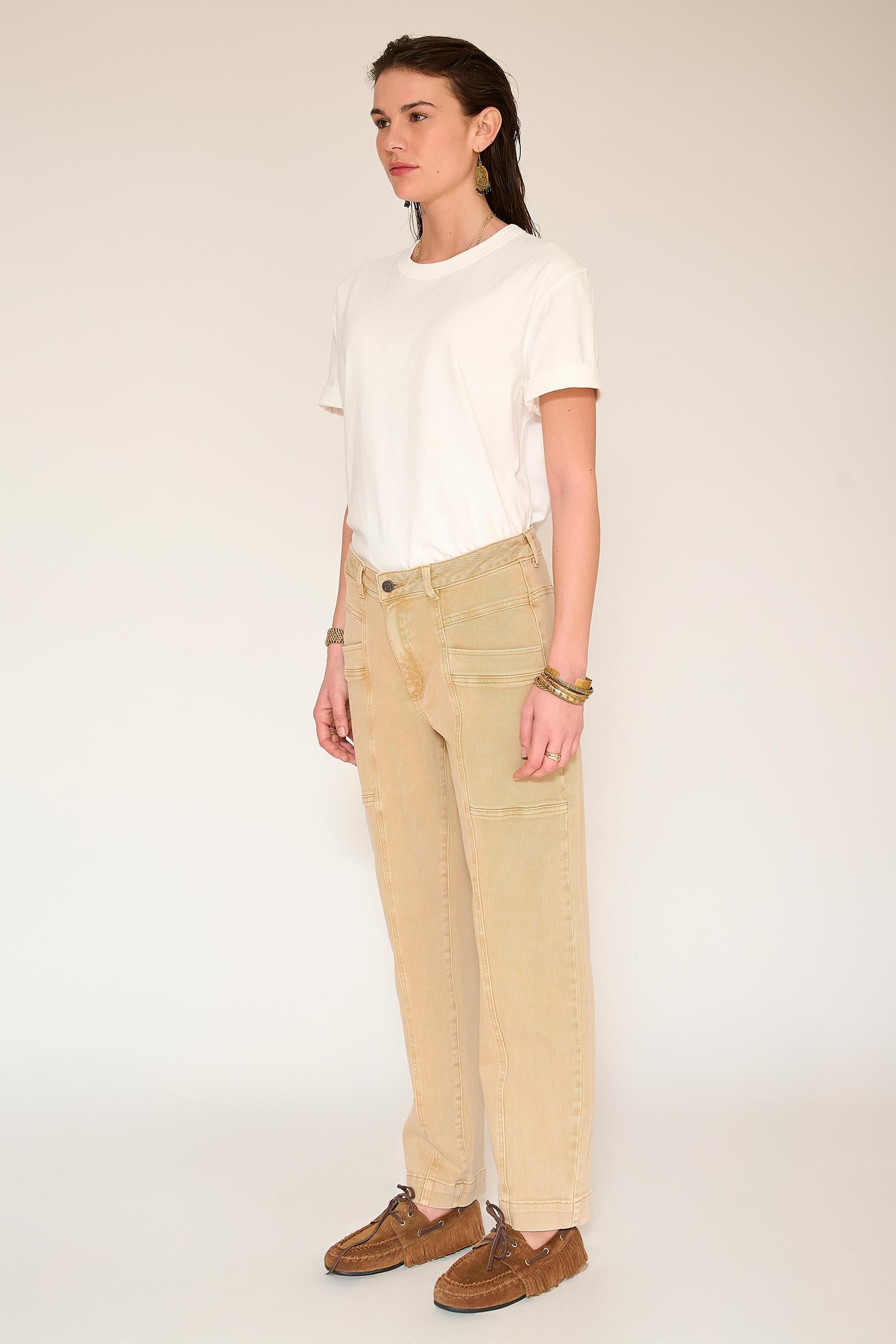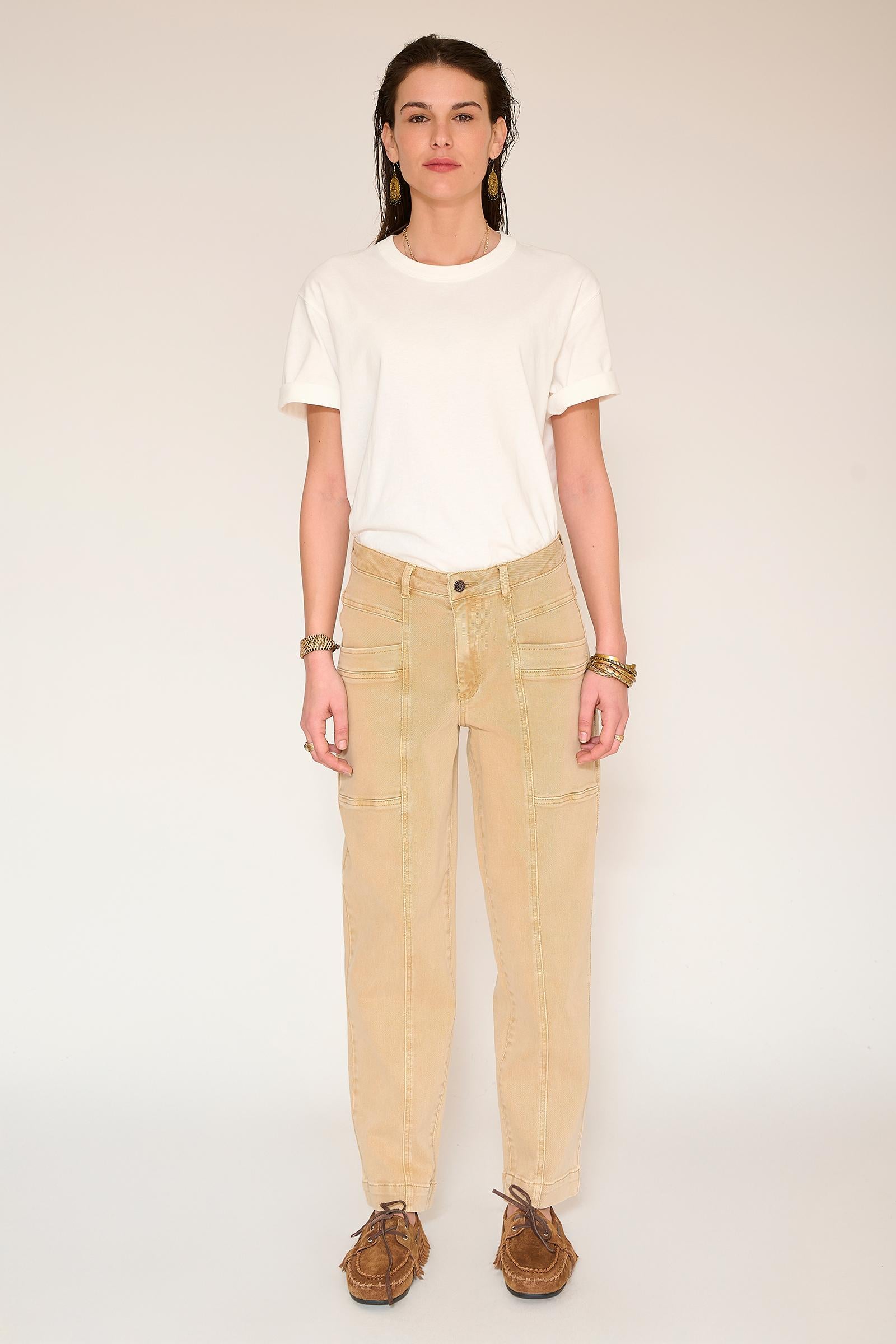 Pantalones rectos y estructurados diseñados para estilizar la figura. Su tono amarillo curry aporta un toque alegre a cualquier armario, mientras que las llamativas costuras y los bolsillos de parche aportan personalidad sin recargar el look. Una prenda que marca tendencia y es fácil de combinar a diario.