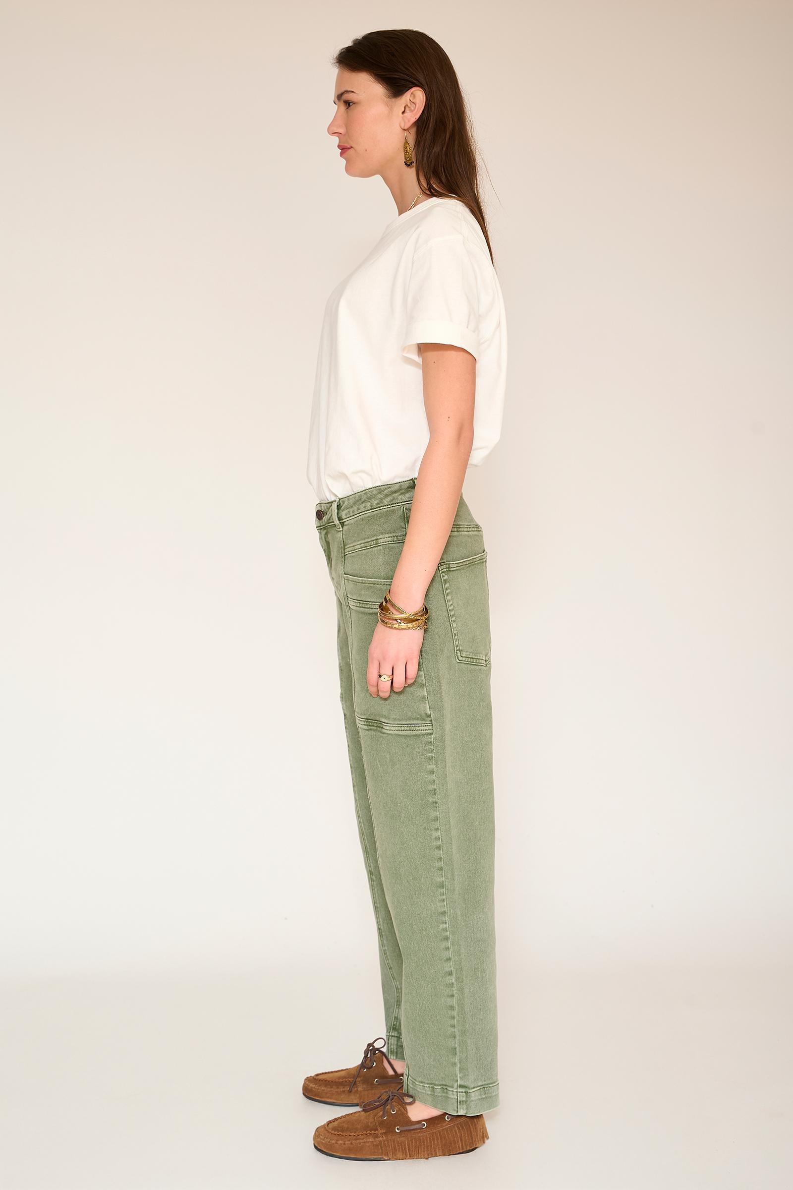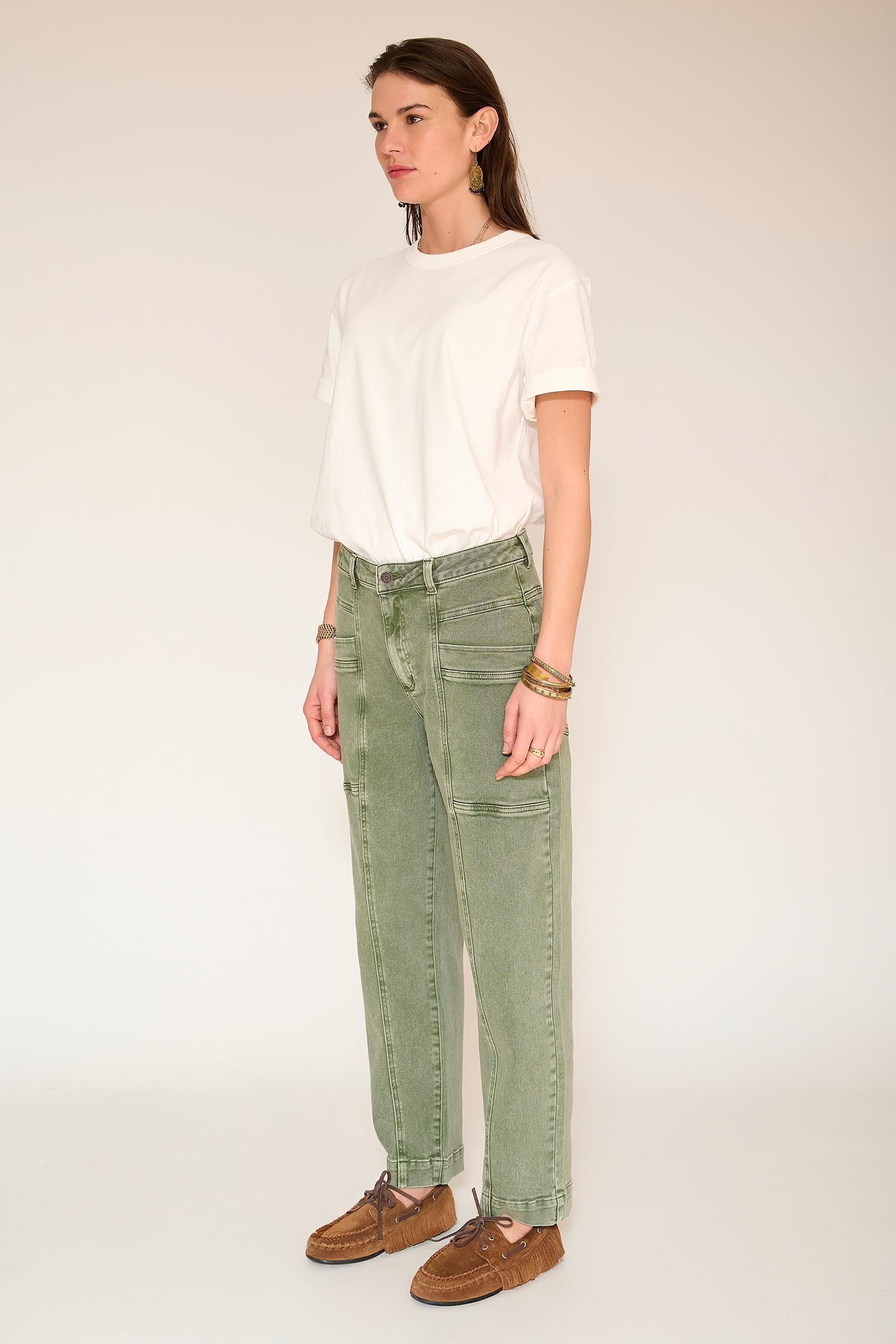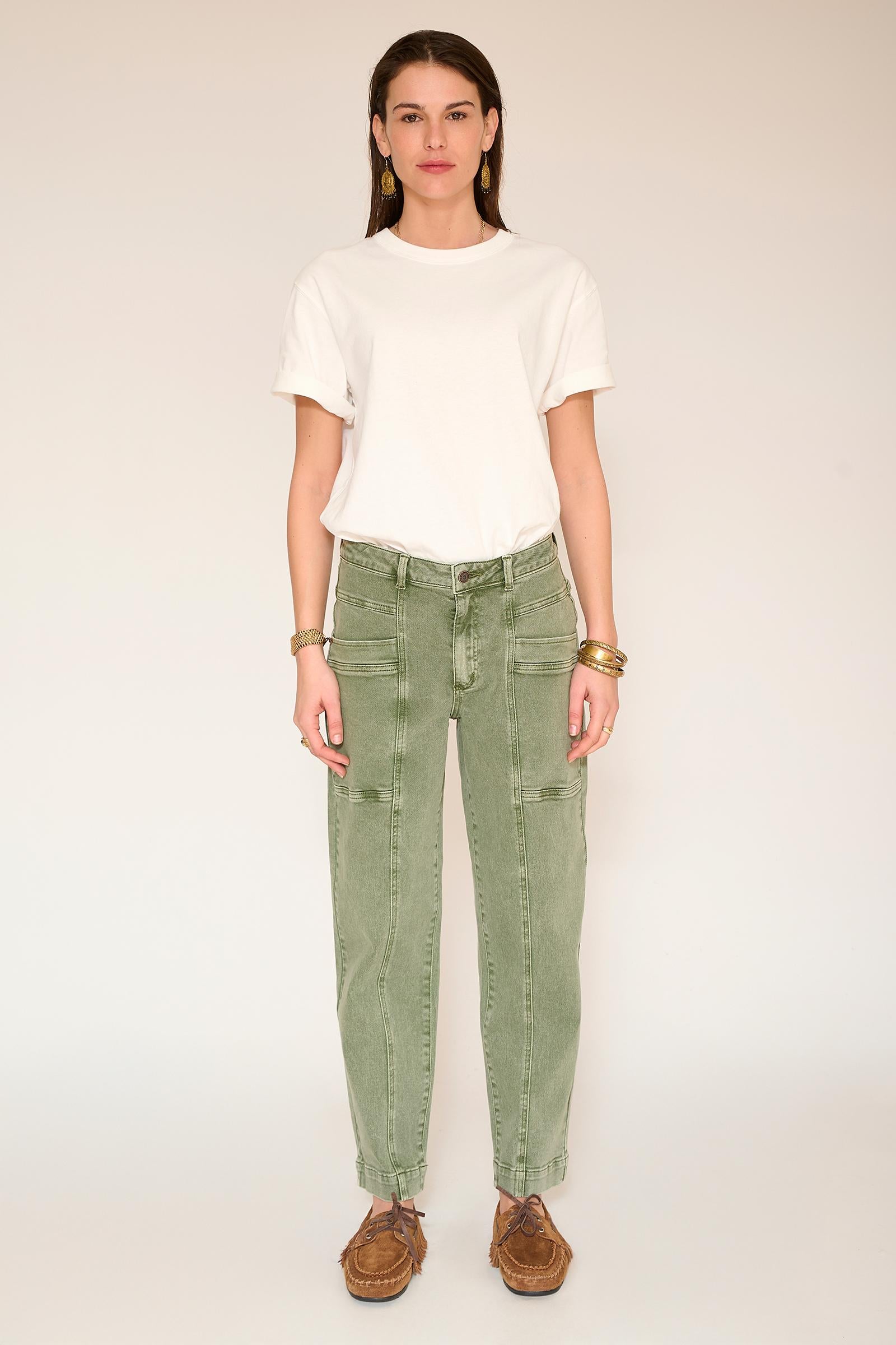 Pantalones rectos y estructurados diseñados para estilizar la figura. Su tono amarillo curry aporta un toque alegre a cualquier armario, mientras que las llamativas costuras y los bolsillos de parche aportan personalidad sin recargar el look. Una prenda que marca tendencia y es fácil de combinar a diario.