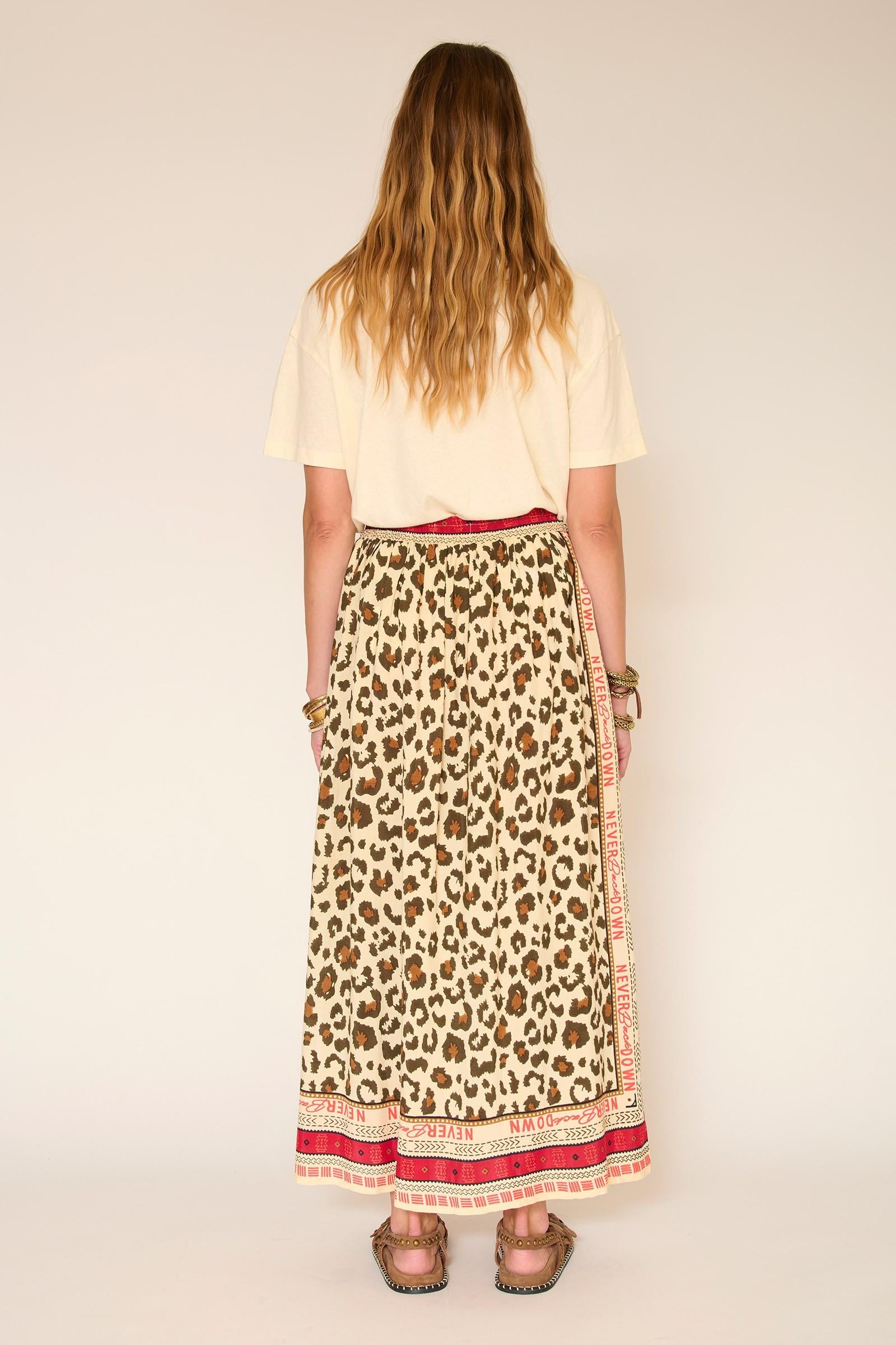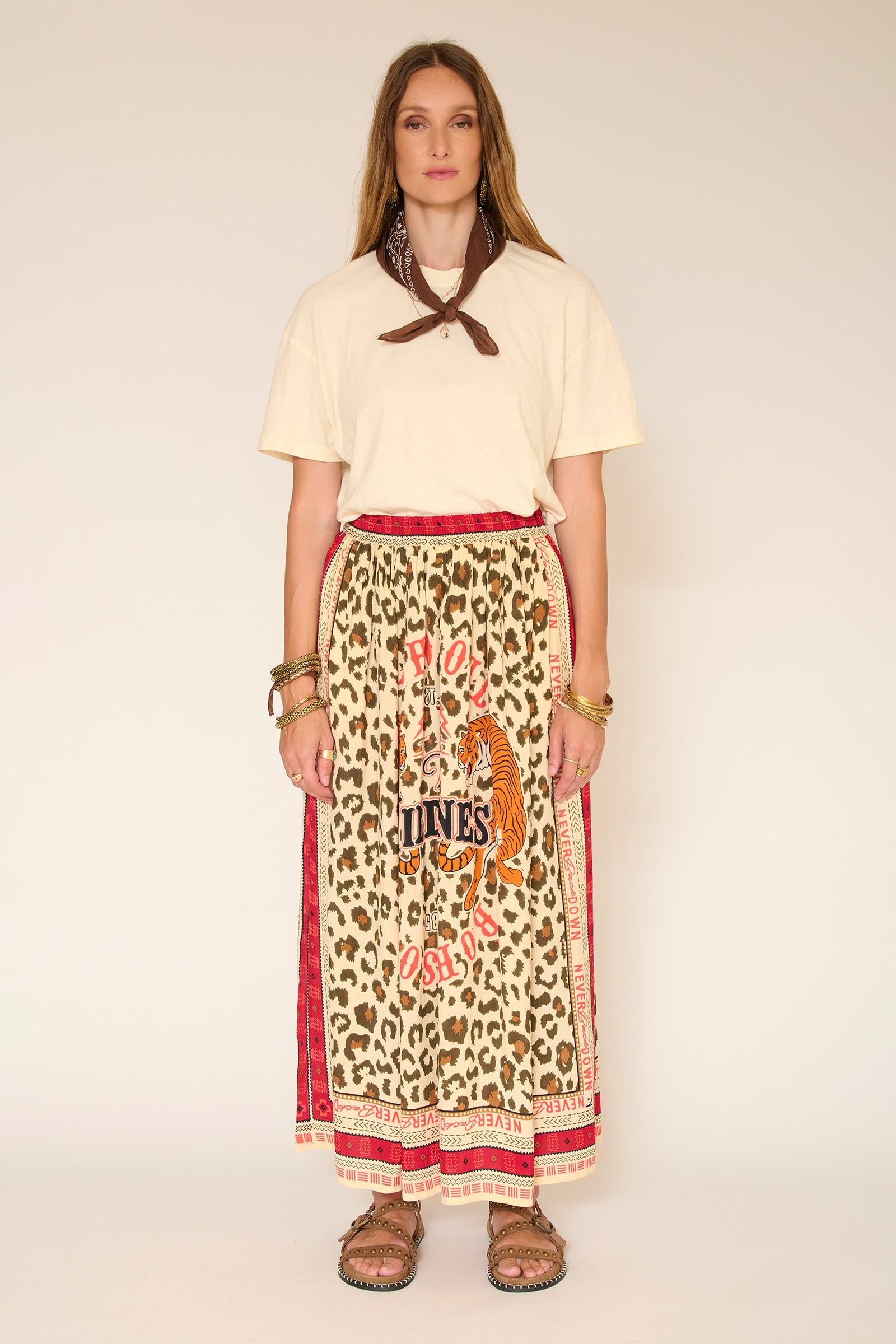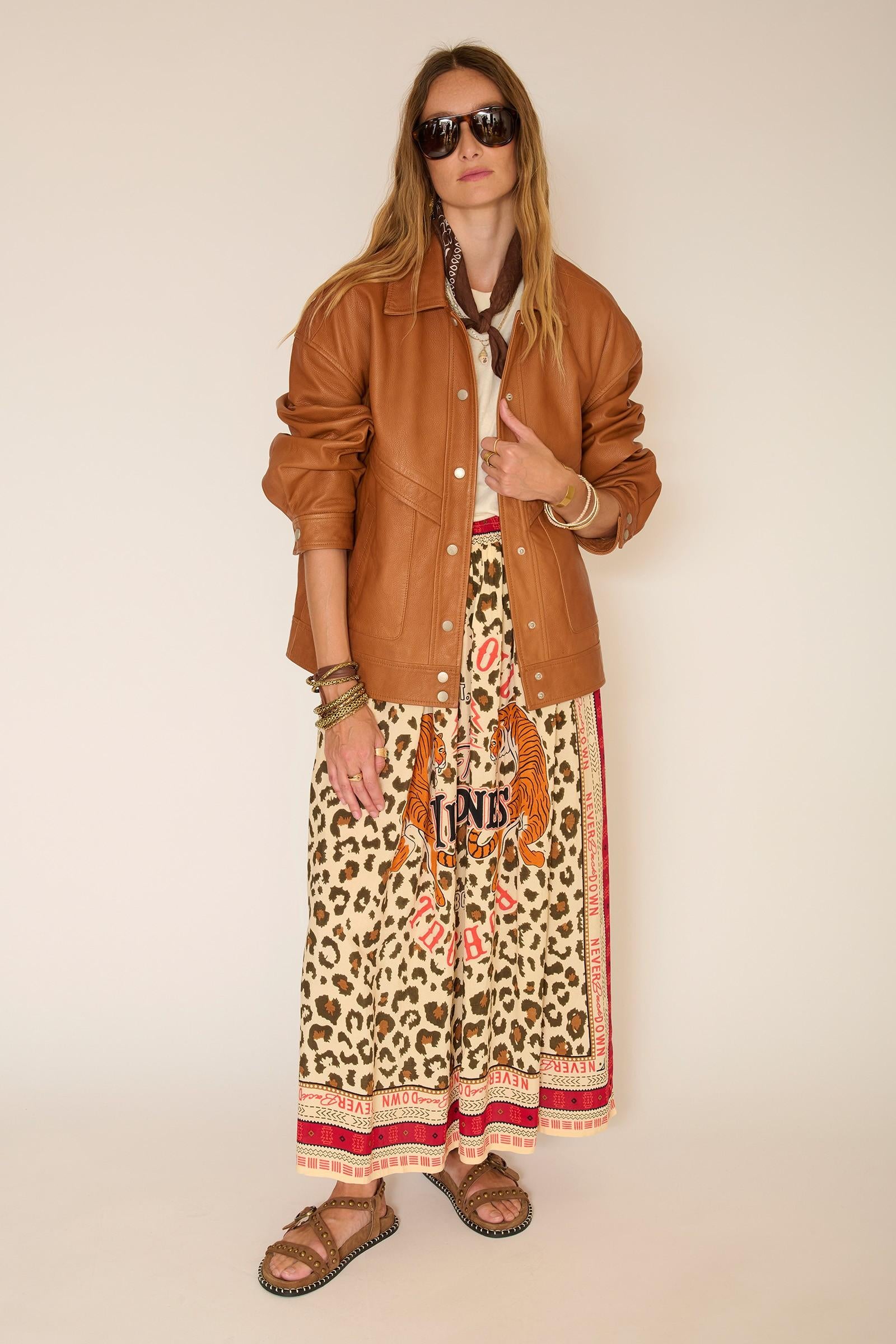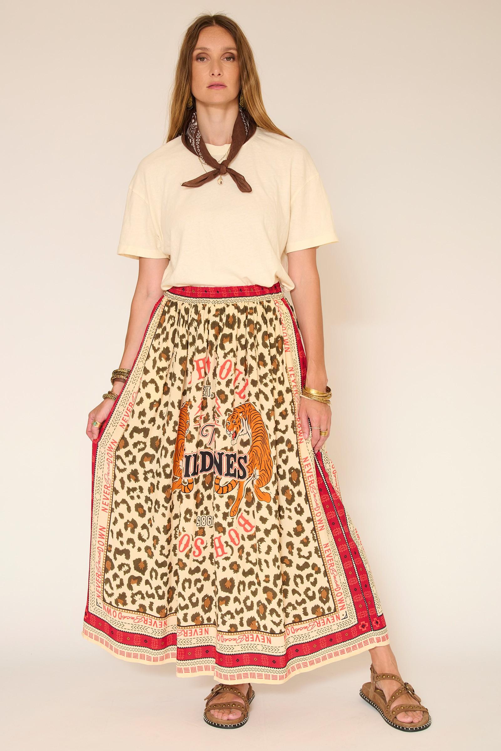 La falda Jaguera es una declaración de estilo a primera vista. El estampado de leopardo, combinado con patrones gráficos y un mensaje central, le da carácter a la silueta y es muy fácil de llevar. Su corte largo y fluido se adapta a tus movimientos y te ofrece una auténtica libertad de estilo; llévala con una camiseta sencilla o una blusa ligera para un look veraniego con total confianza.