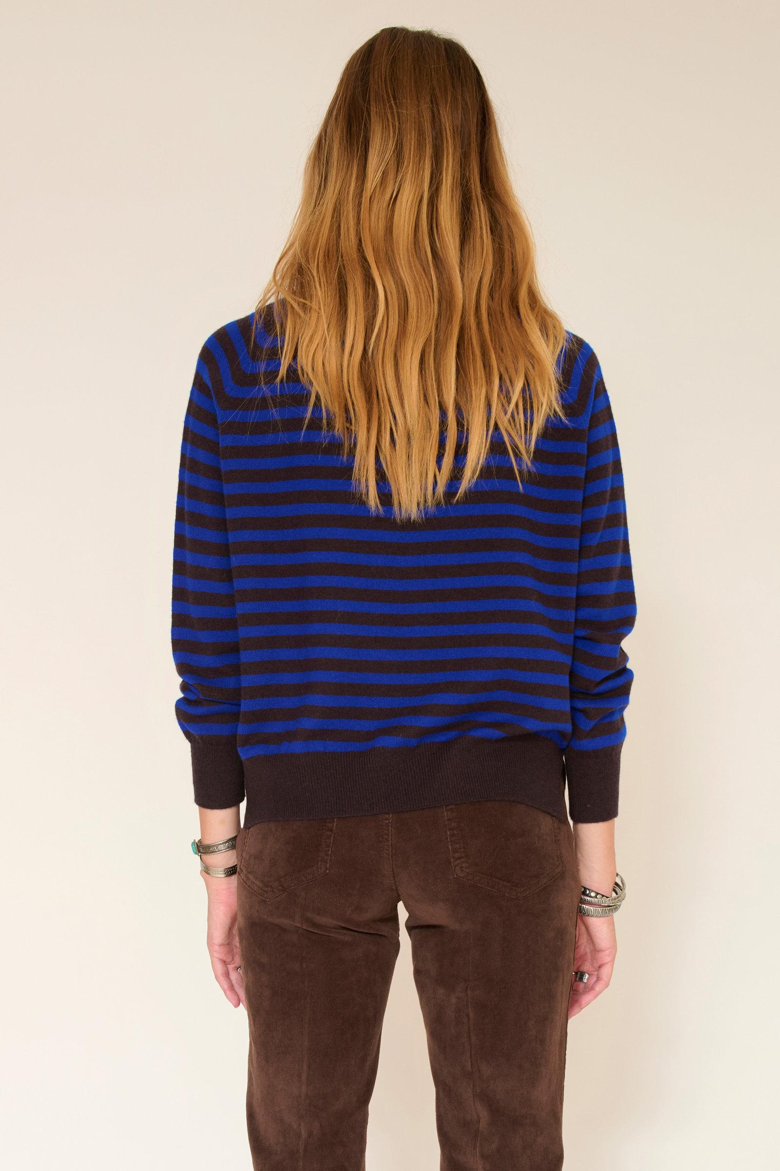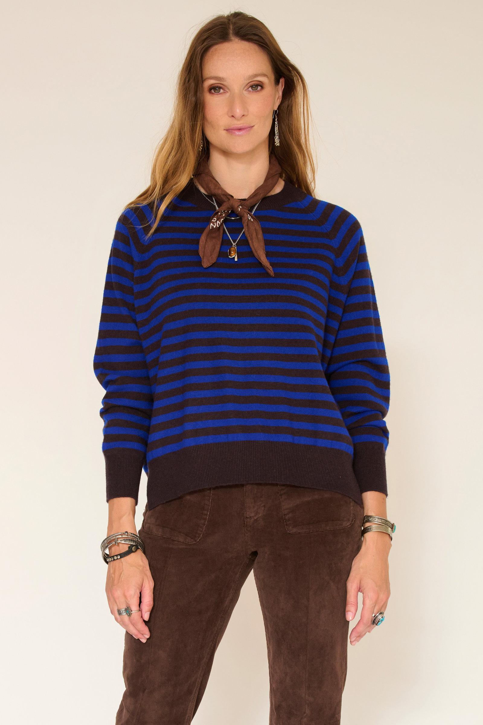 El suéter KALISTE BROWN es elegante e informal, perfecto para el día a día. Su color marrón se realza con un estampado de rayas azul brillante que le da un toque dinámico y discreto.