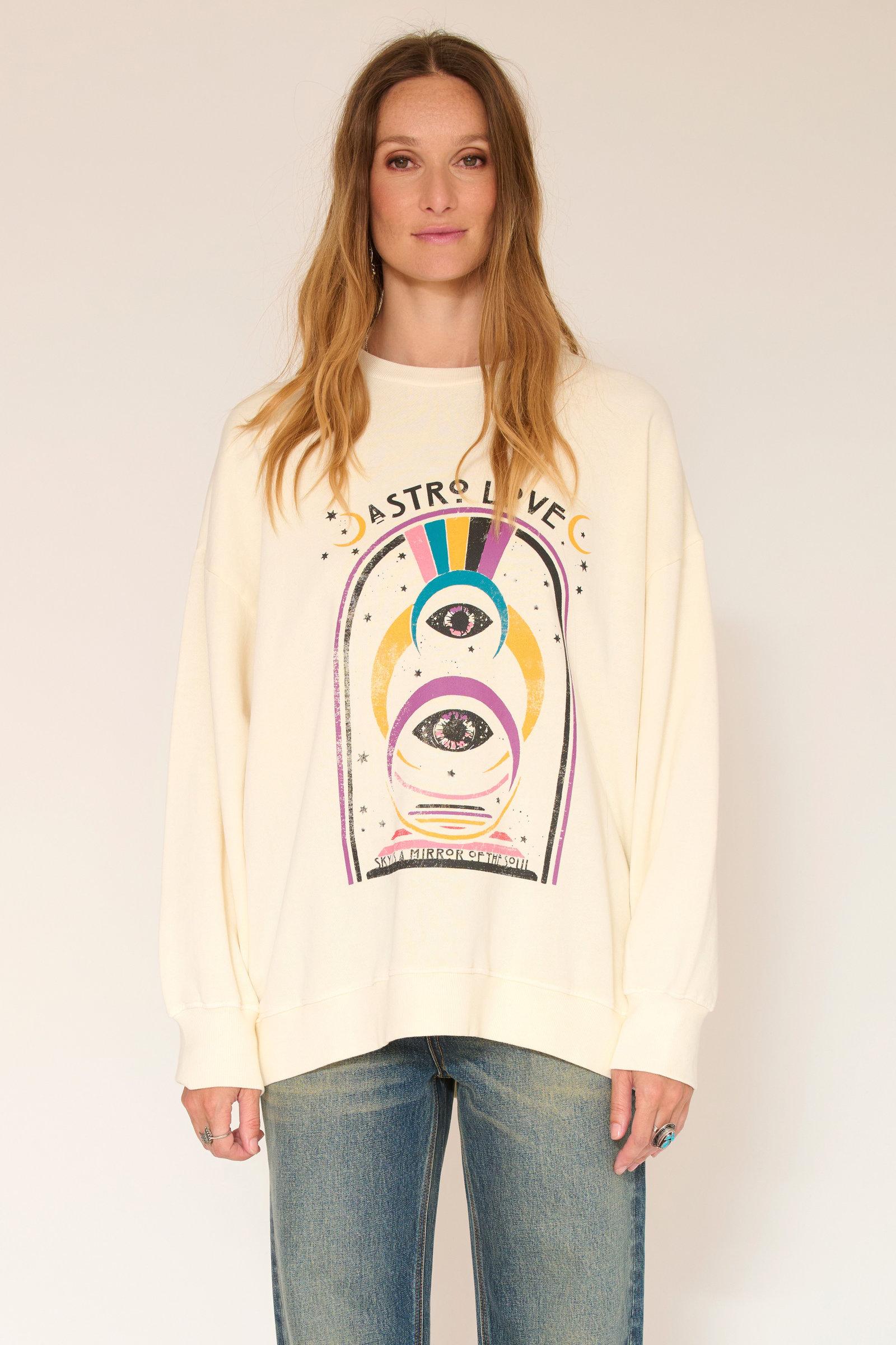 Esta sudadera destaca por su diseño artístico , con un colorido estampado gráfico que incluye elementos como ojos y arcoíris. Este detalle único le da un toque moderno y creativo a tu atuendo.
