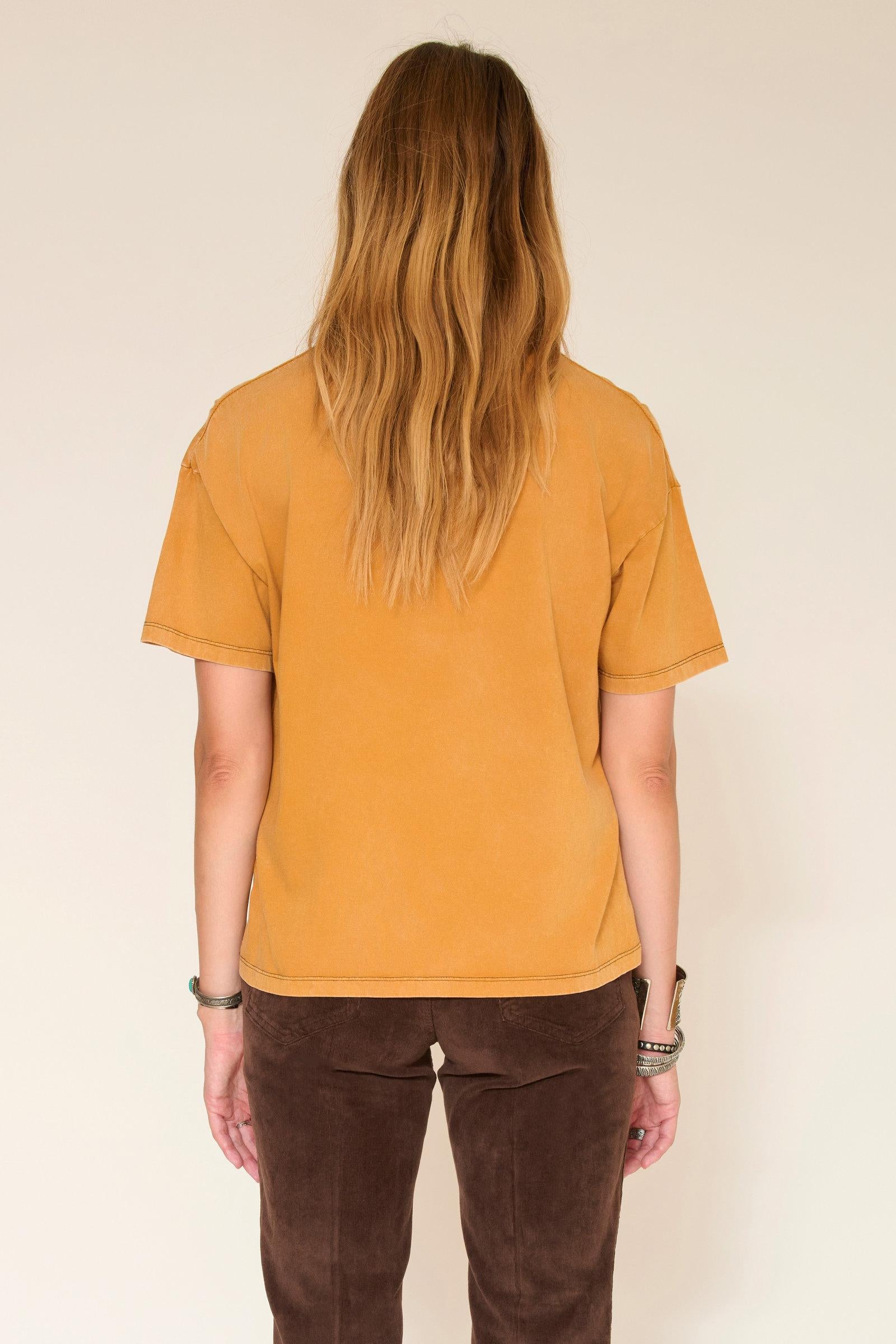 La camiseta TERRAZ DOORS HONEY destaca por su color miel , aportando una calidez y un brillo únicos a tu look. Su diseño presenta un estampado gráfico negro en la parte delantera, que representa una figura icónica y le da un estilo vintage y artístico.