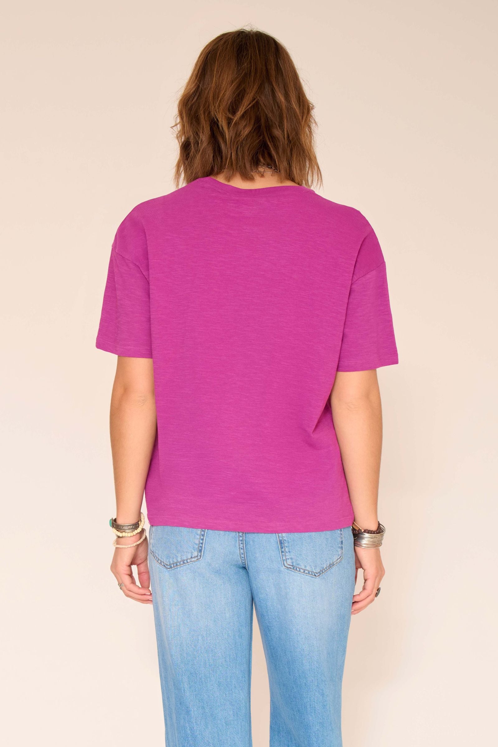 Con su corte recto , mangas cortas y cuello redondo , esta camiseta garantiza una silueta relajada que se adapta a diversos estilos. Su vibrante color morado atrae todas las miradas y aporta un toque de frescura a cualquier look.