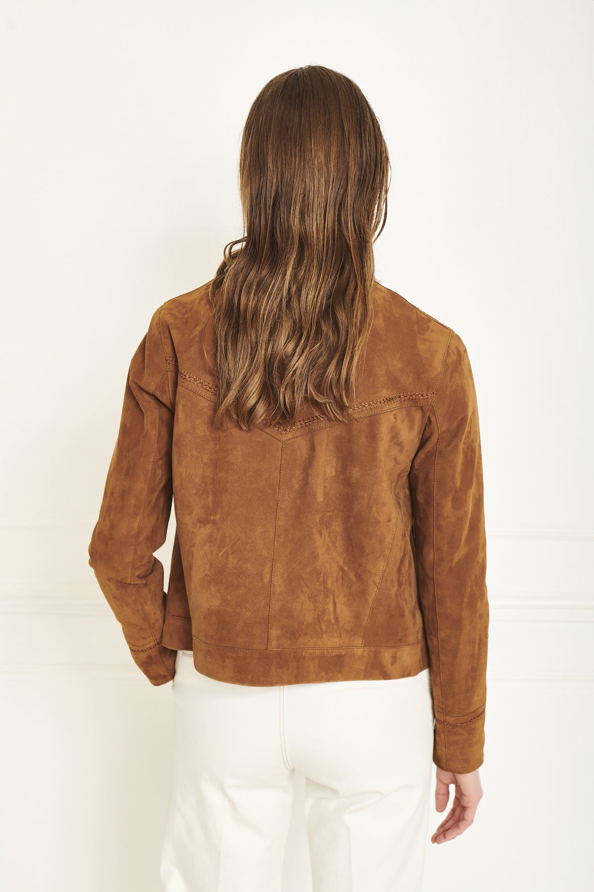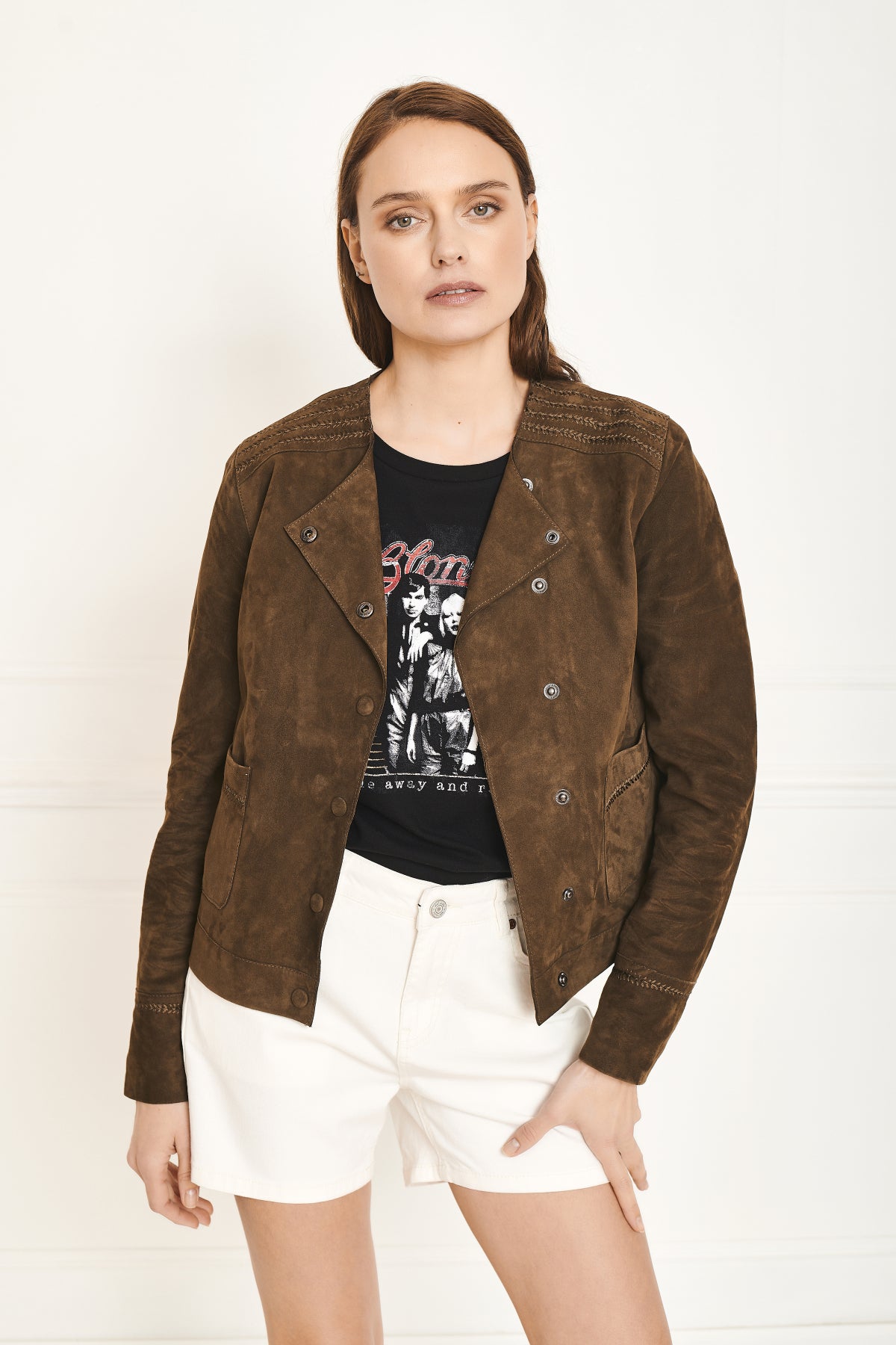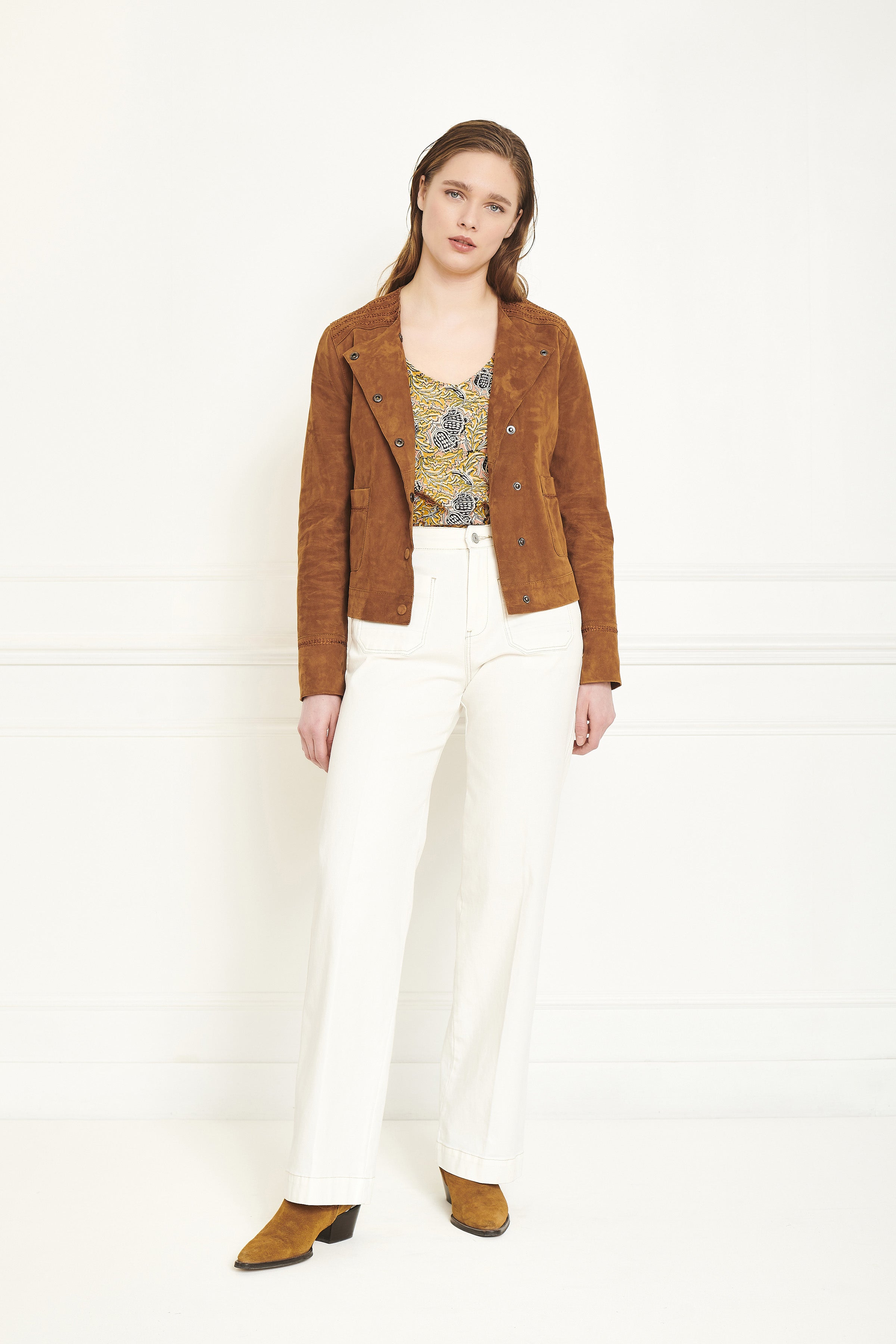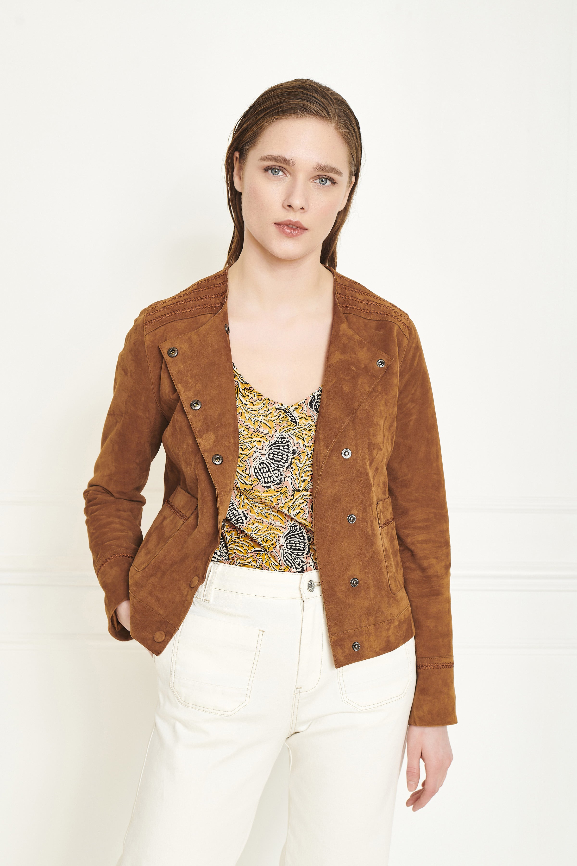 Cazadora de piel ante caprina con cierre asimétrico en la parte delantera con pequeños broches revestidos en piel tono sobre tono. Corte en los hombros con bordado tono sobre tono. Dos pequeños bolsillos de parche.