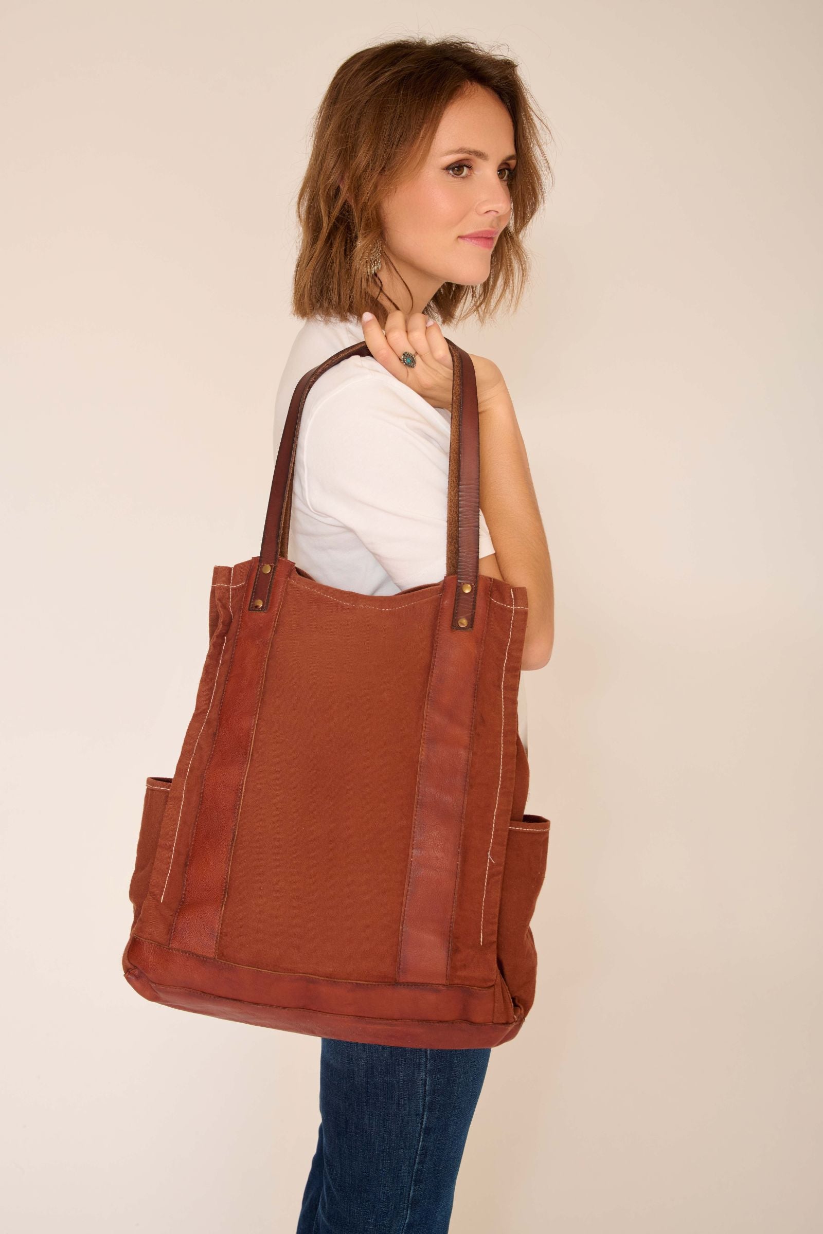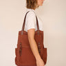 Avec sa forme rectangulaire et ses côtés légèrement évasés, le sac offre un espace de rangement généreux, parfait pour transporter vos essentiels. Sa couleur Nuts lui confère une allure chaleureuse et tendance, tandis que les poignées en cuir assurent un confort optimal lors du transport.