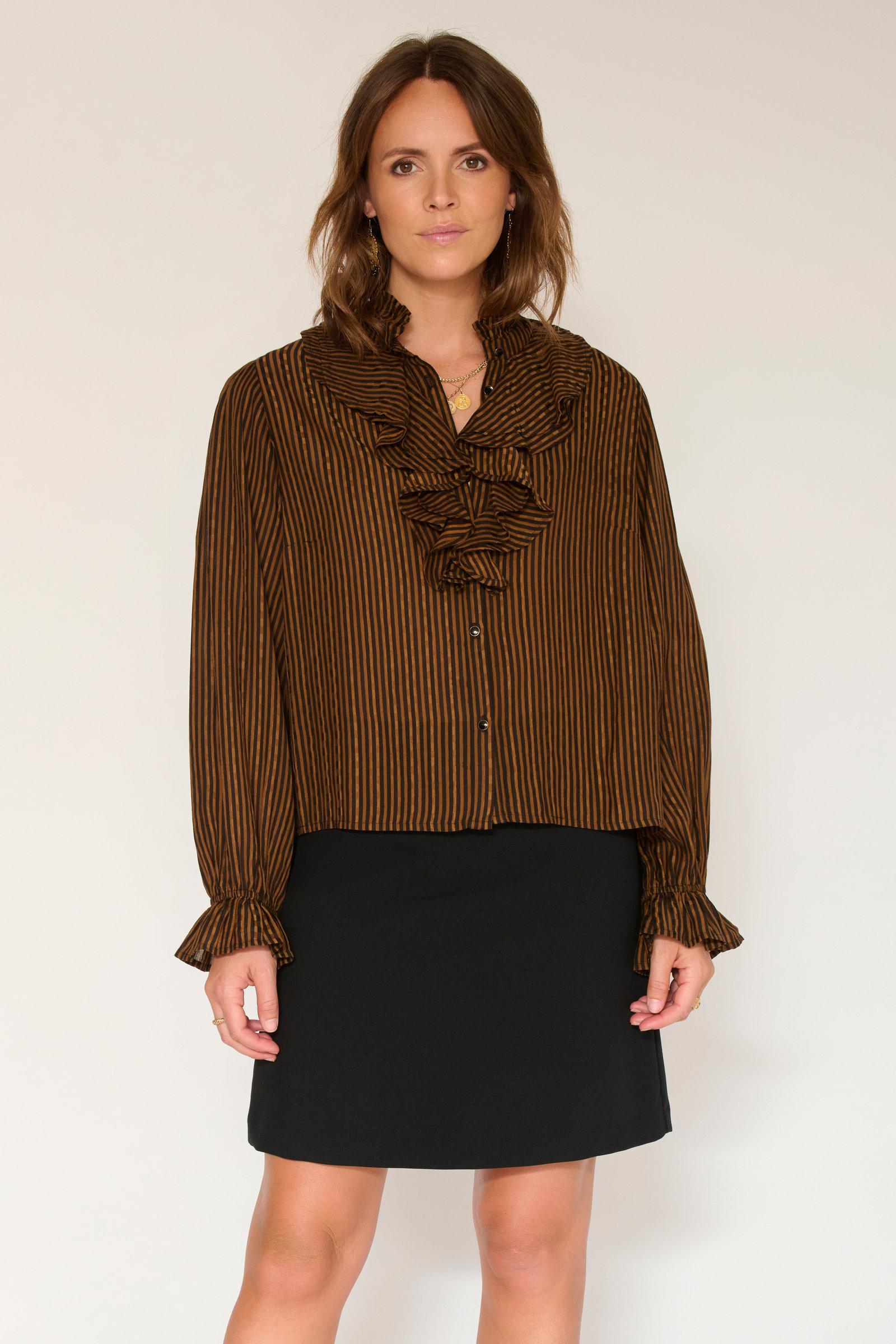 Sa couleur marron, ornée de rayures verticales, crée un effet visuel dynamique et moderne. Le col tunisien, agrémenté d'un détail froncé, ajoute une touche de féminité et de chic. Les manches longues sont dotées de volants au niveau des poignets, apportant une finition délicate et raffinée.